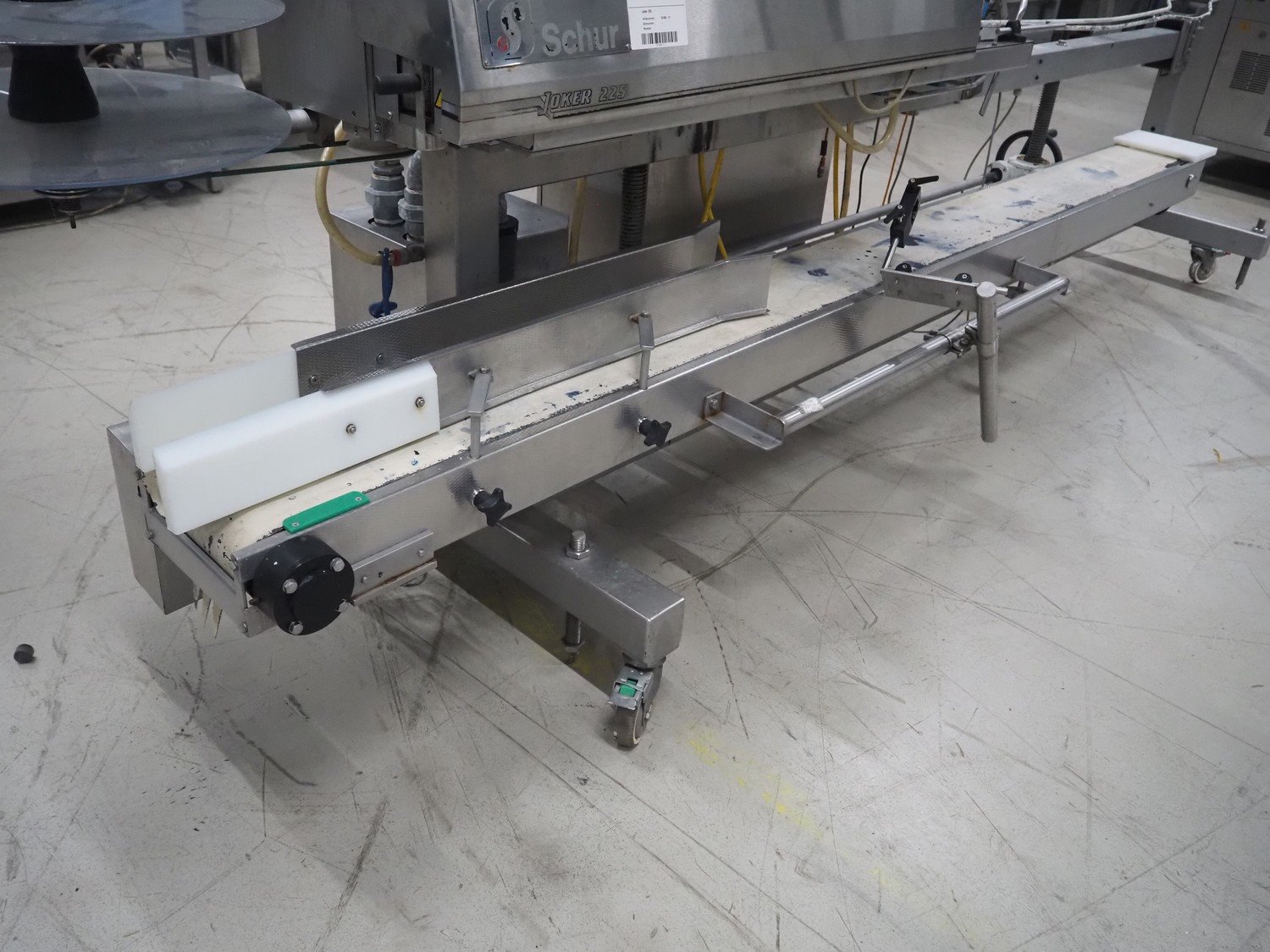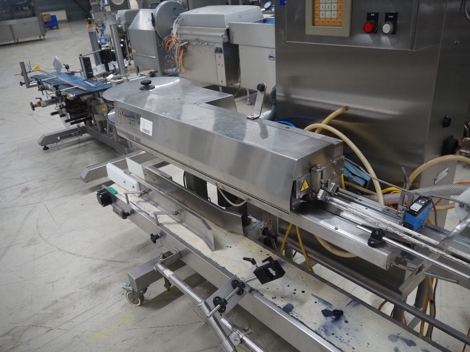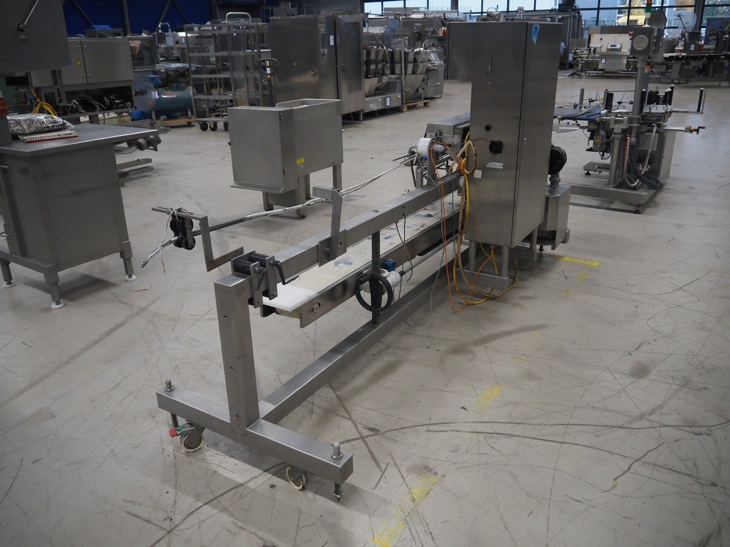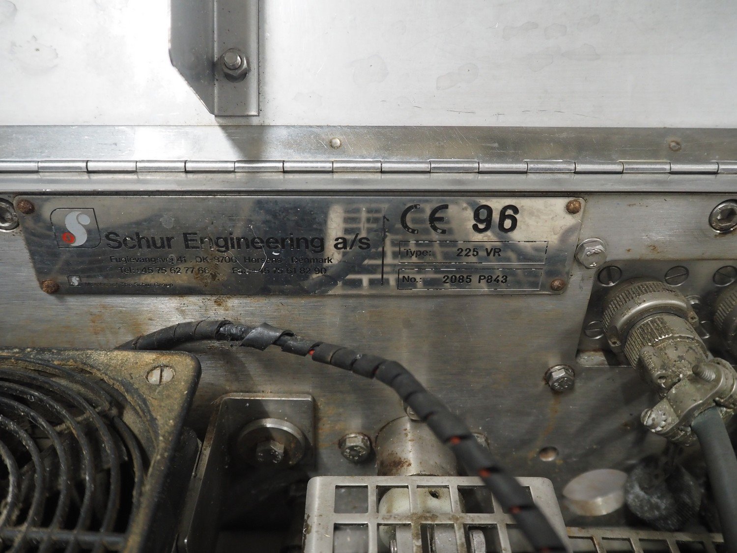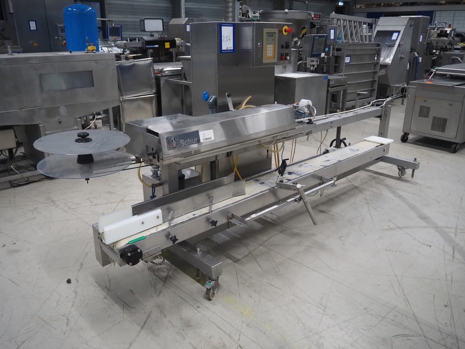 Schur mobile continuous bag sealer, type: Joker 225, 400 V, 3 Ph, 50 Hz, 16/9 A, plastic belt, belt width: 200 mm, total dimensions: 3700 mm x 1000 mm x 1600 mm.