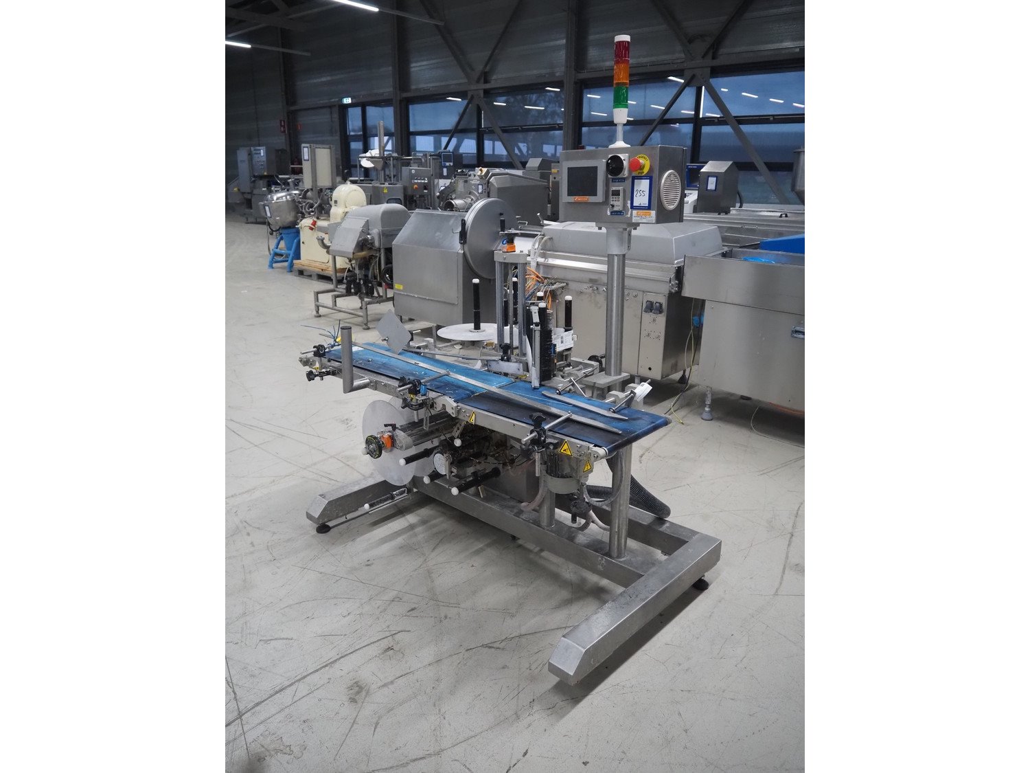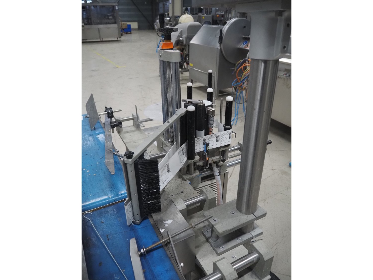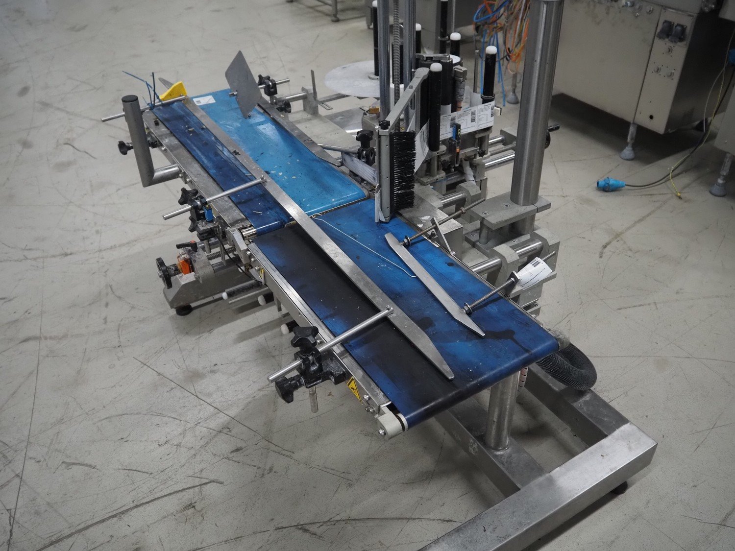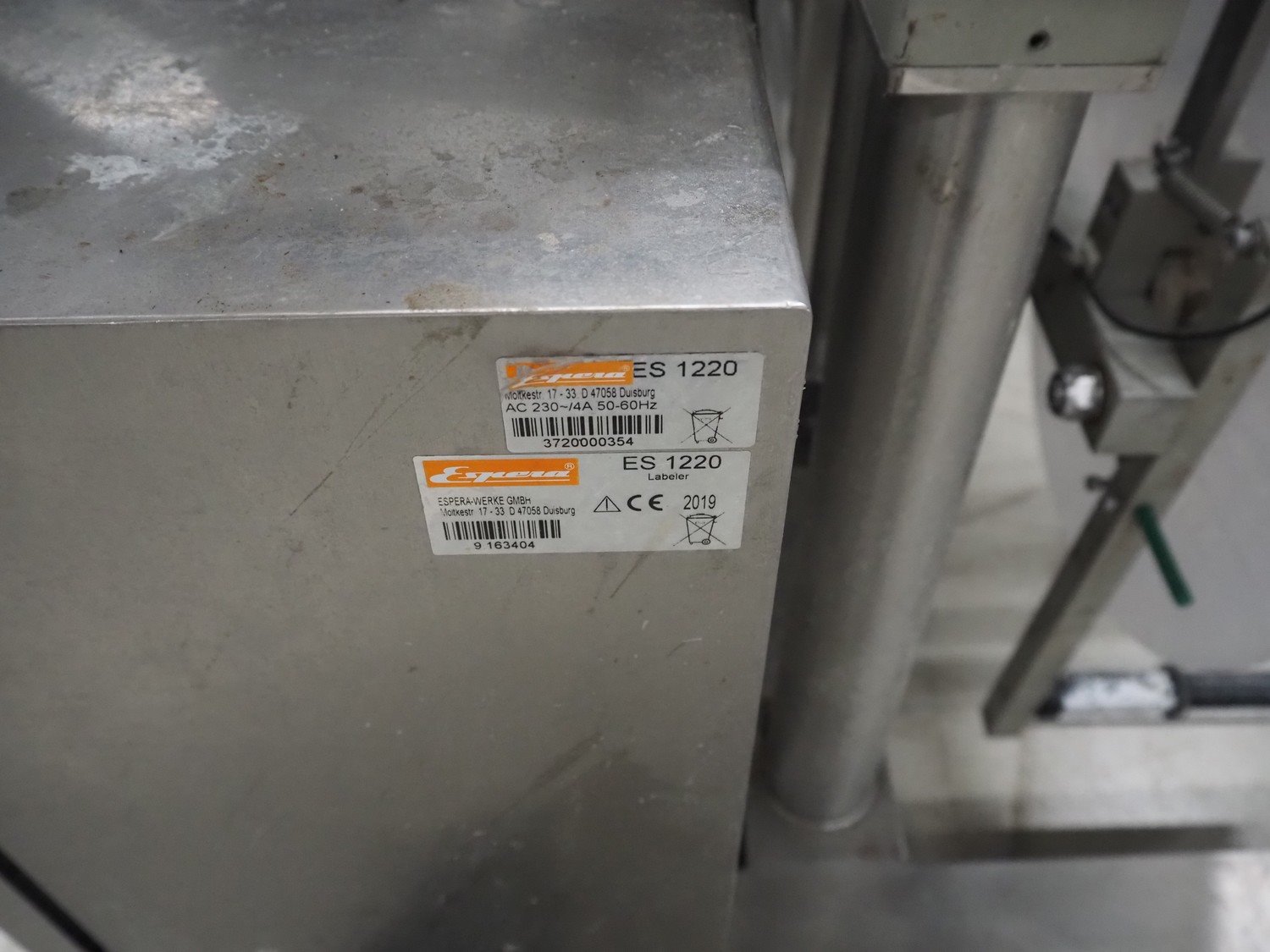 Espera label printer with bottom and side labeller, model: ES 1220, plastic belt, belt width: 300 mm, total dimensions: 1650 mm x 1350 mm x 1900 mm.