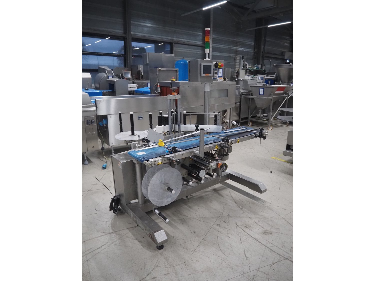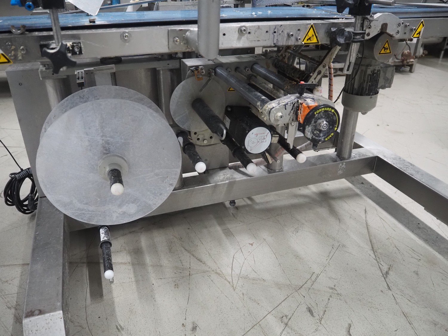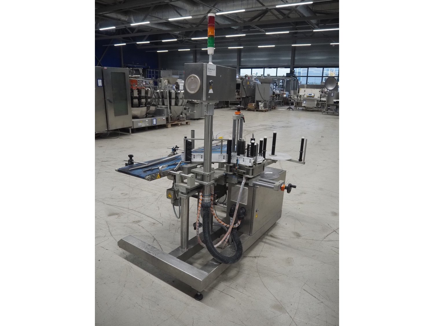 Espera label printer with bottom and side labeller, model: ES 1220, plastic belt, belt width: 300 mm, total dimensions: 1650 mm x 1350 mm x 1900 mm.
