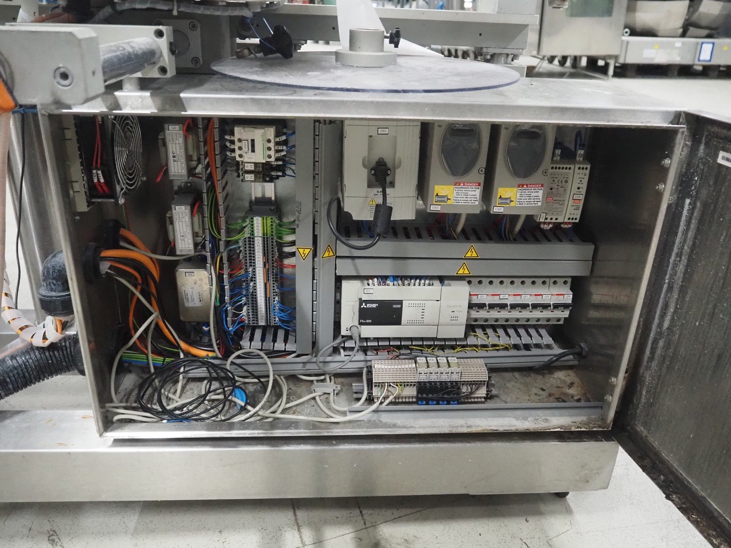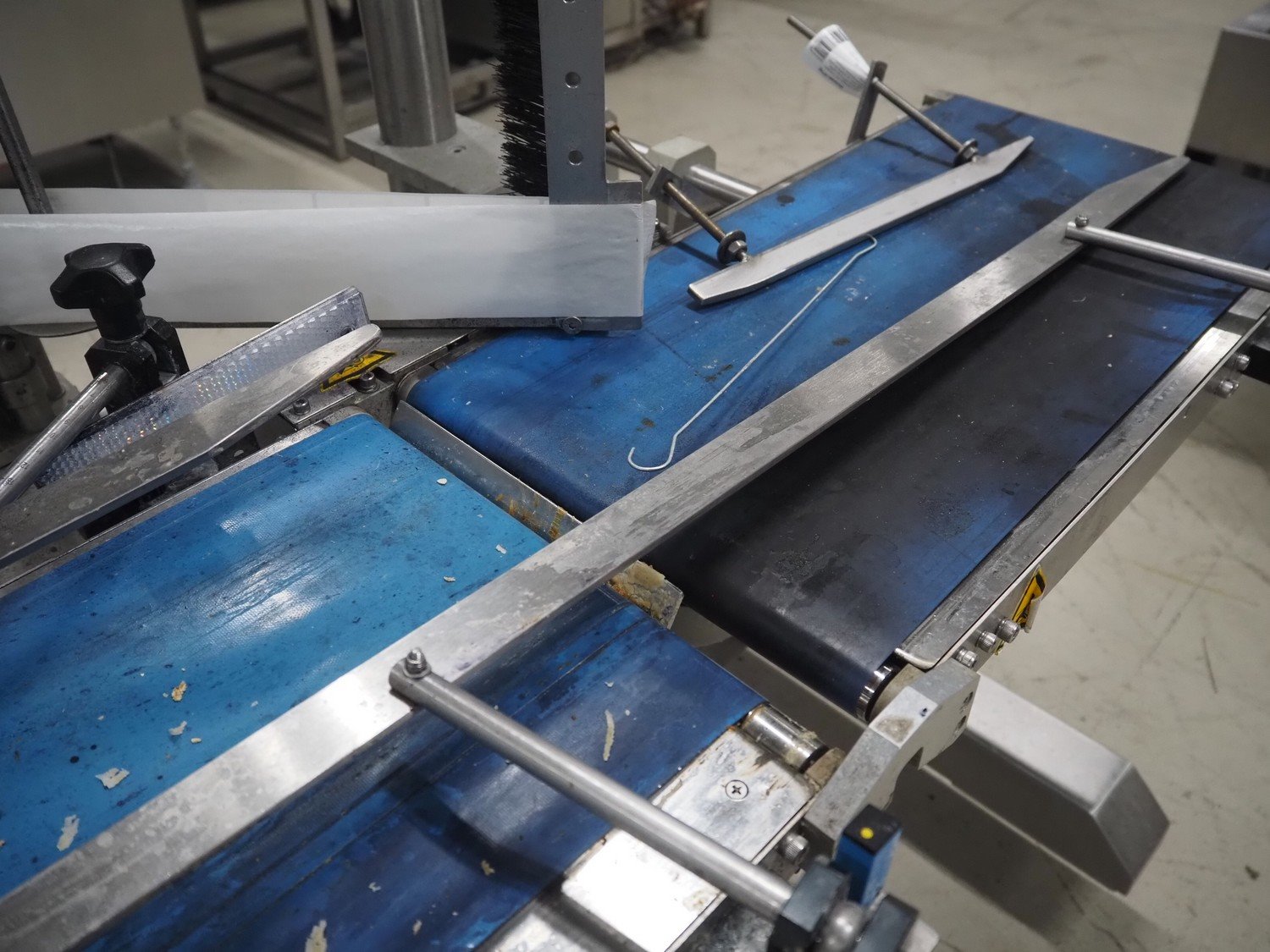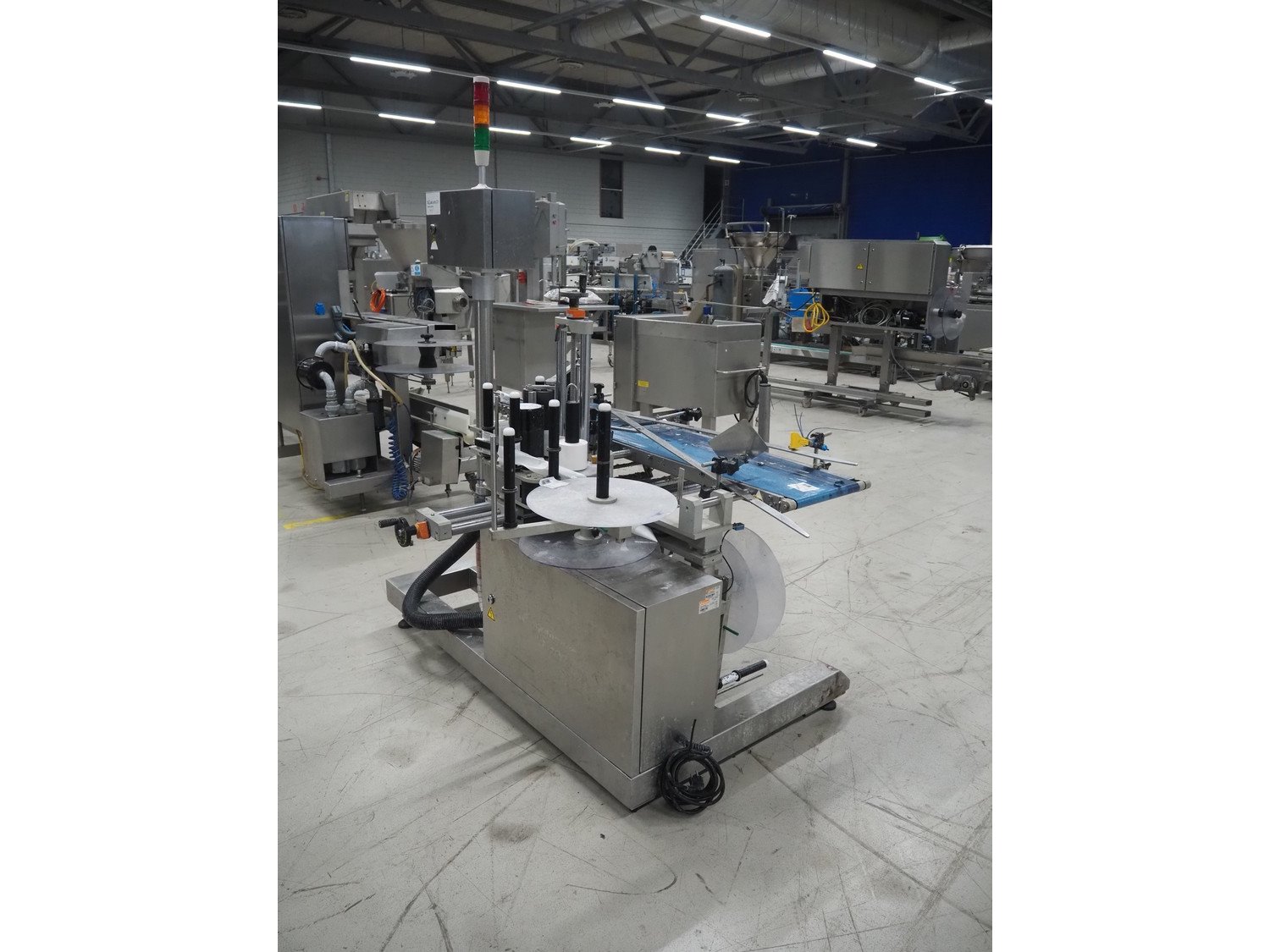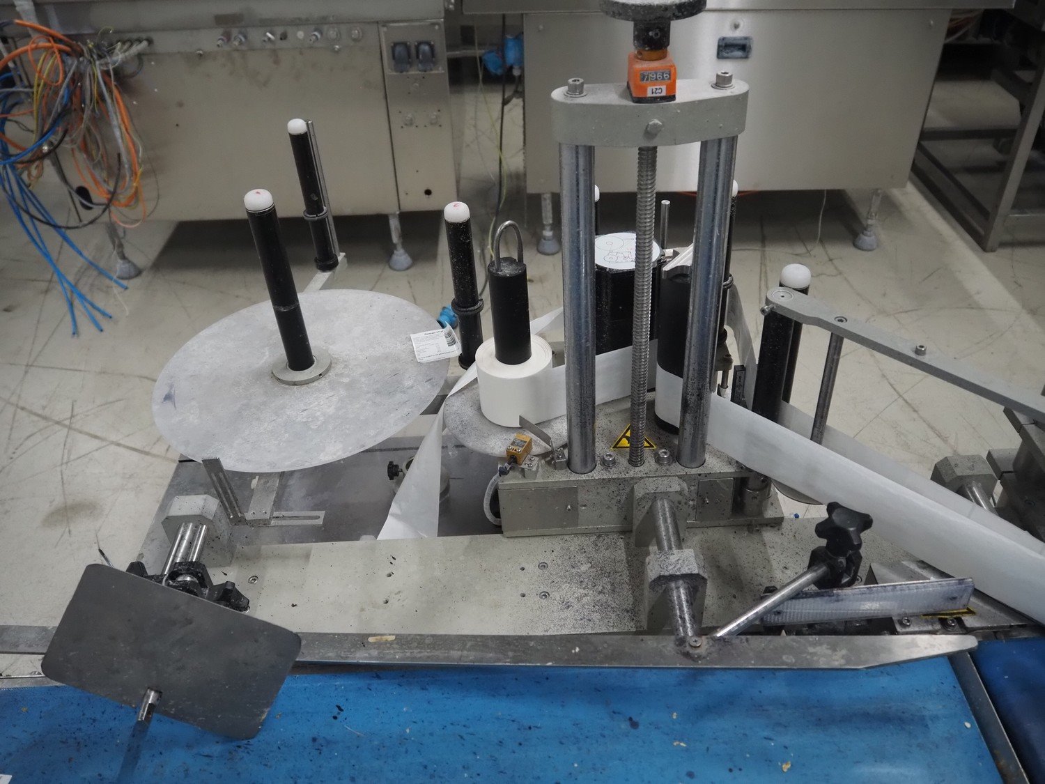 Espera label printer with bottom and side labeller, model: ES 1220, plastic belt, belt width: 300 mm, total dimensions: 1650 mm x 1350 mm x 1900 mm.