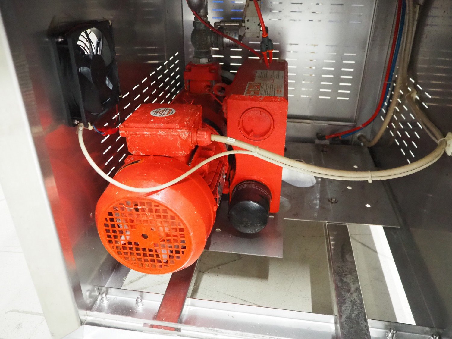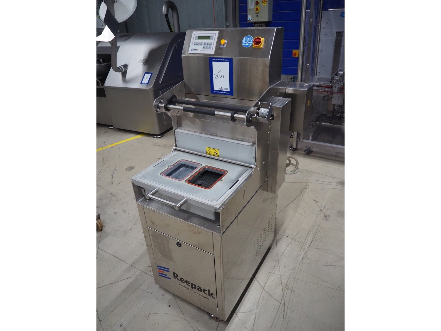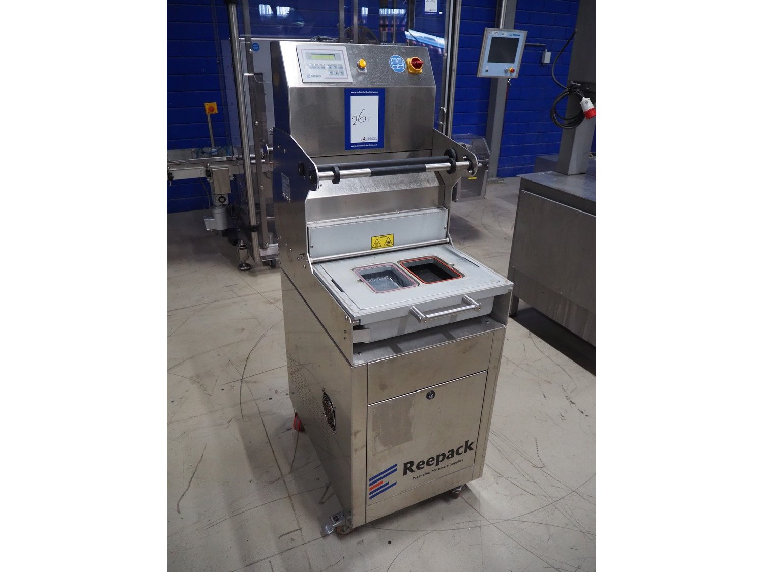 Reepack mobile traysealer, model: Reetray 25SKIN, serial number: 3812045, year of construction: 2013, 400 V, 3 Ph, 50 Hz, 16 A, dye: (2x) 175 mm x 130 mm, Busch vacuum pump, type: RA 0040 F 4S3, capacity: 40 m³ per hour, total dimensions: 1050 mm x 700 mm x 1600 mm.