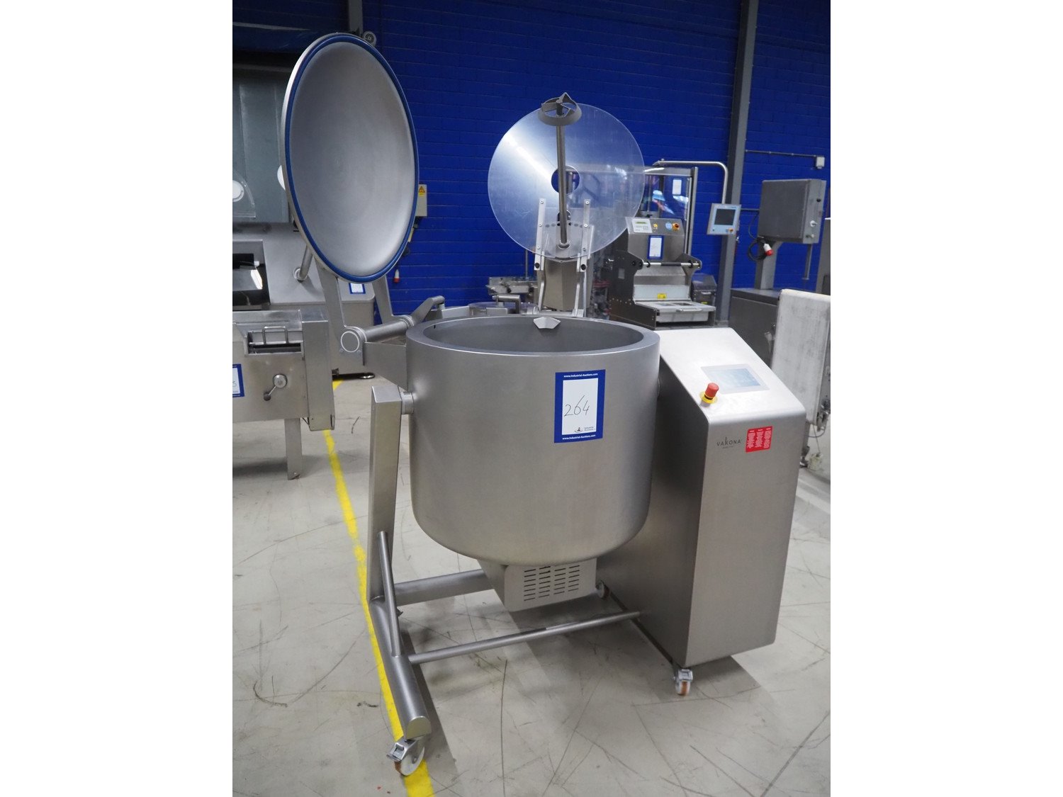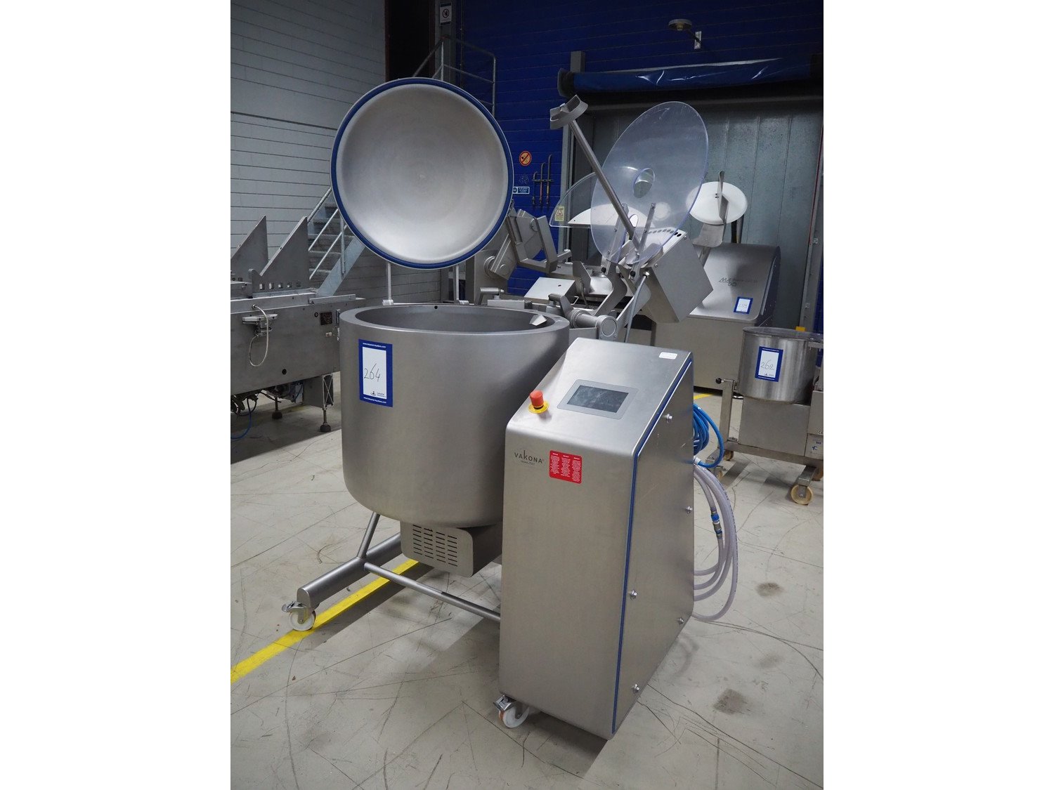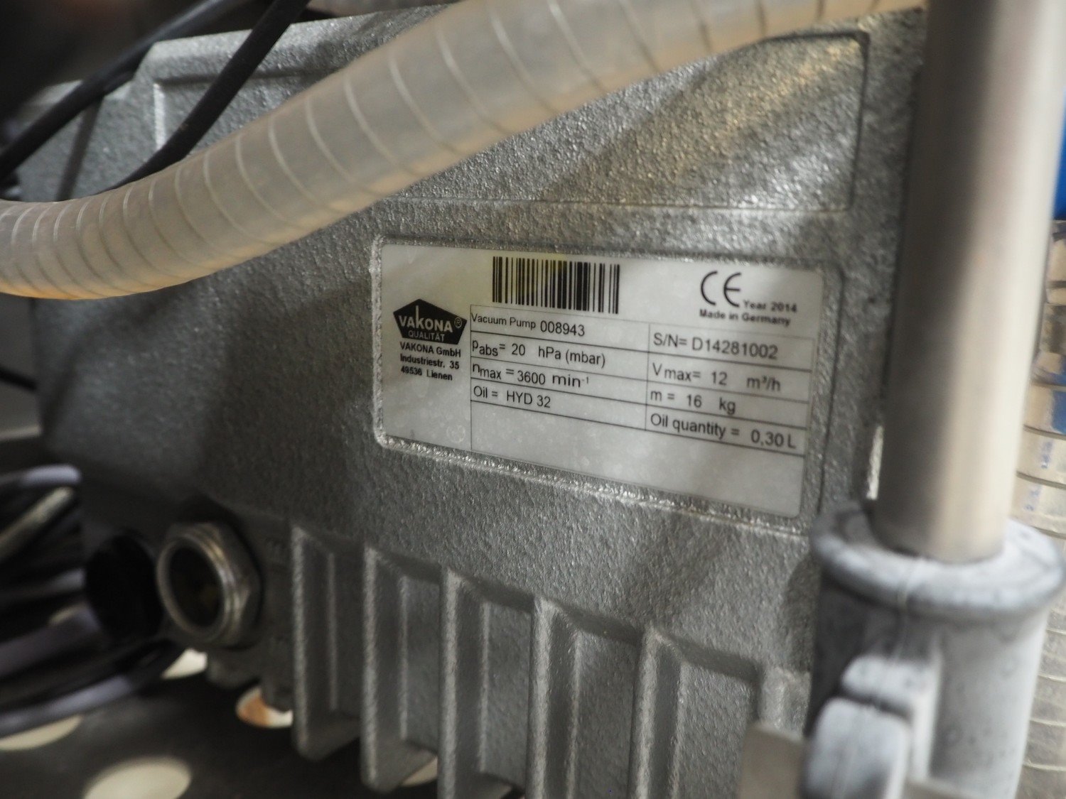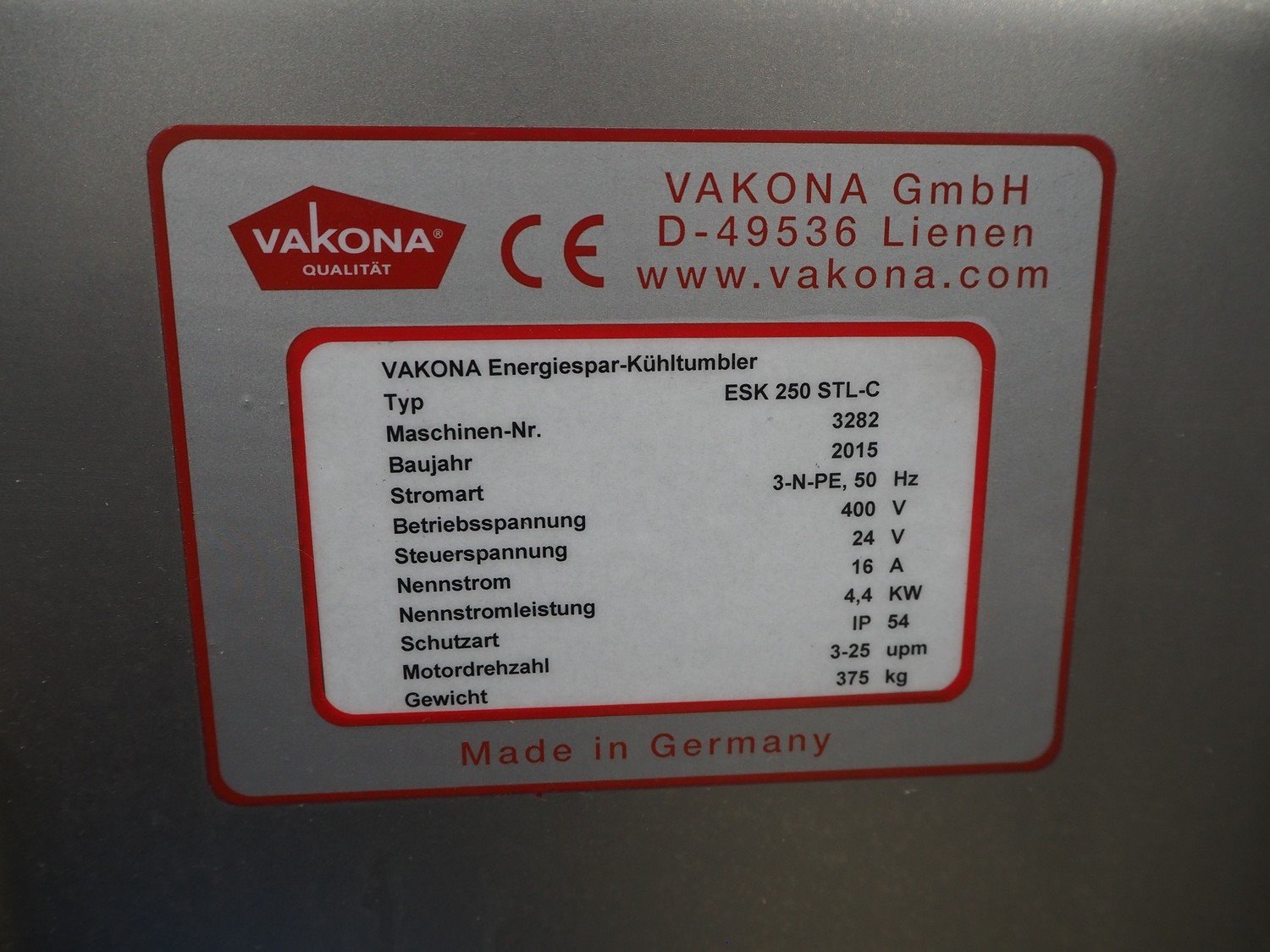 Vakona mobile cooled vacuum tumbler, type: ESK 250 STL-C, machine number: 3282, year of construction: 2015, 400 V, 3 Ph, 50 Hz, 16 A, 4.4 kW, 375 kg, Vakona vacuum pump, type: 008943, serial number: D14281002, year of construction: 2014, capacity: 12 m³ per hour, volume tub: 250 liter, dimensions: 1500 mm x 1500 mm x 2100 mm.