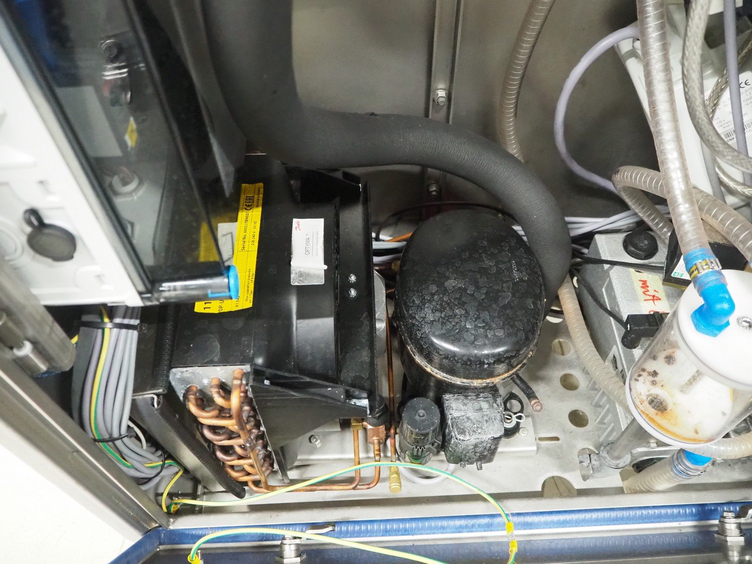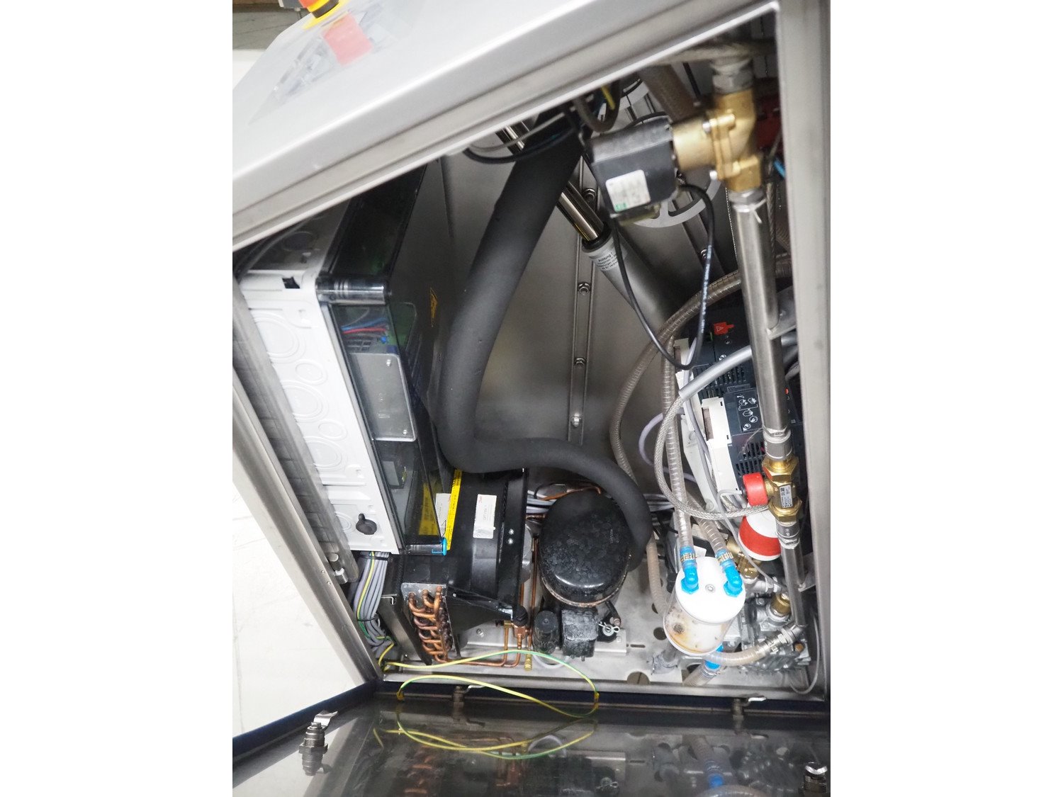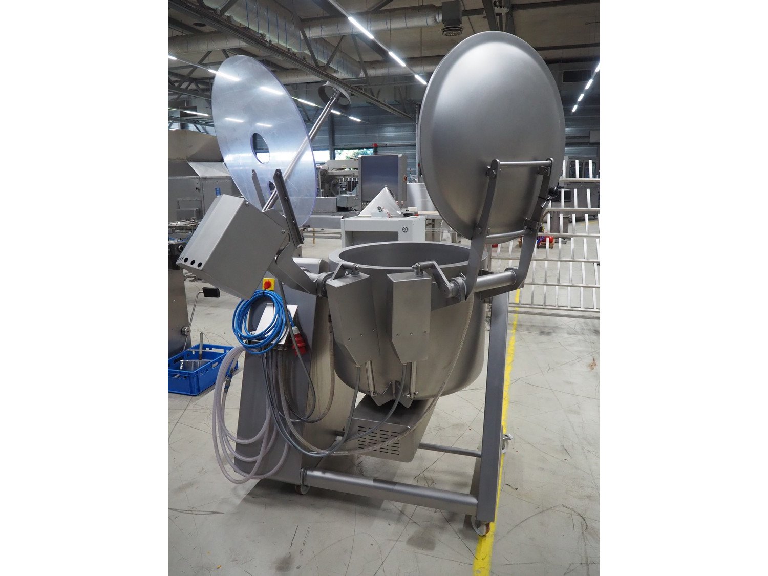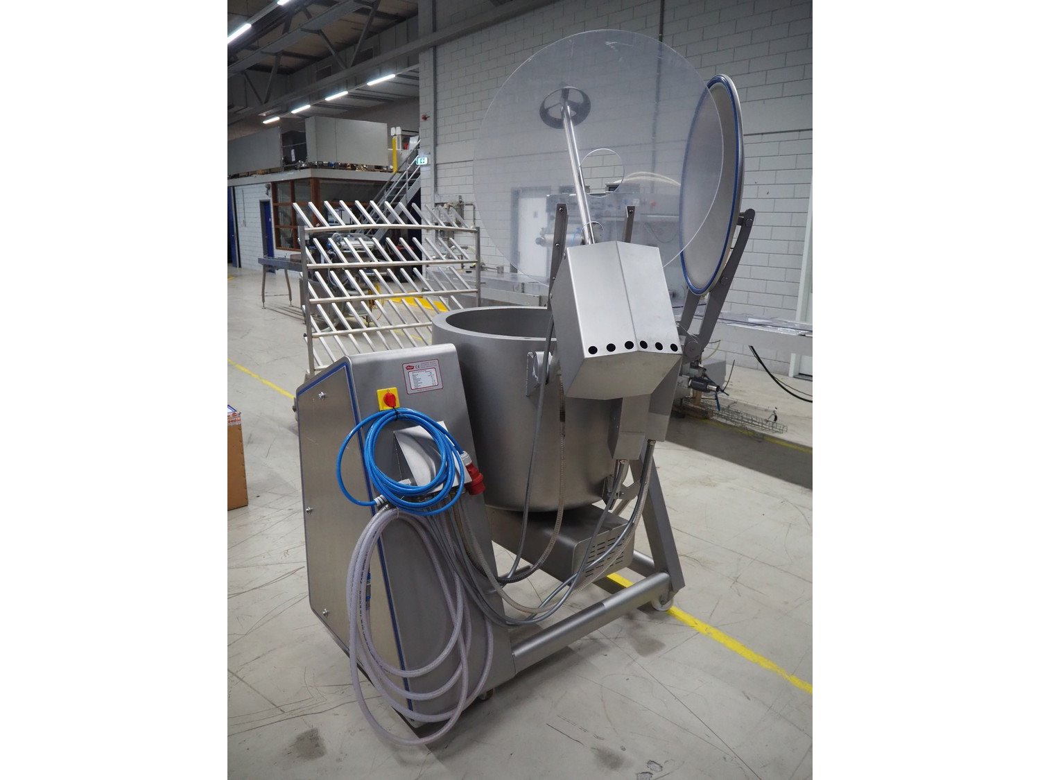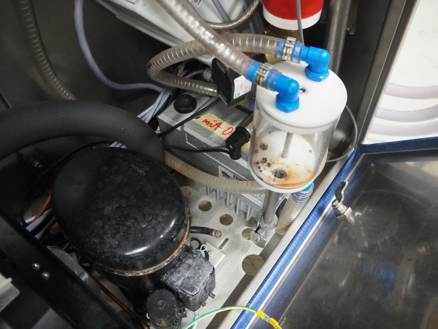 Vakona mobile cooled vacuum tumbler, type: ESK 250 STL-C, machine number: 3282, year of construction: 2015, 400 V, 3 Ph, 50 Hz, 16 A, 4.4 kW, 375 kg, Vakona vacuum pump, type: 008943, serial number: D14281002, year of construction: 2014, capacity: 12 m³ per hour, volume tub: 250 liter, dimensions: 1500 mm x 1500 mm x 2100 mm.