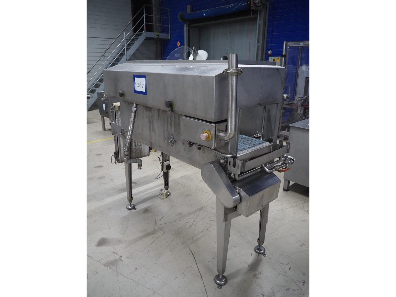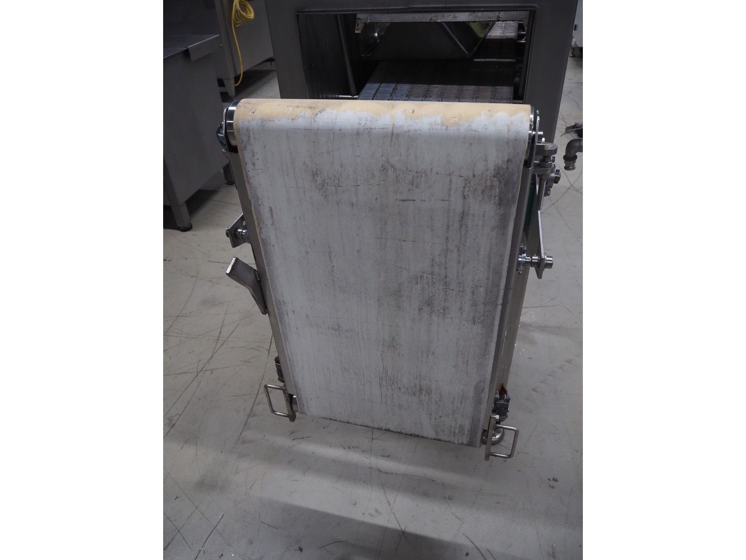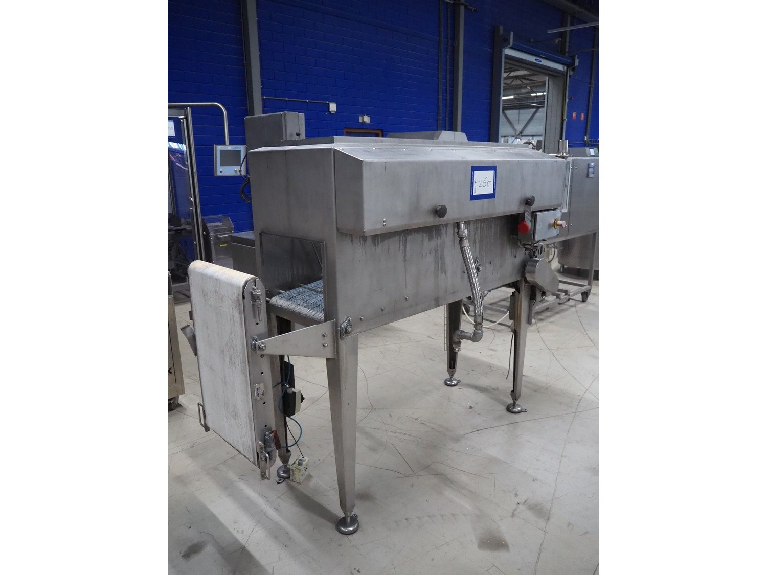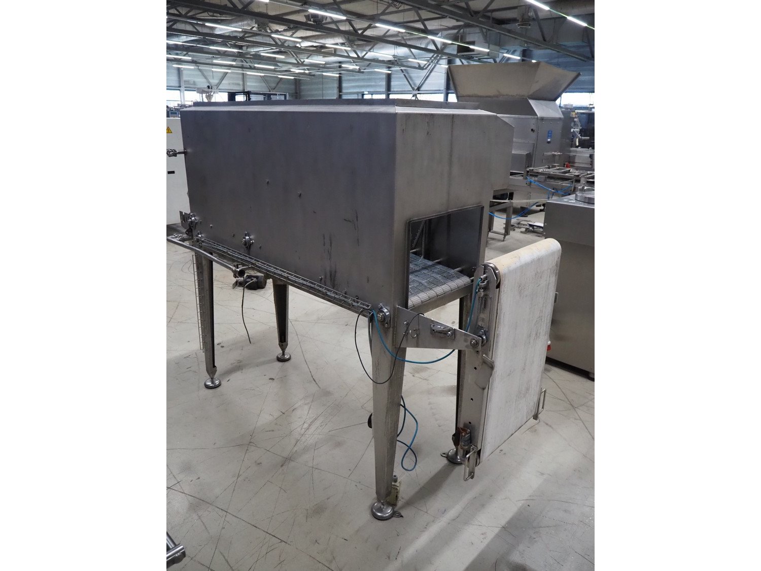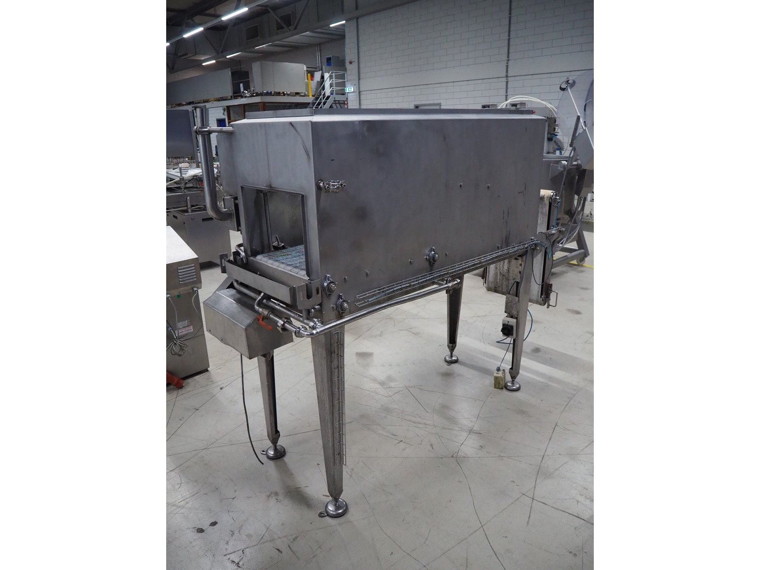 S/s paraffine tunnel, s/s mesh belt, belt width: 430 mm, clearance: 430 mmm x 180 mm, plastic outfeed belt, belt width: 430 mm, total dimensions: 2100 mm x 900 mm x 2900 mm.