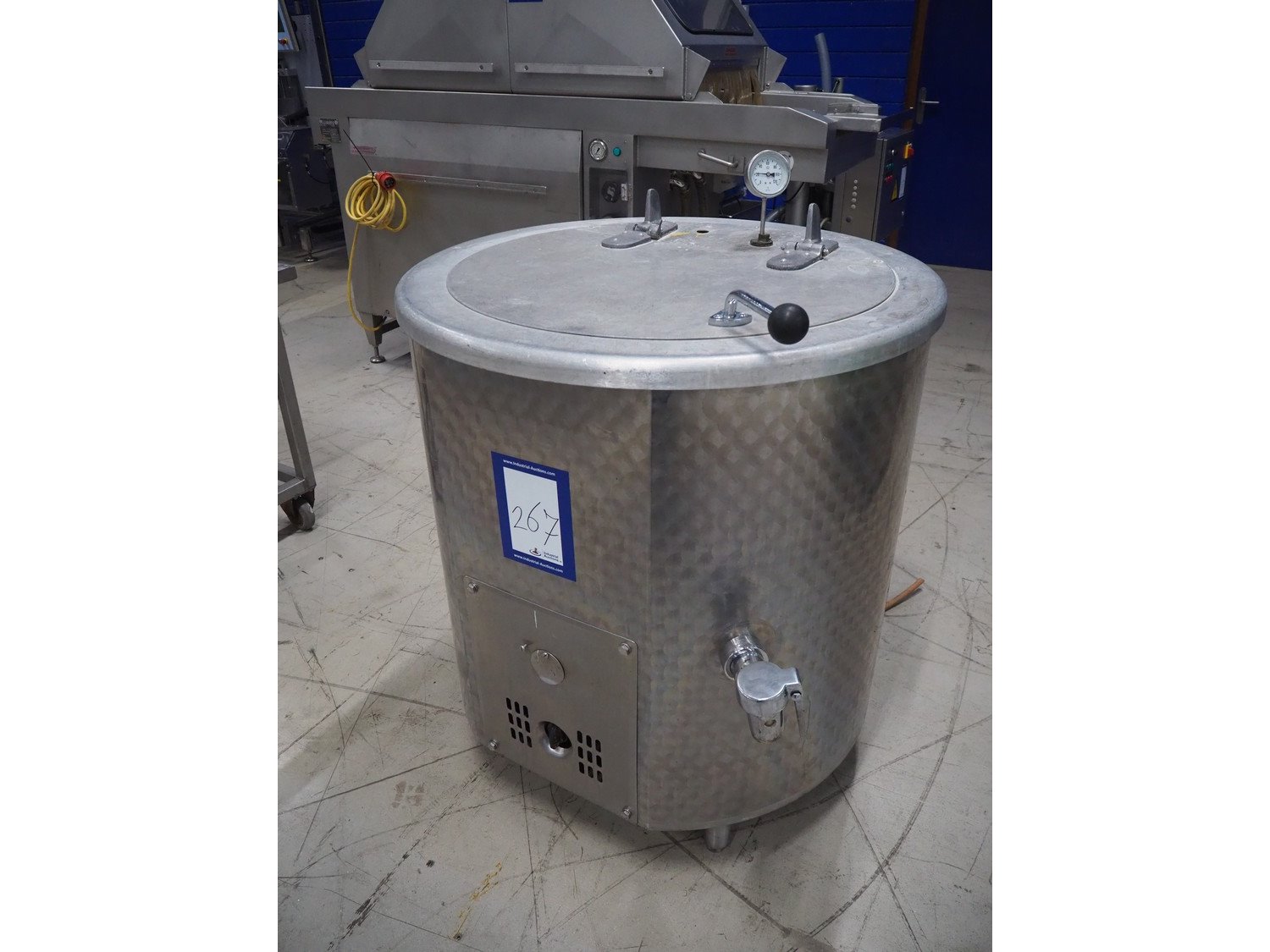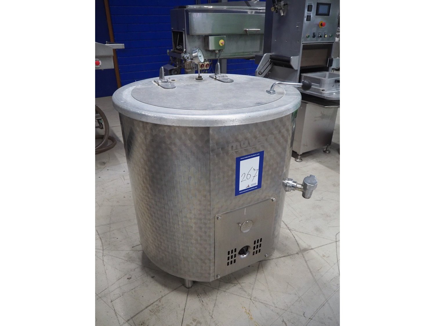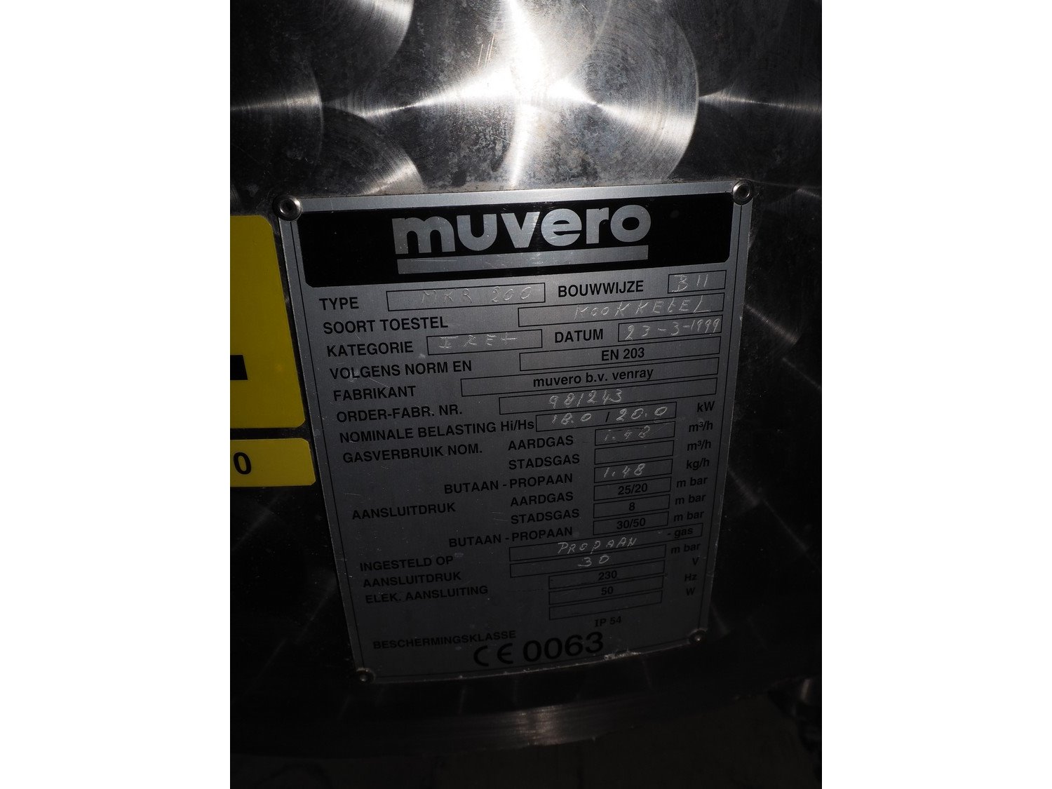 Muvero cooking vessel, type: MKR 200, number: 981243, year of construction: 23-3-1999, 230 V, 50 Hz, gas heated, volume: 200 liter, dimensions: 950 mm x 950 mm x 1200 mm.