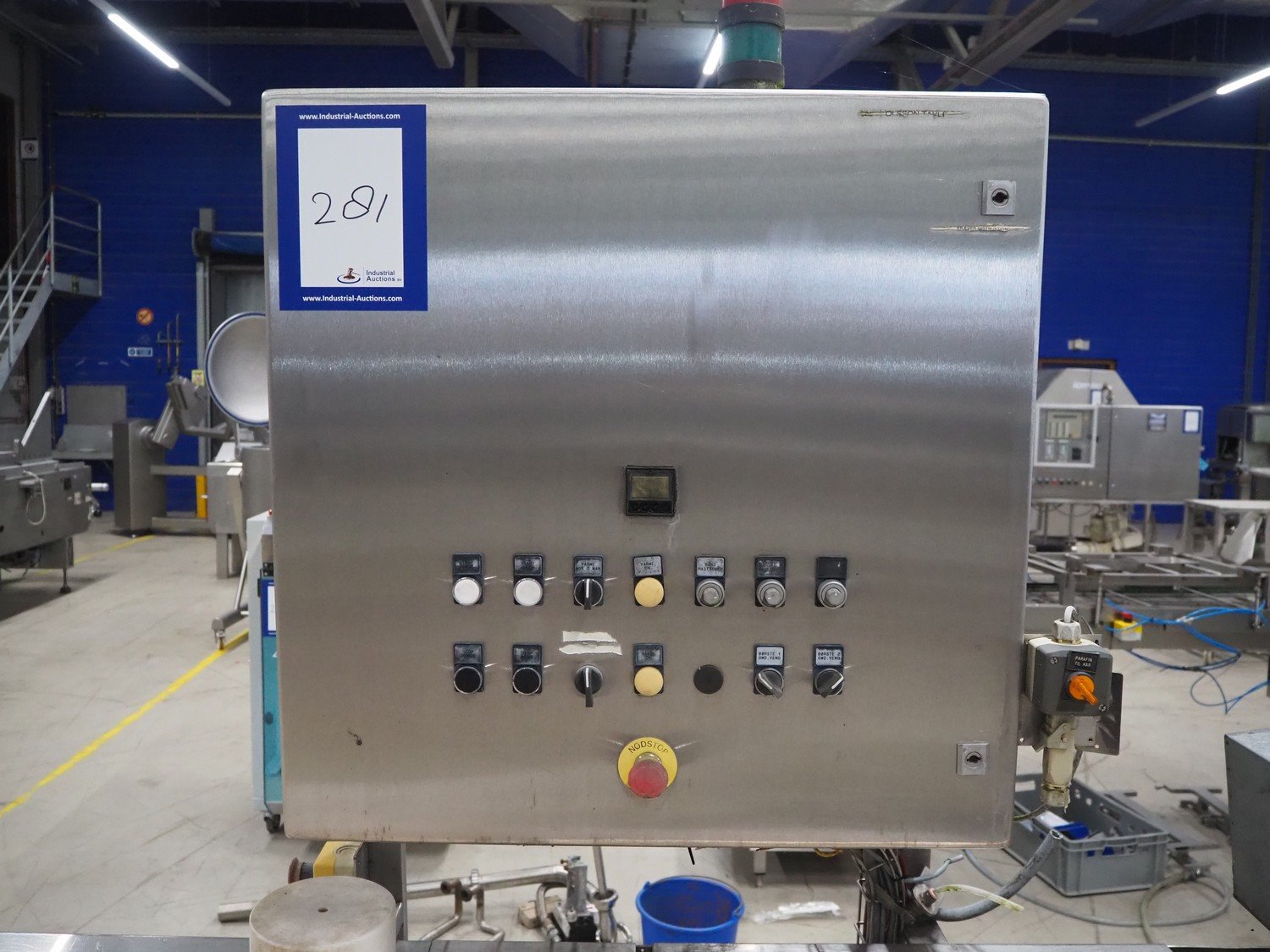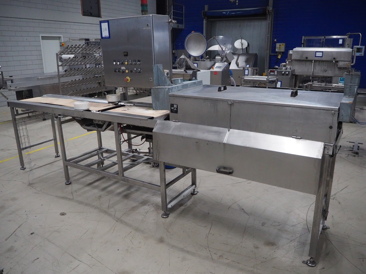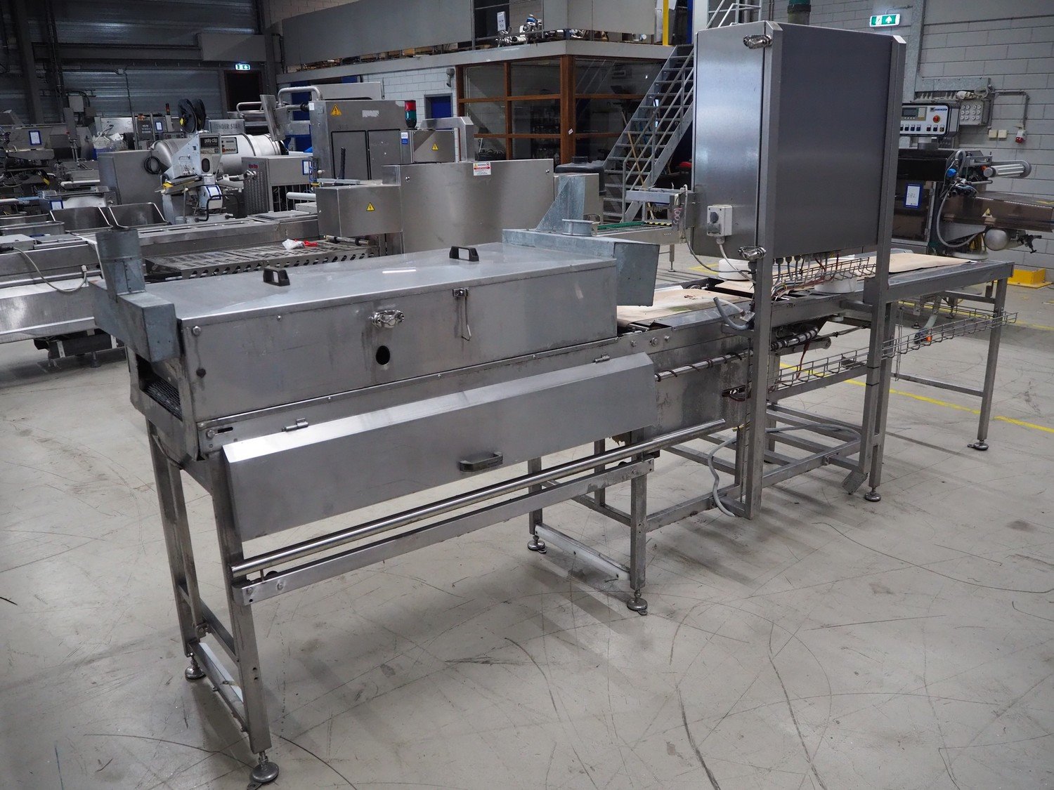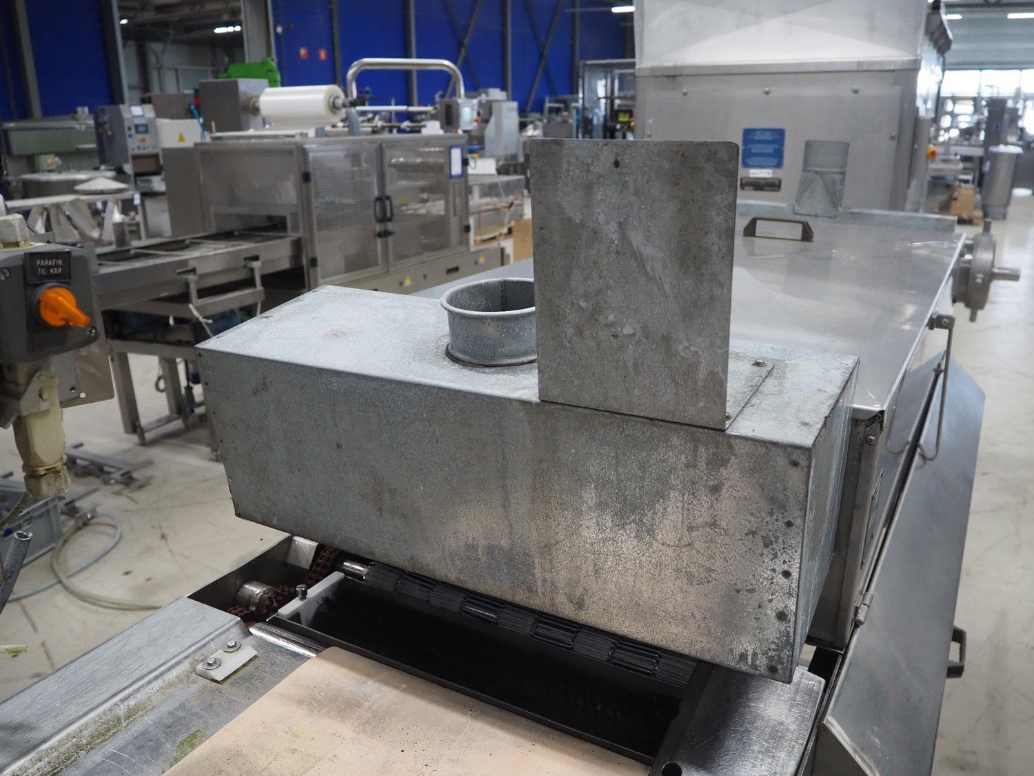 E. Olsson's Maskinfabrik ApS paraffine tunnel, model: BOVM 400, serial number: 02.190.01, year of construction: 2001, 400 V, 3 Ph, 50 Hz, 16 A, clothed infeed belt, belt width: 350 mm, brush length: 400 mm, s/s mesh belt, belt width: 410 mm, clearance: 400 mm x 30 mm, total dimensions: 4100 mm x 950 mm x 2200 mm.