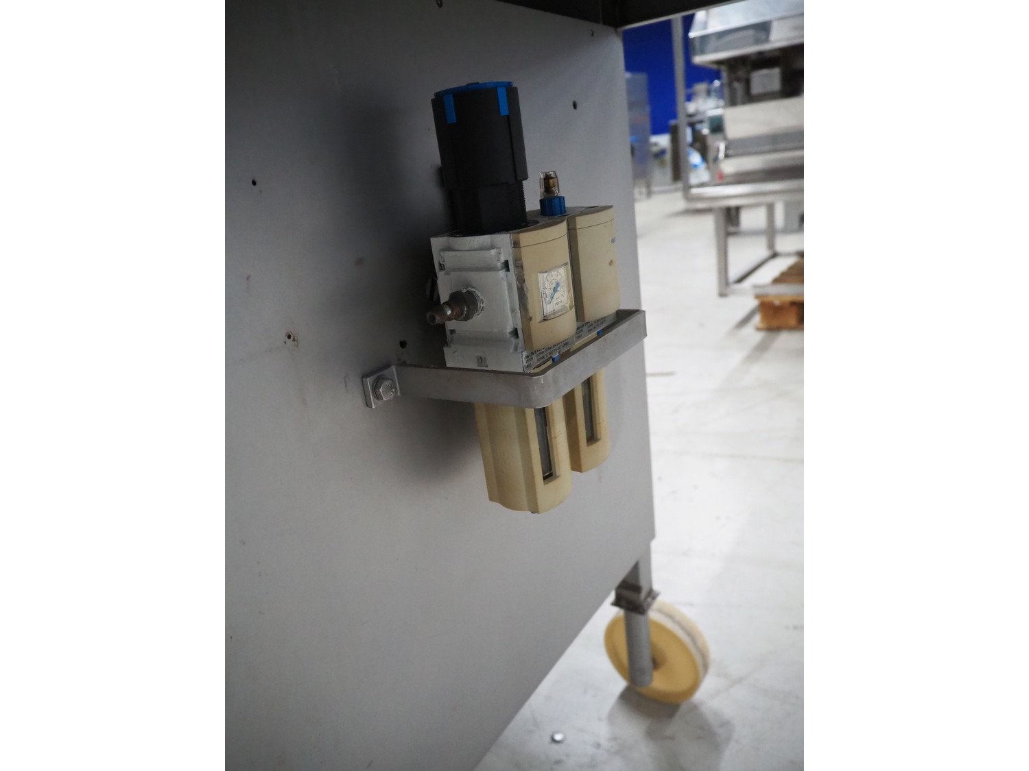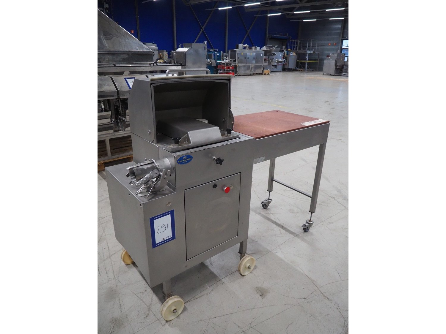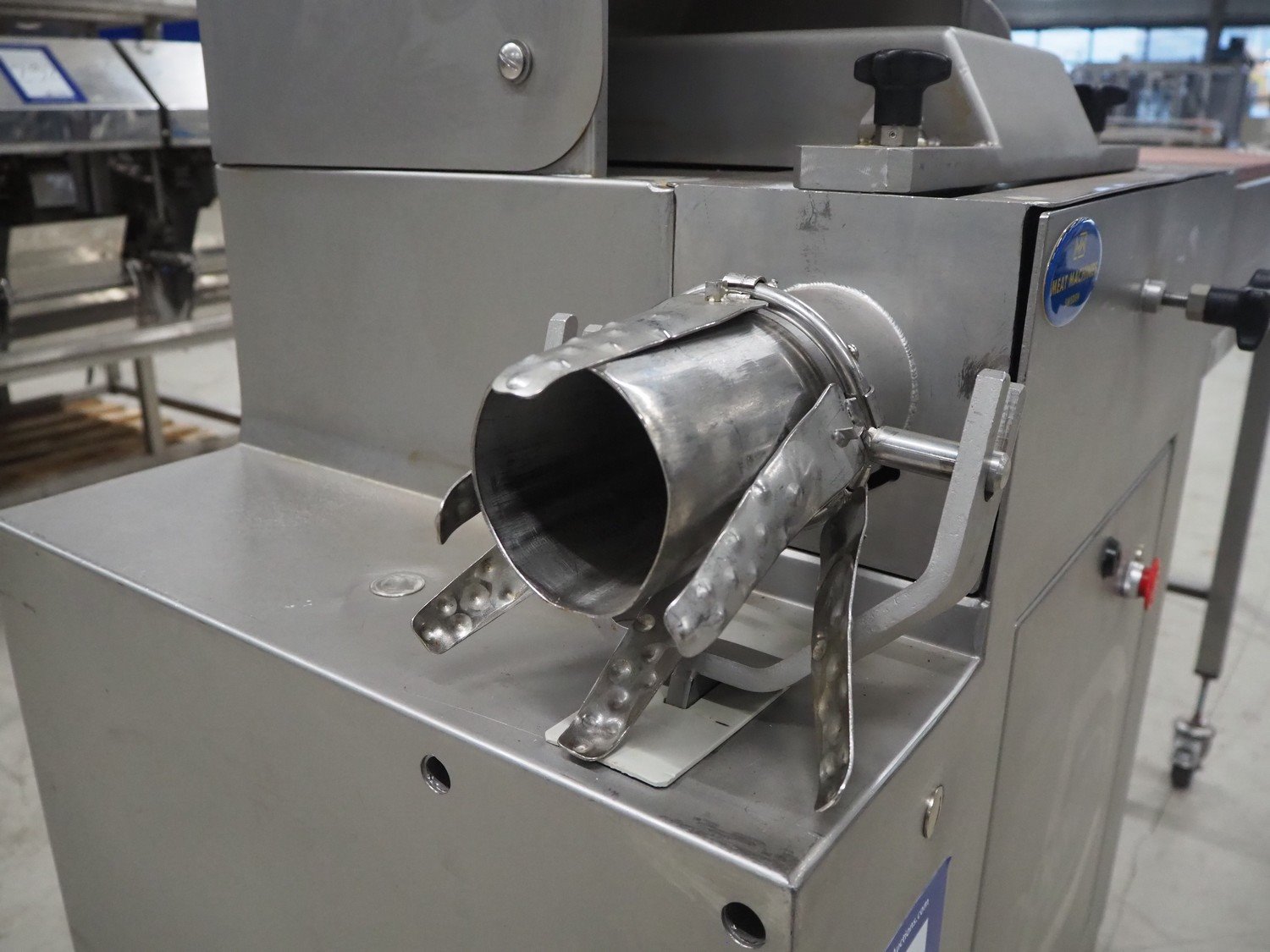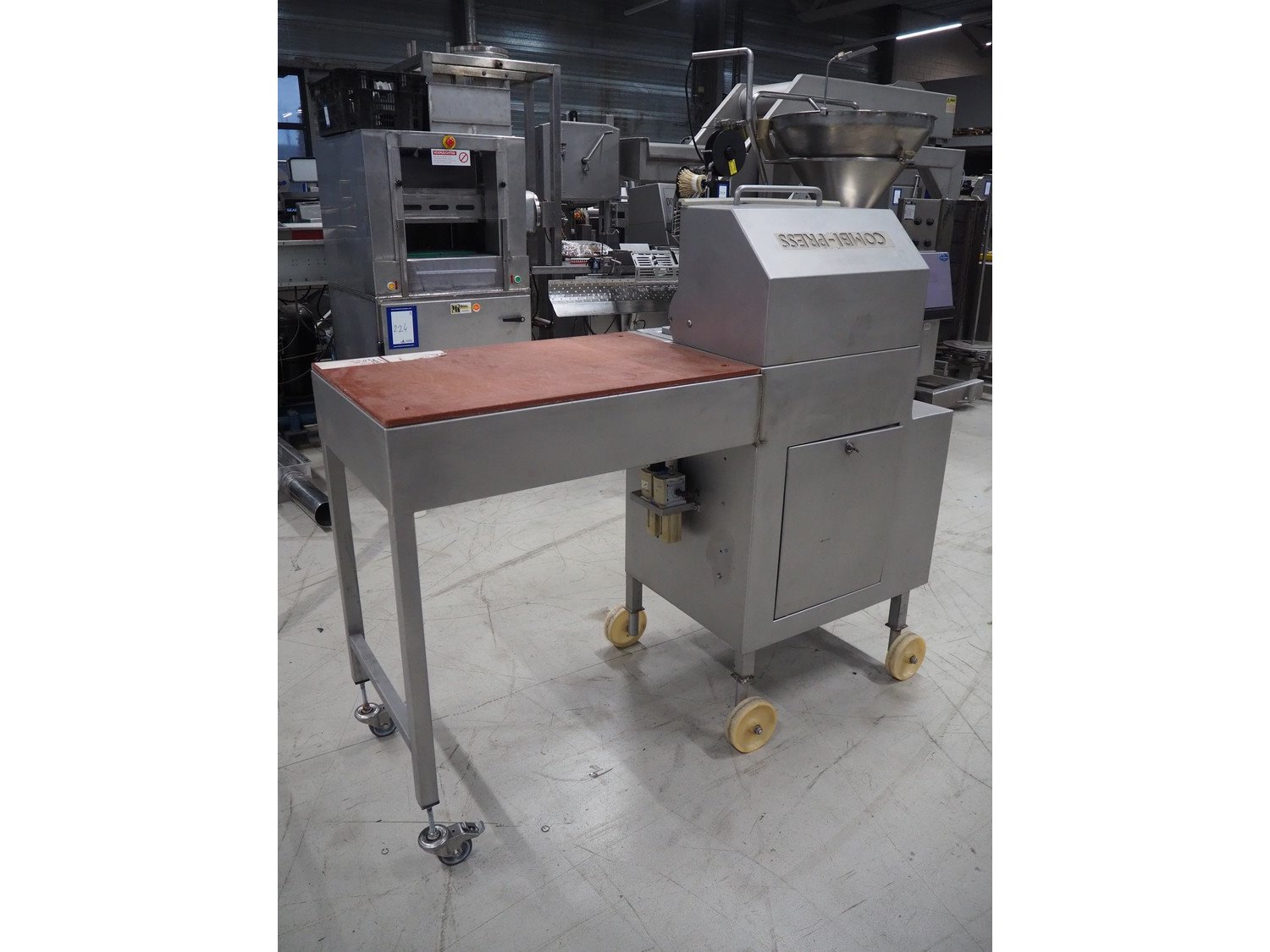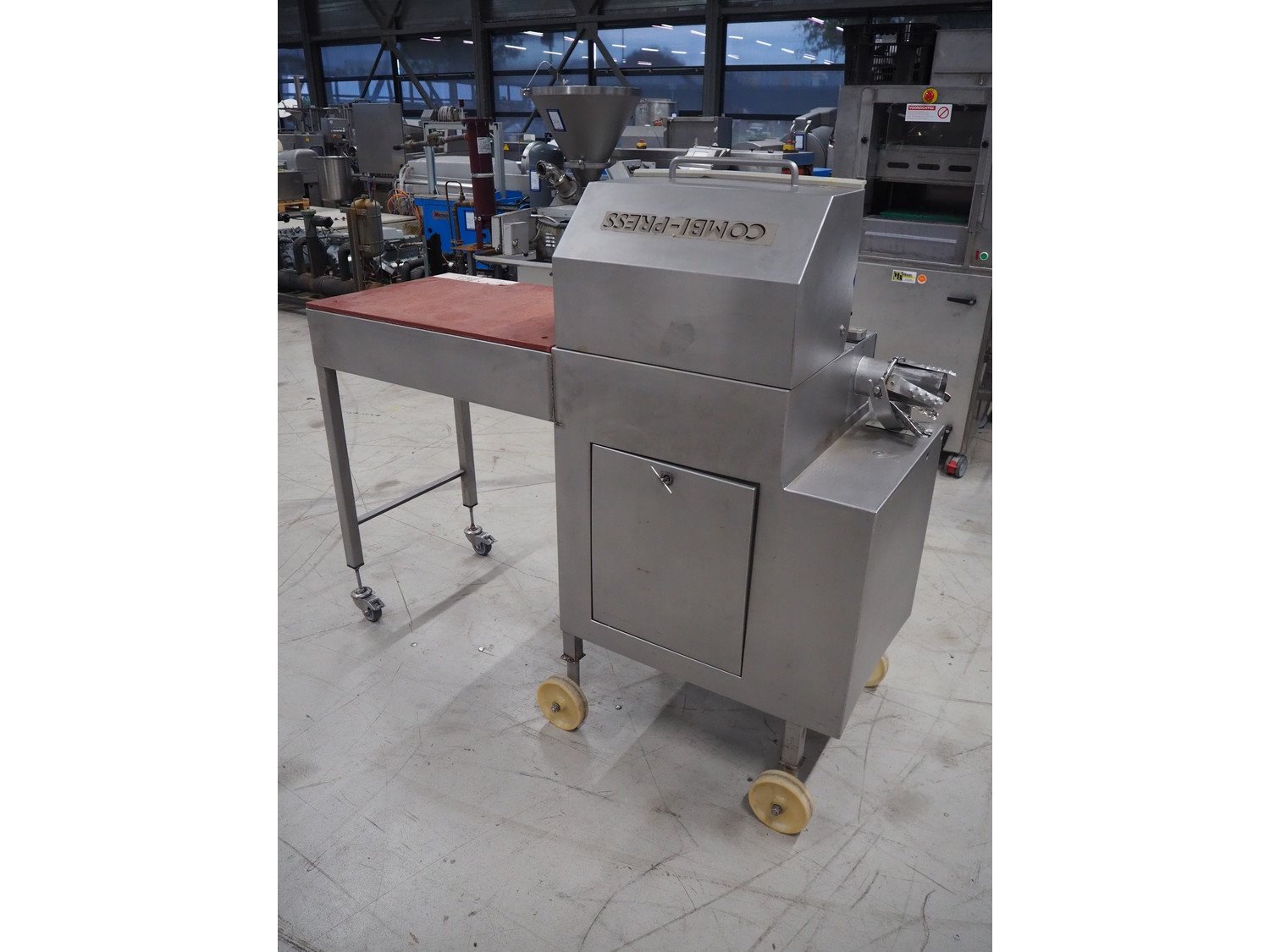 Dorit mobile meat press, type: Combi-press, clearance: Ø 100 mm x 495 mm, total dimensions: 1800 mm x 700 mm x 1420 mm. Including 2 extra outfeed pipes, dimensions outfeed pipes: (1x) 90 mm and (1x) 120 mm.
