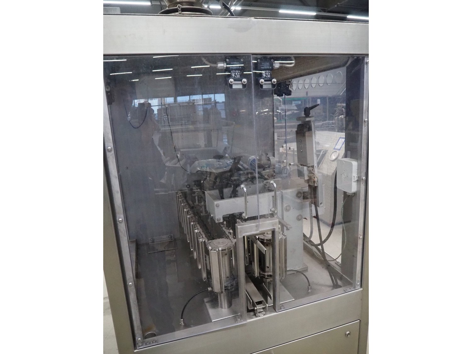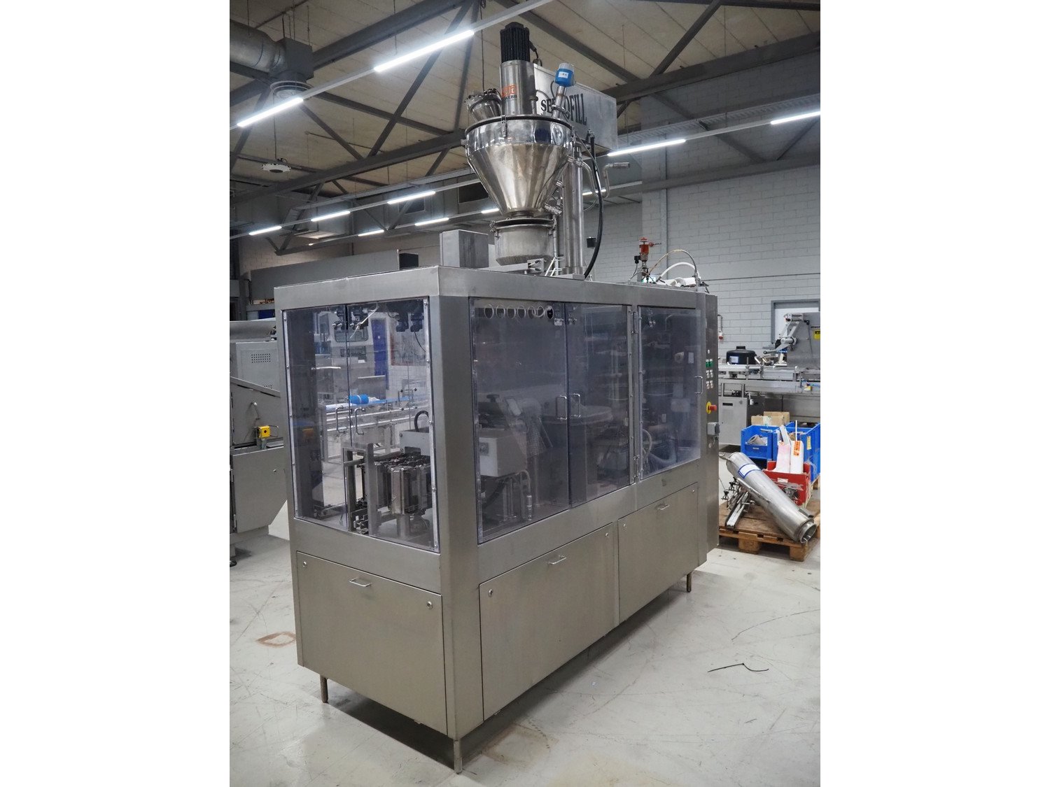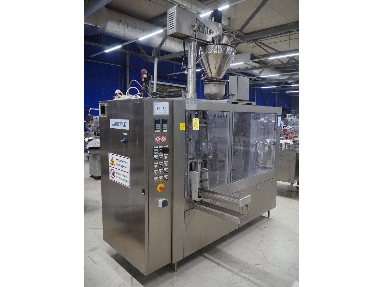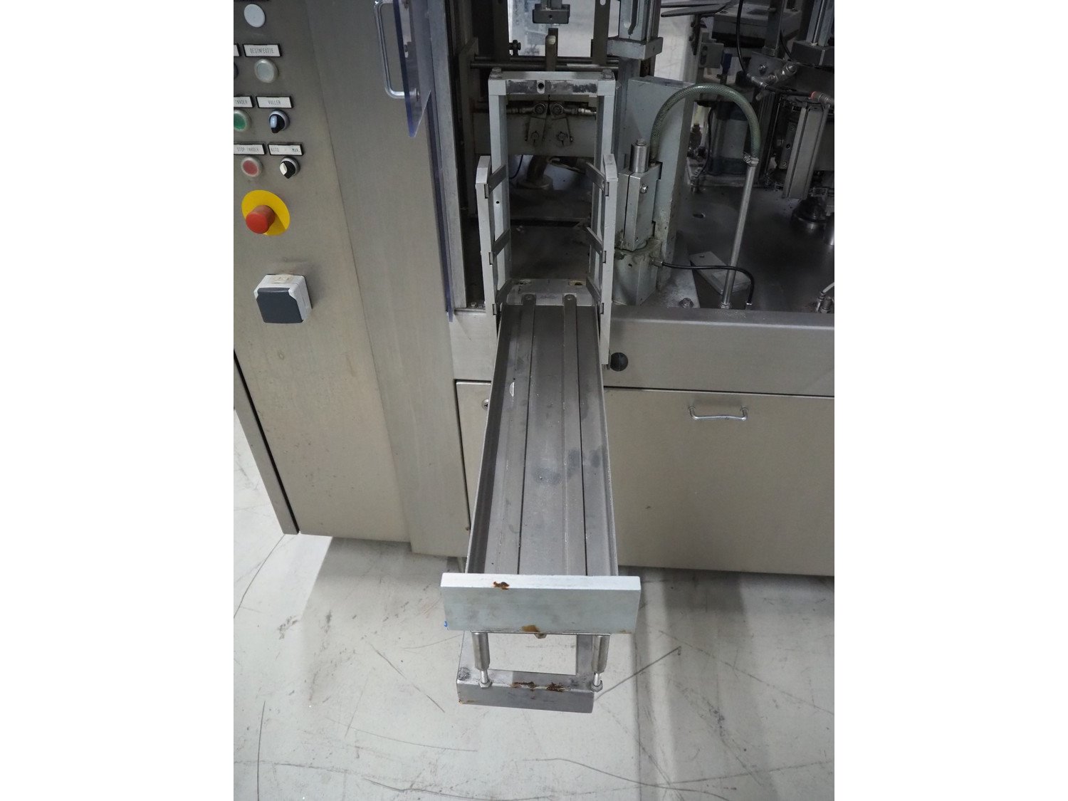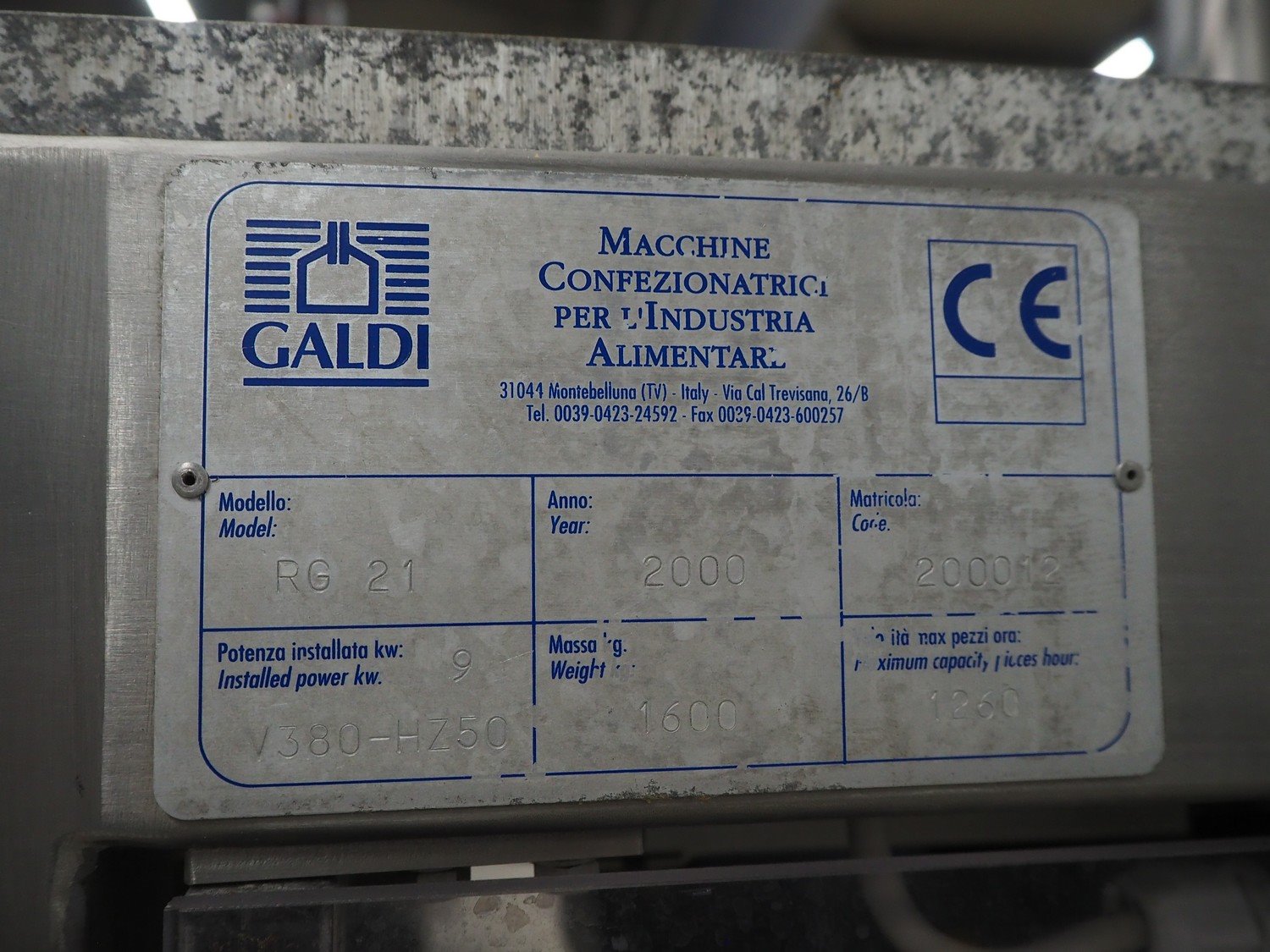 Galdi / Variopak forming and filling machine, model: RG 21, serial number: 200012, year of construction: 2000, 380 V, 50 Hz, 9 kW, weight: 1600 kg, package size: 74 mm x 74 mm, total dimensions: 1630 mm x 3250 mm. With outfeed roller conveyor, roller width: 50 mm, total dimensions: 1100 mm x 300 mm x 160 mm and s/s double jacketed infeed pipe, diameter infeed: 150 mm, total dimensions: 1300 mm x 250 mm x 350 mm and pallet with spare parts, dimensions: 800 mm x 600 mm x 700 mm.