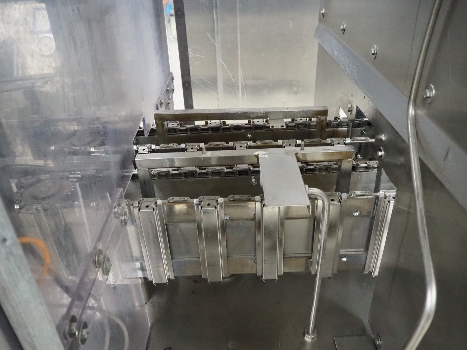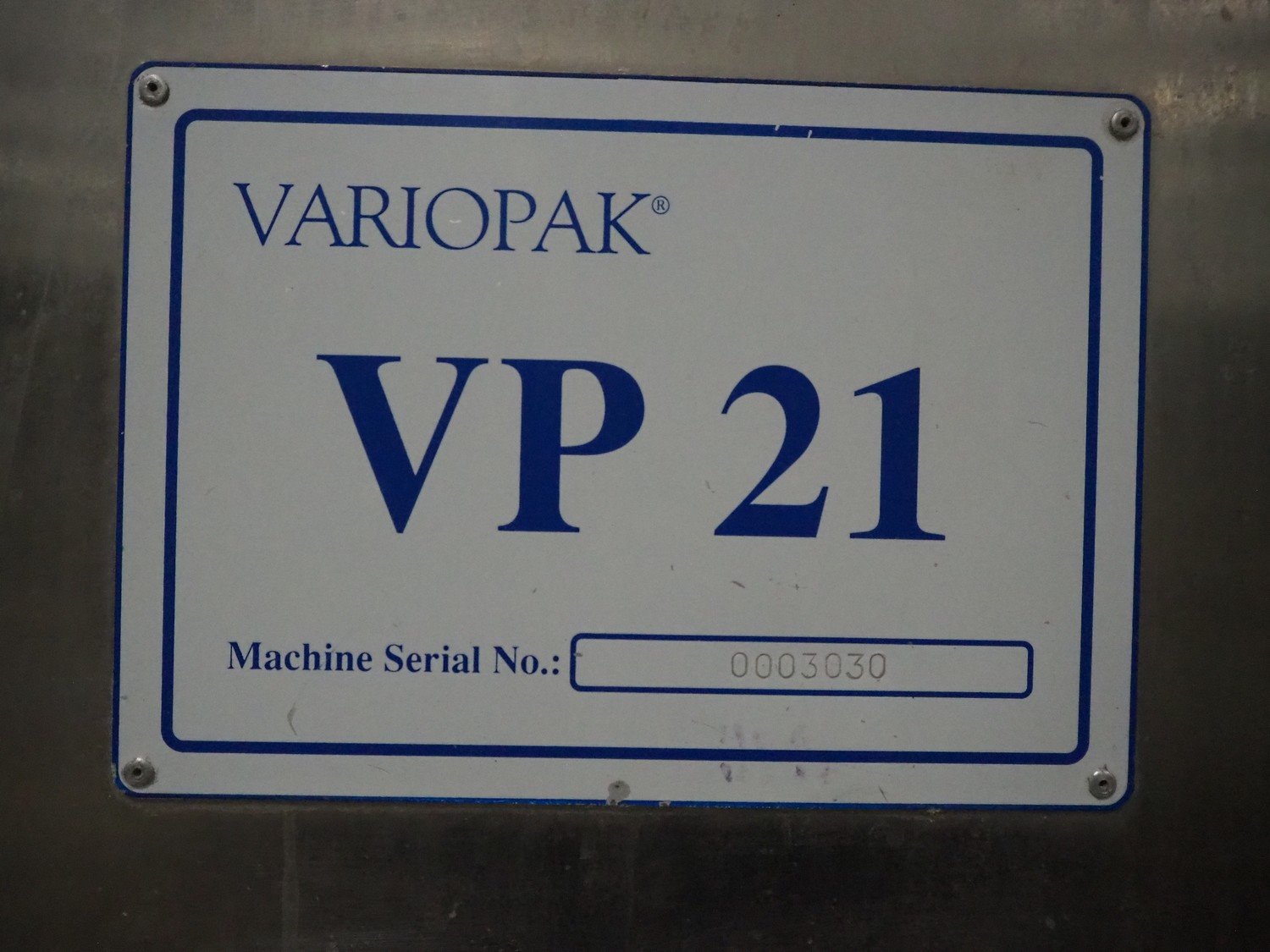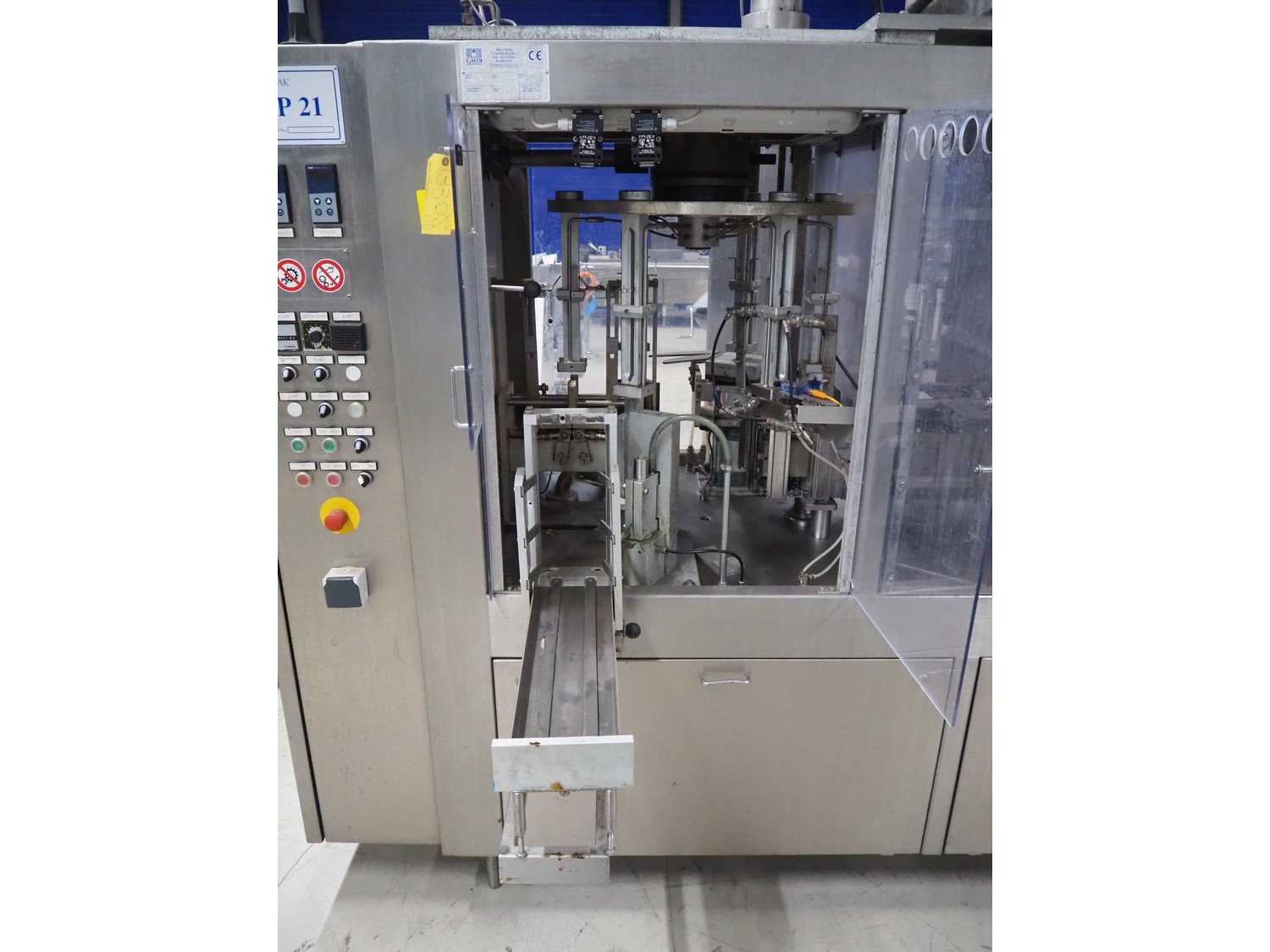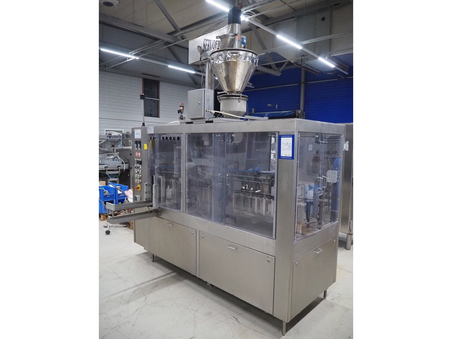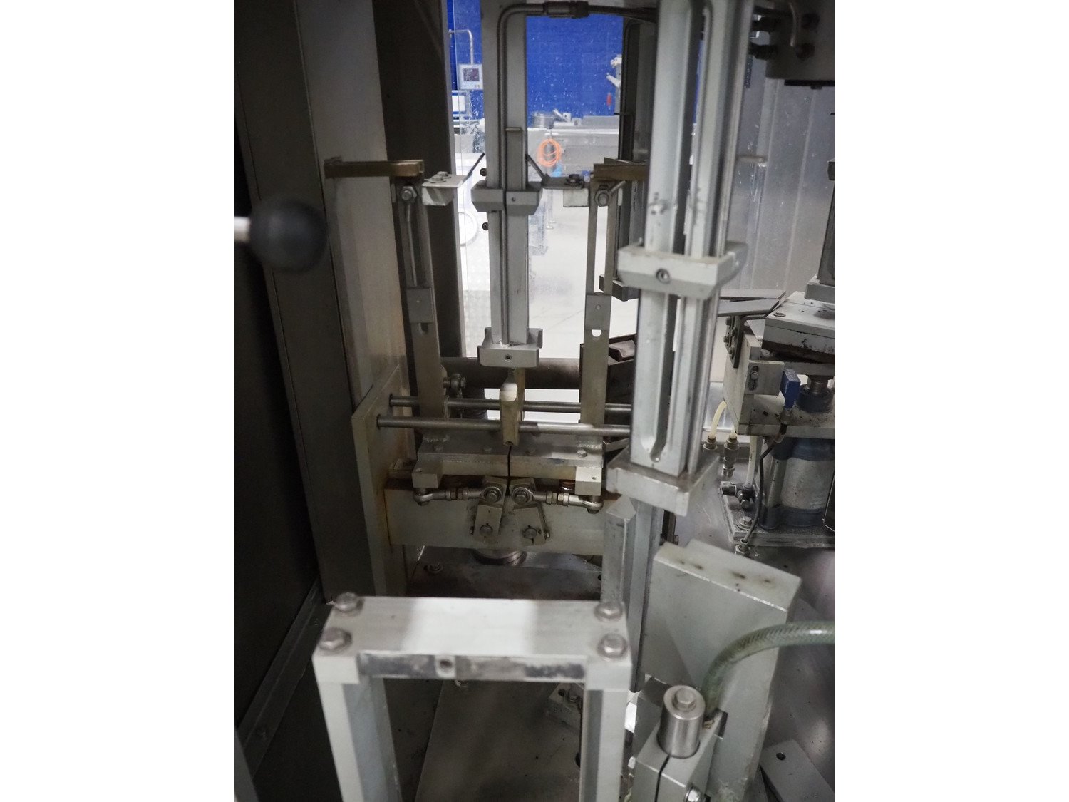 Galdi / Variopak forming and filling machine, model: RG 21, serial number: 200012, year of construction: 2000, 380 V, 50 Hz, 9 kW, weight: 1600 kg, package size: 74 mm x 74 mm, total dimensions: 1630 mm x 3250 mm. With outfeed roller conveyor, roller width: 50 mm, total dimensions: 1100 mm x 300 mm x 160 mm and s/s double jacketed infeed pipe, diameter infeed: 150 mm, total dimensions: 1300 mm x 250 mm x 350 mm and pallet with spare parts, dimensions: 800 mm x 600 mm x 700 mm.