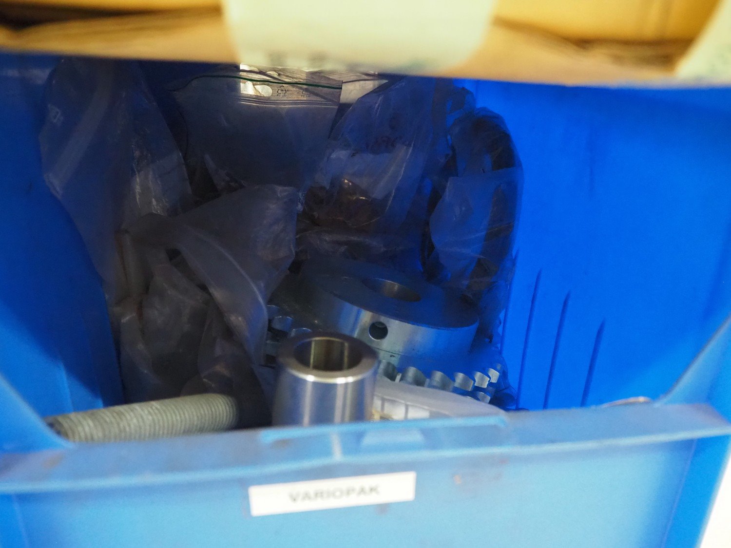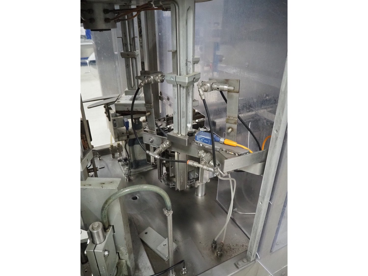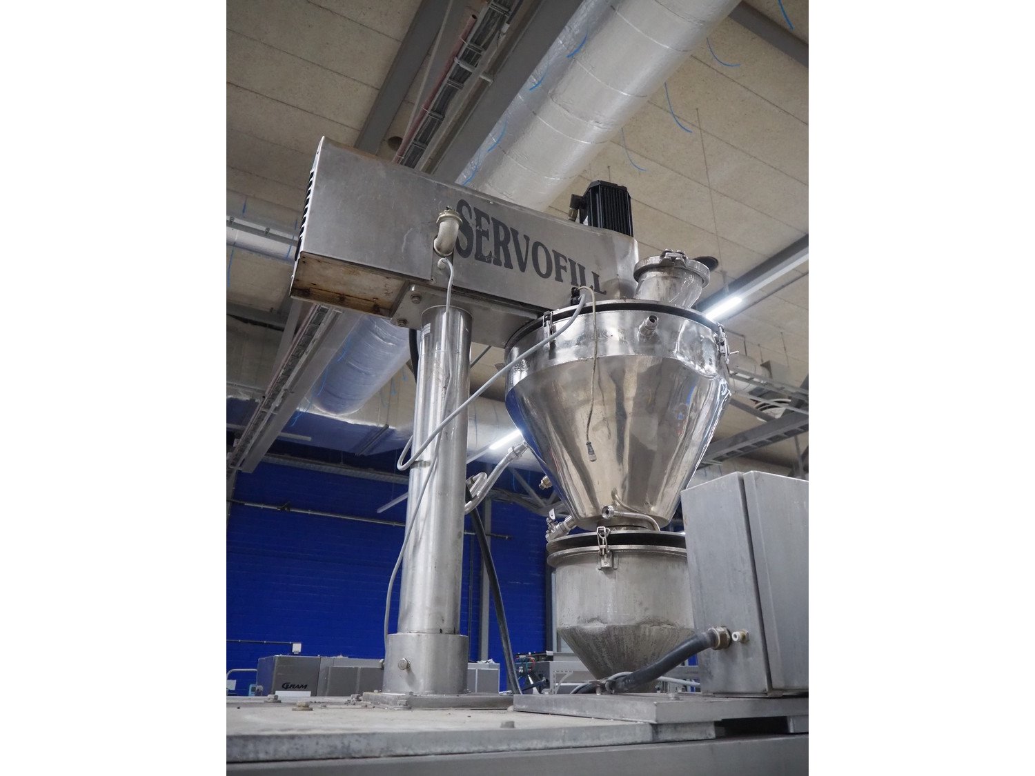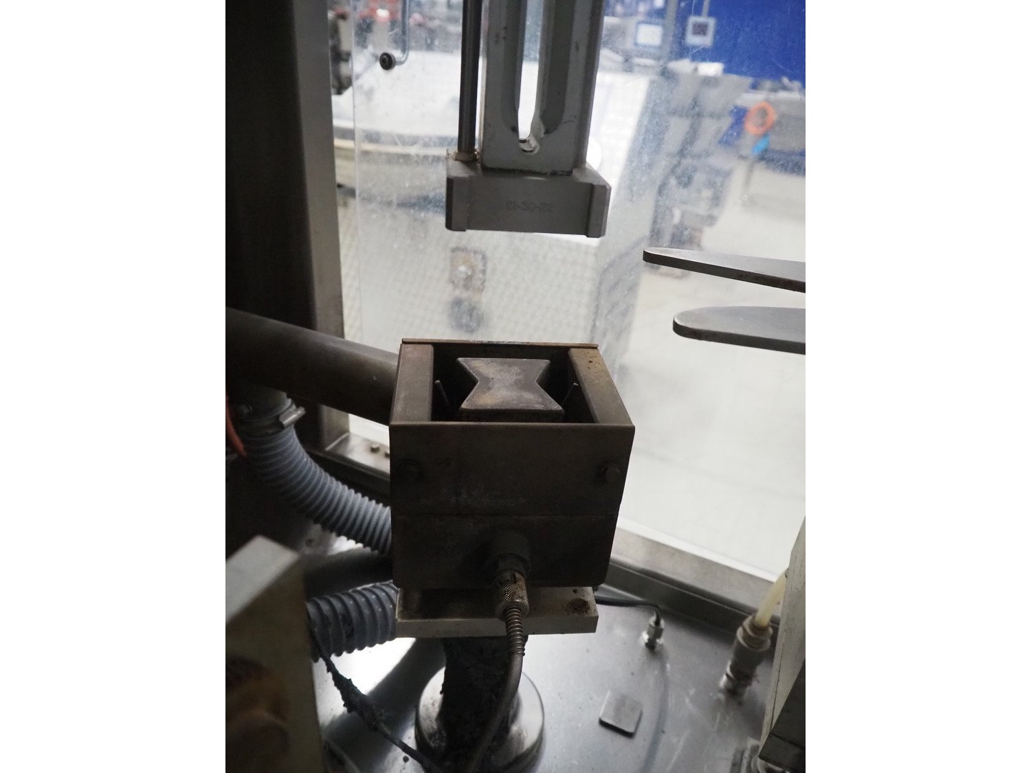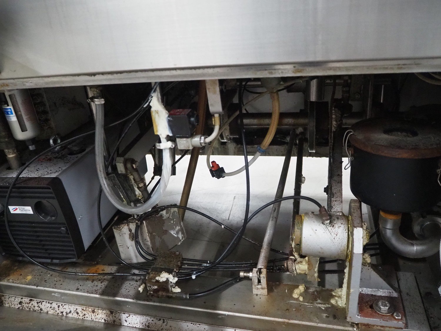 Galdi / Variopak forming and filling machine, model: RG 21, serial number: 200012, year of construction: 2000, 380 V, 50 Hz, 9 kW, weight: 1600 kg, package size: 74 mm x 74 mm, total dimensions: 1630 mm x 3250 mm. With outfeed roller conveyor, roller width: 50 mm, total dimensions: 1100 mm x 300 mm x 160 mm and s/s double jacketed infeed pipe, diameter infeed: 150 mm, total dimensions: 1300 mm x 250 mm x 350 mm and pallet with spare parts, dimensions: 800 mm x 600 mm x 700 mm.