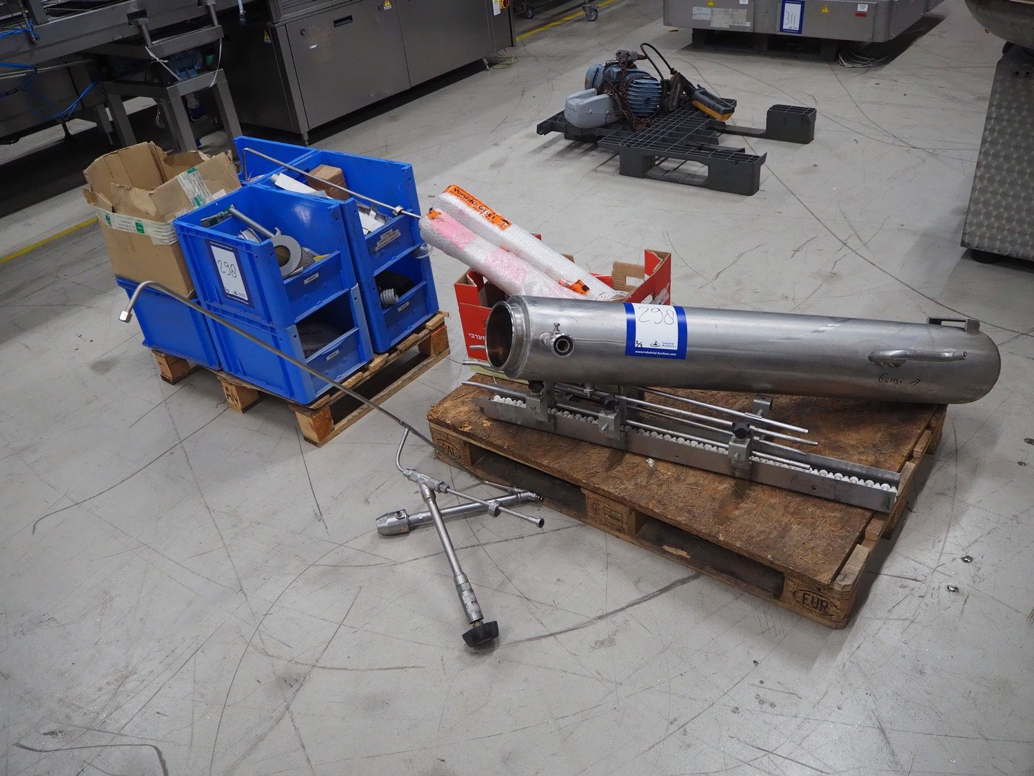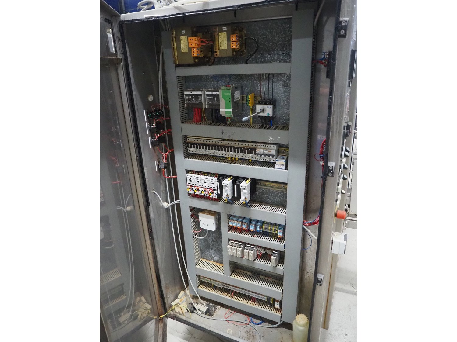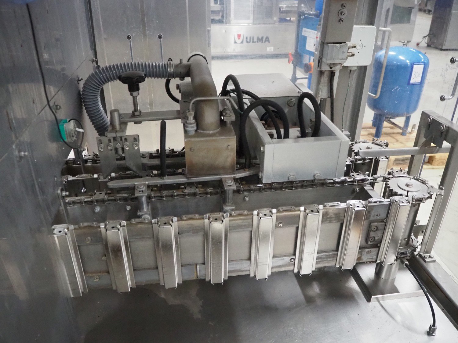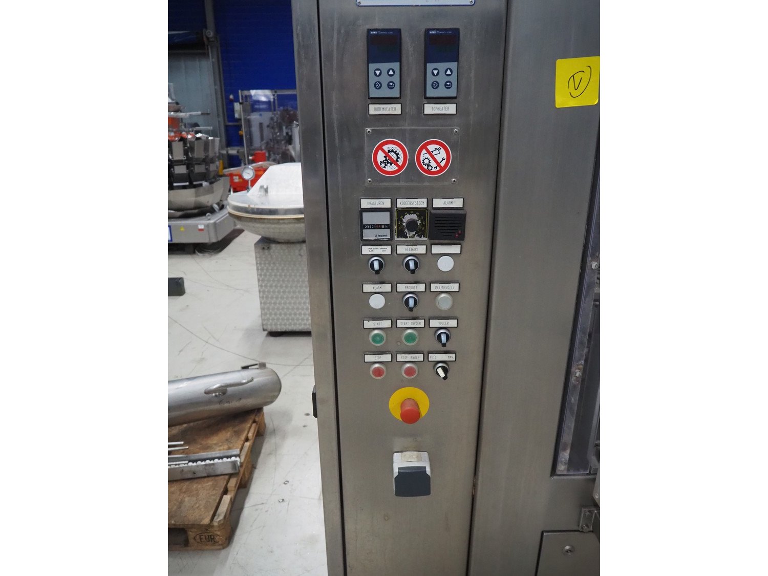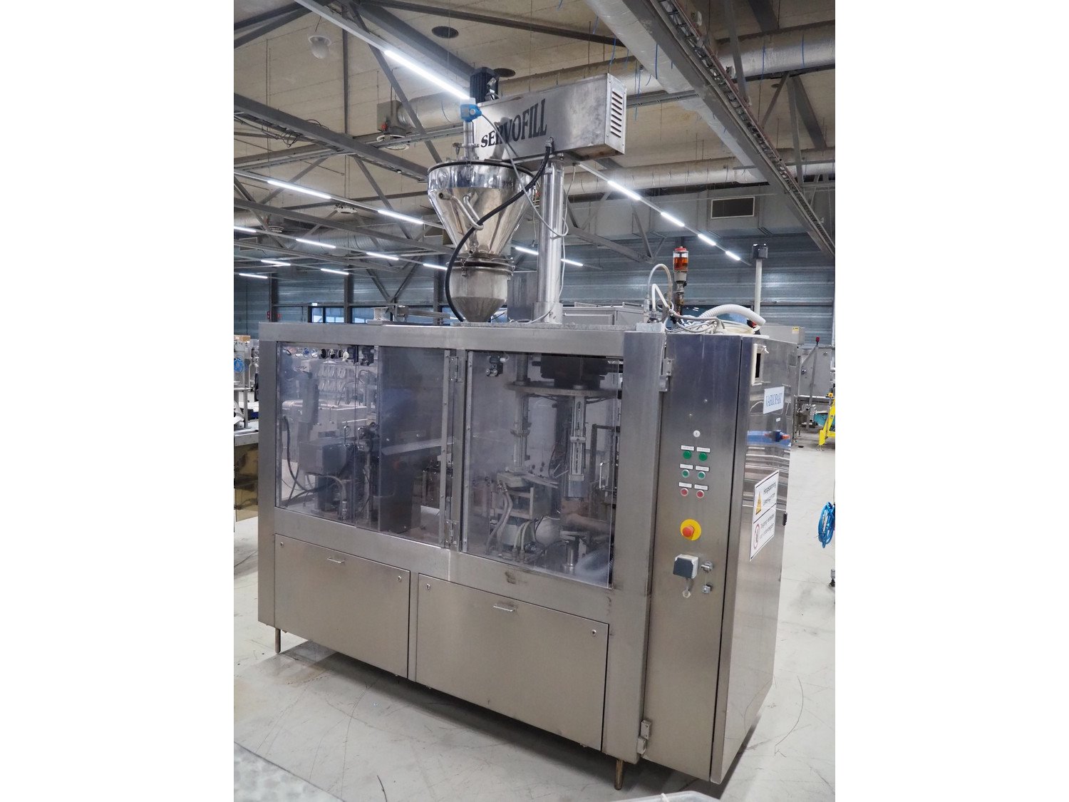 Galdi / Variopak forming and filling machine, model: RG 21, serial number: 200012, year of construction: 2000, 380 V, 50 Hz, 9 kW, weight: 1600 kg, package size: 74 mm x 74 mm, total dimensions: 1630 mm x 3250 mm. With outfeed roller conveyor, roller width: 50 mm, total dimensions: 1100 mm x 300 mm x 160 mm and s/s double jacketed infeed pipe, diameter infeed: 150 mm, total dimensions: 1300 mm x 250 mm x 350 mm and pallet with spare parts, dimensions: 800 mm x 600 mm x 700 mm.