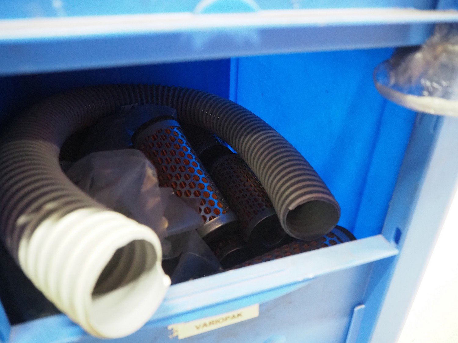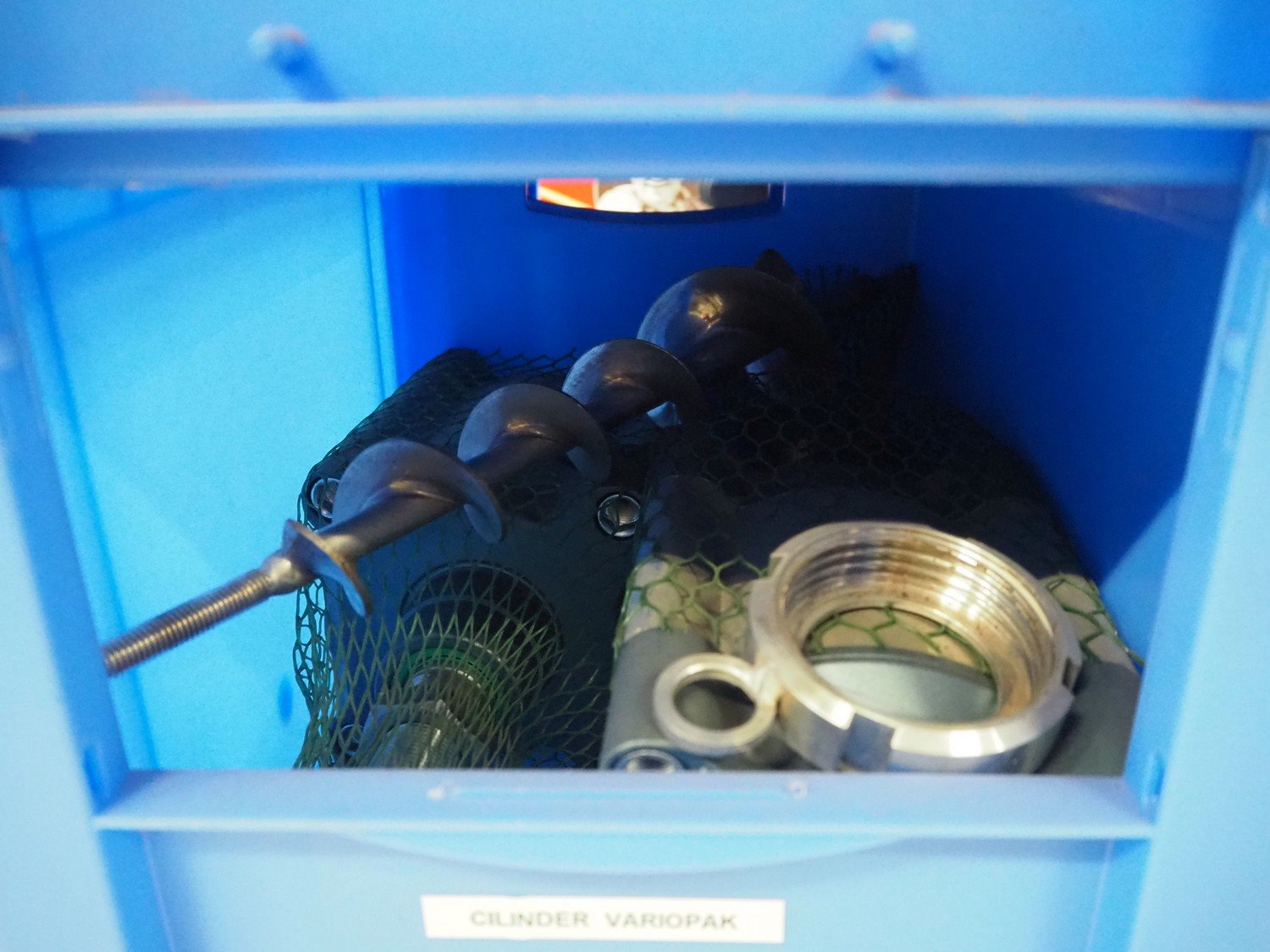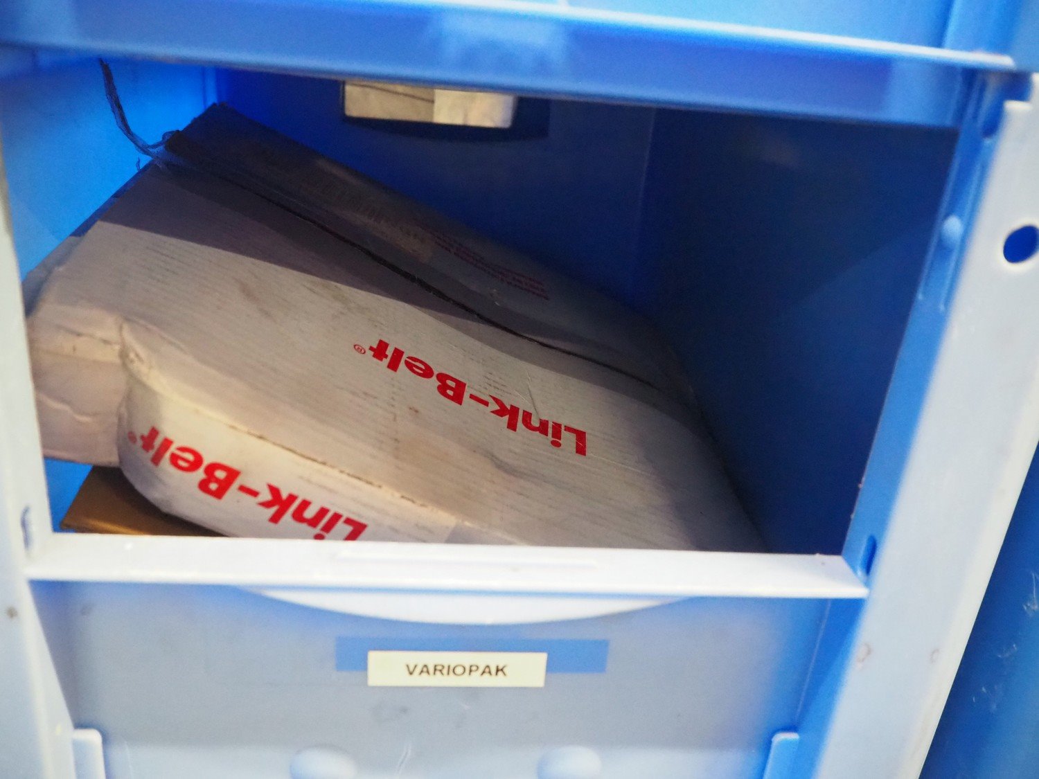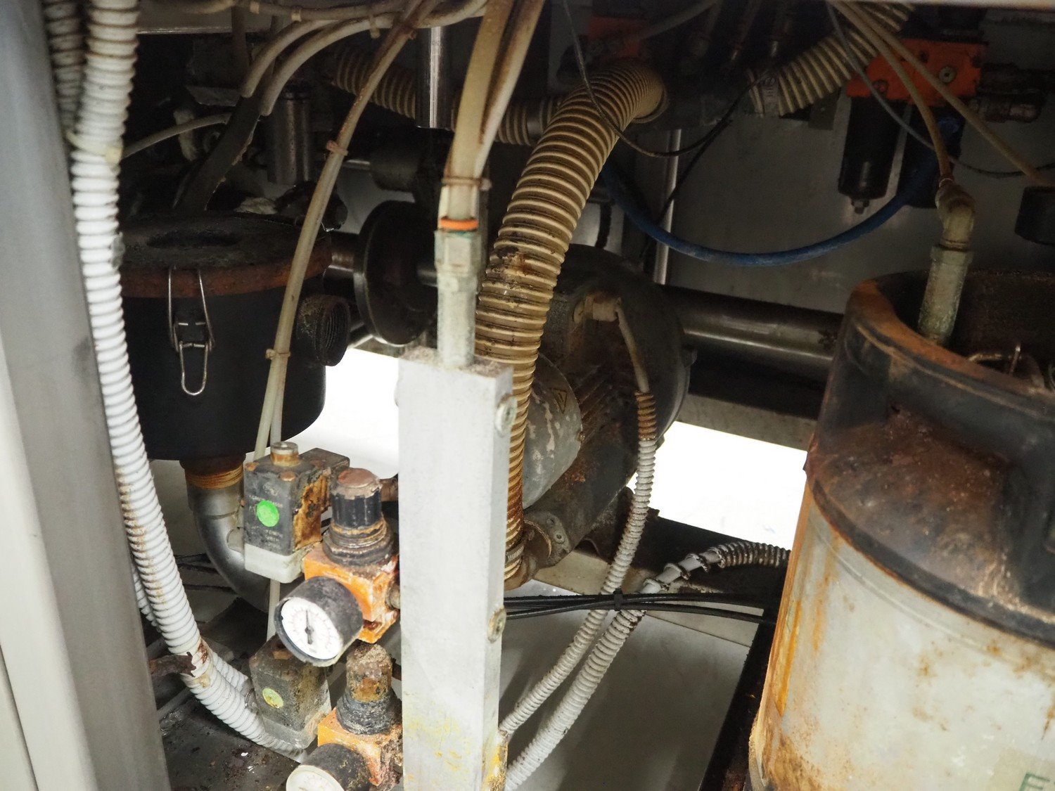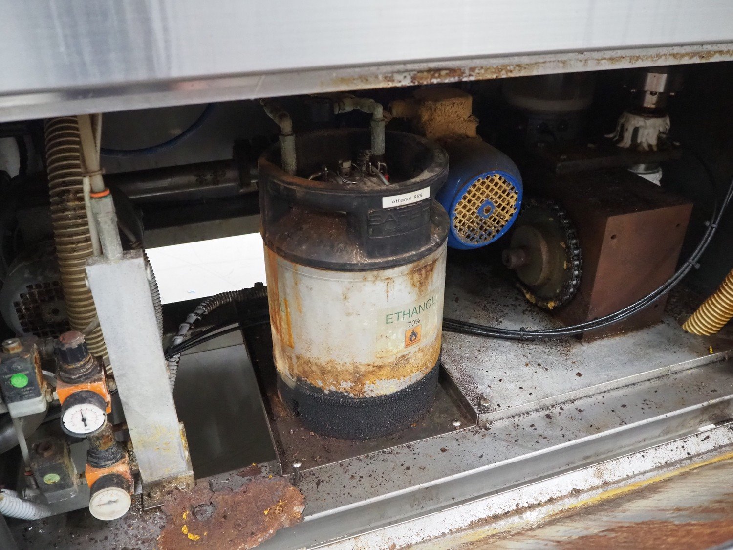 Galdi / Variopak forming and filling machine, model: RG 21, serial number: 200012, year of construction: 2000, 380 V, 50 Hz, 9 kW, weight: 1600 kg, package size: 74 mm x 74 mm, total dimensions: 1630 mm x 3250 mm. With outfeed roller conveyor, roller width: 50 mm, total dimensions: 1100 mm x 300 mm x 160 mm and s/s double jacketed infeed pipe, diameter infeed: 150 mm, total dimensions: 1300 mm x 250 mm x 350 mm and pallet with spare parts, dimensions: 800 mm x 600 mm x 700 mm.