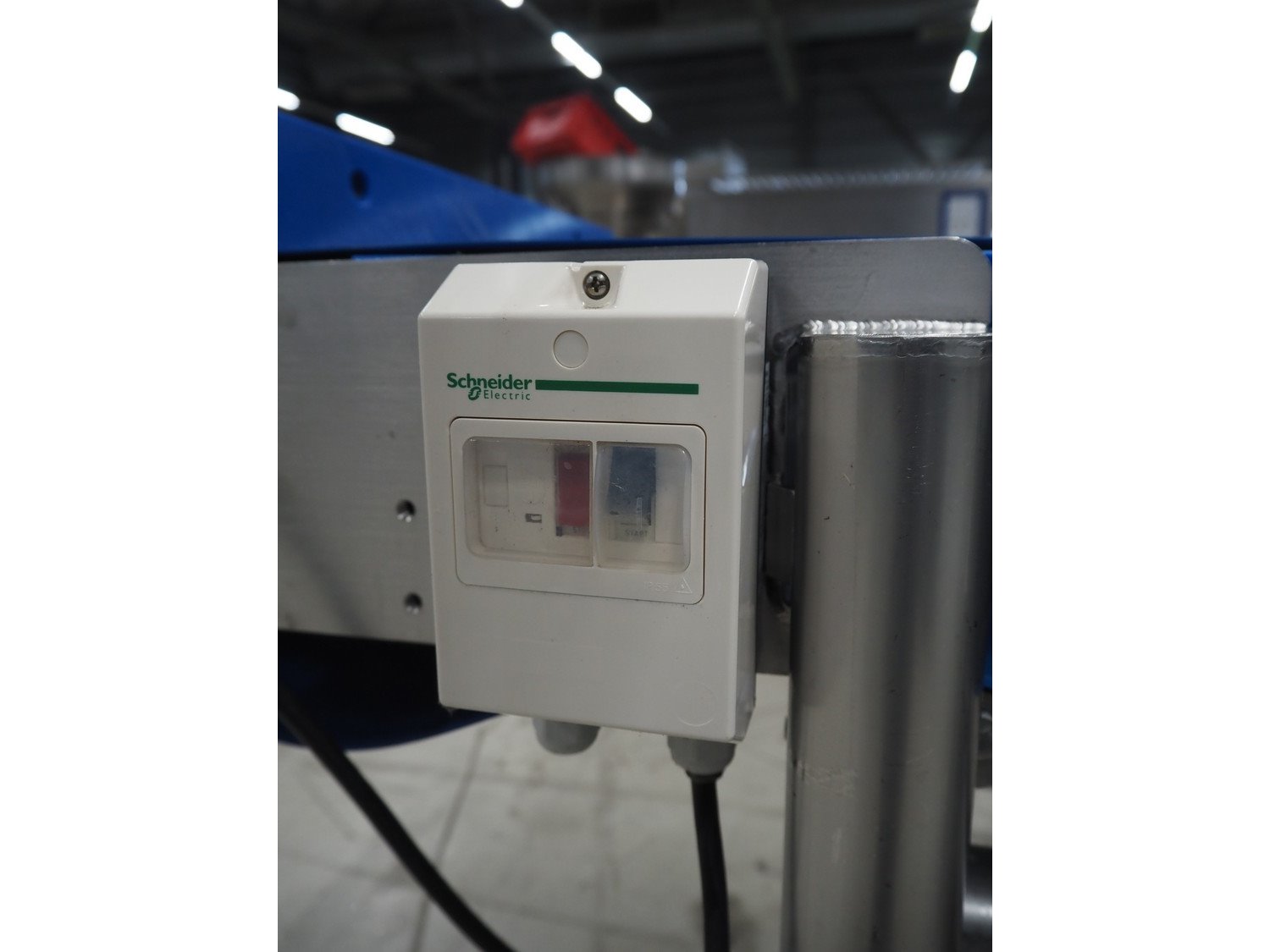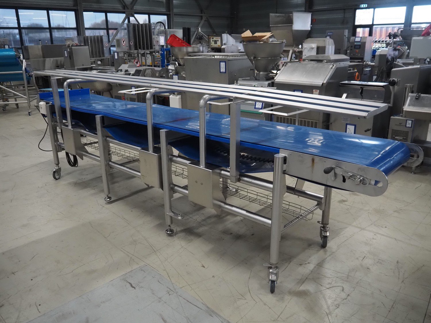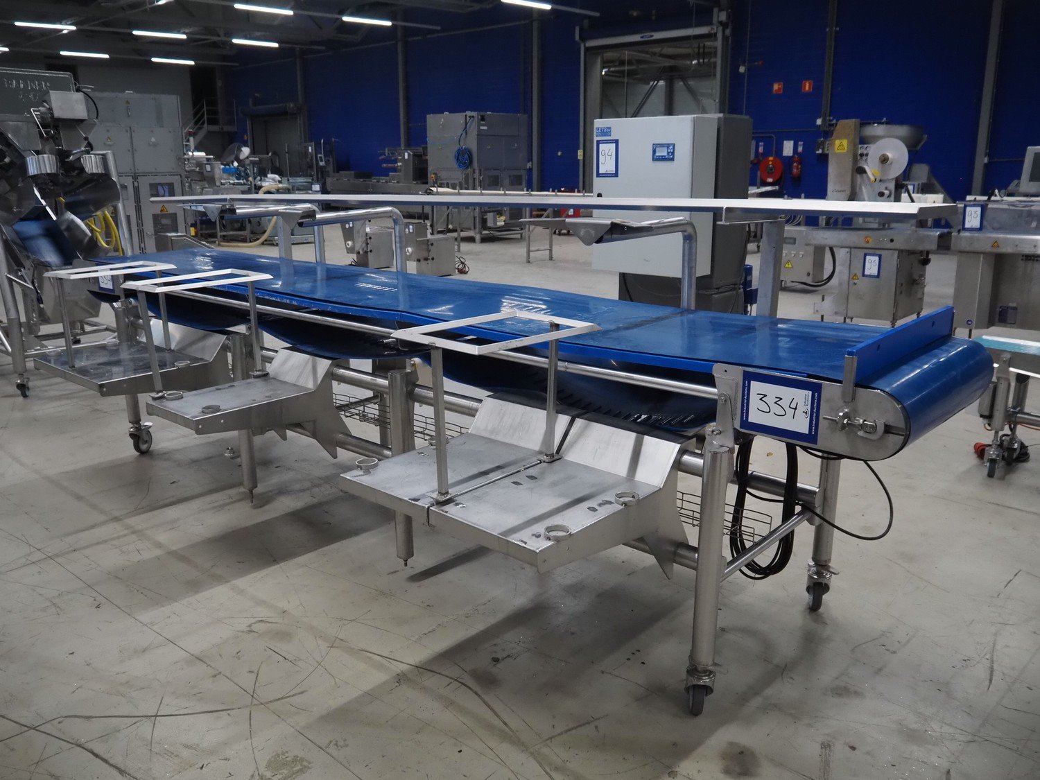 Mobile packaging belt, s/s frame, 3 stations, plastic belt, belt width: 660 mm, total dimensions: 4350 mm x 1300 mm x 1290 mm.