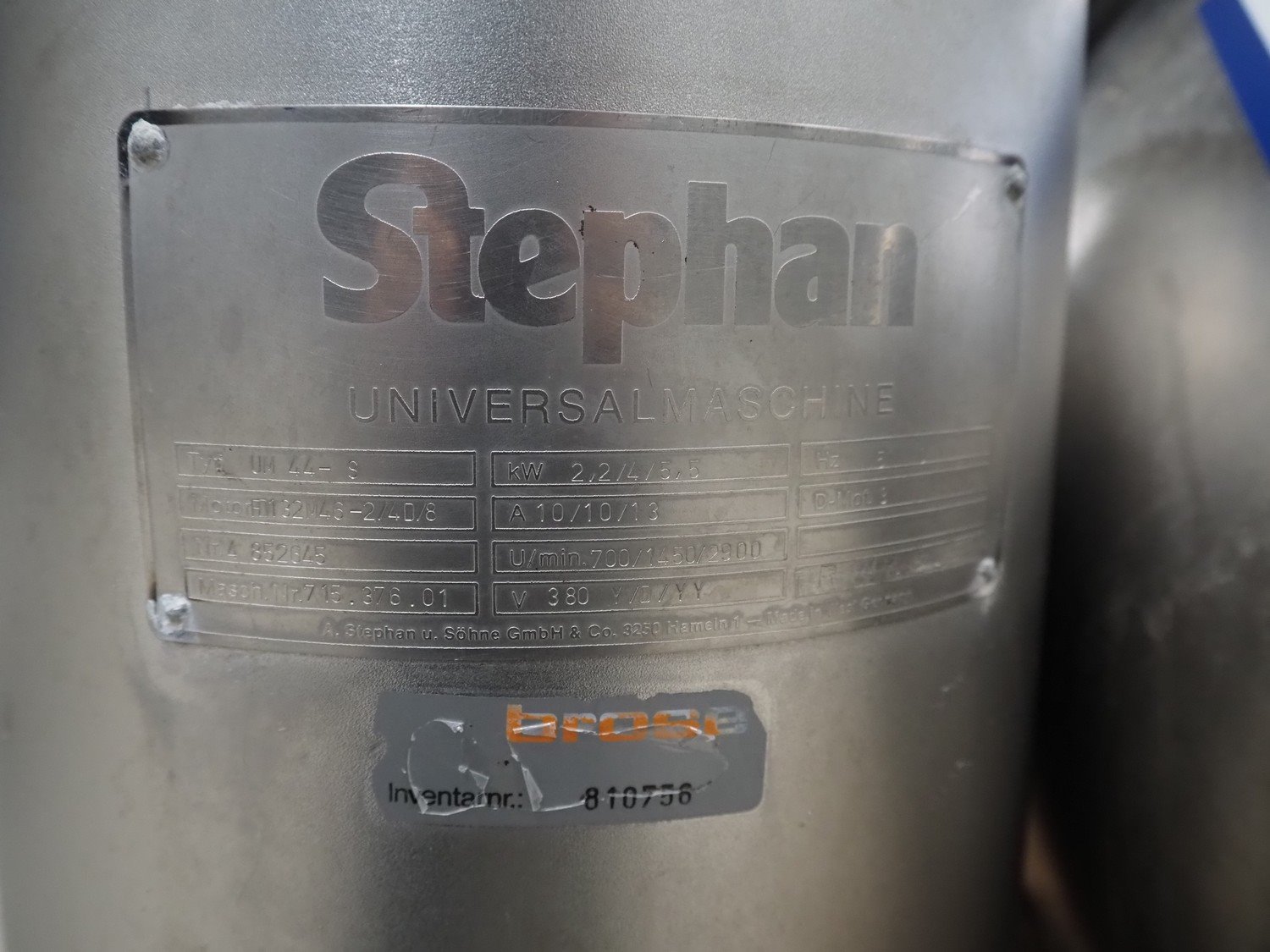Stephan universal machine, type: UM 44-S, number: 715.376.01, 380 V, 50 Hz, 10/13 A, 2.2/4/5.5 kW, volume: 44 liter, dimensions: 850 mm x 530 mm x 840 mm. Including pallet, dimensions: 1200 mm x 800 mm x 650 mm. Technical condition unknown.