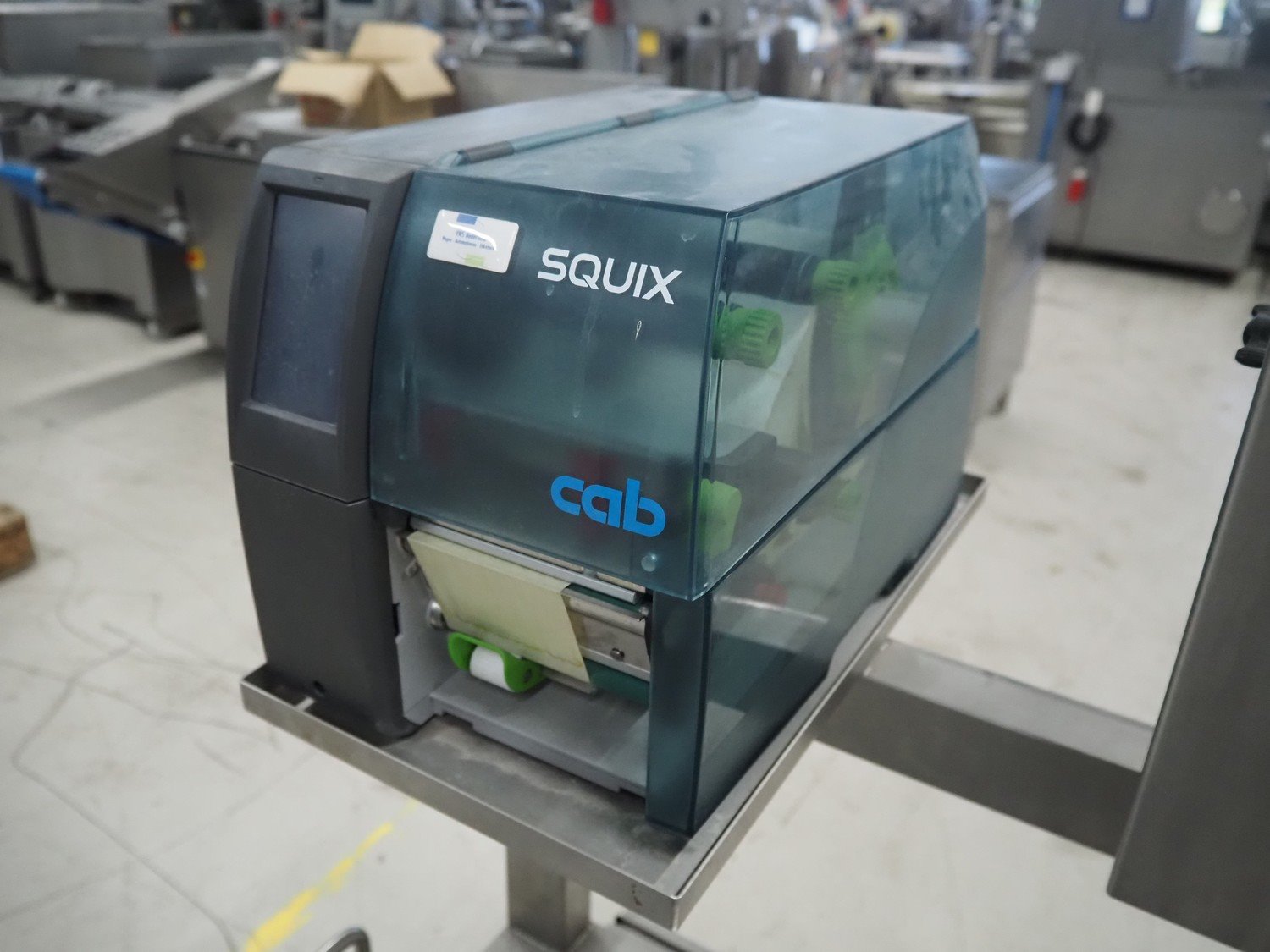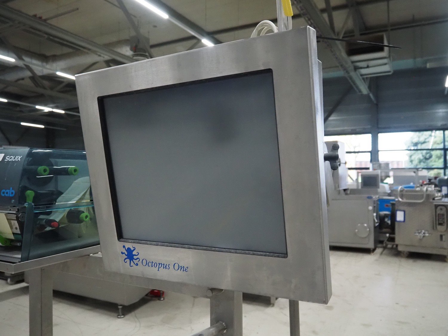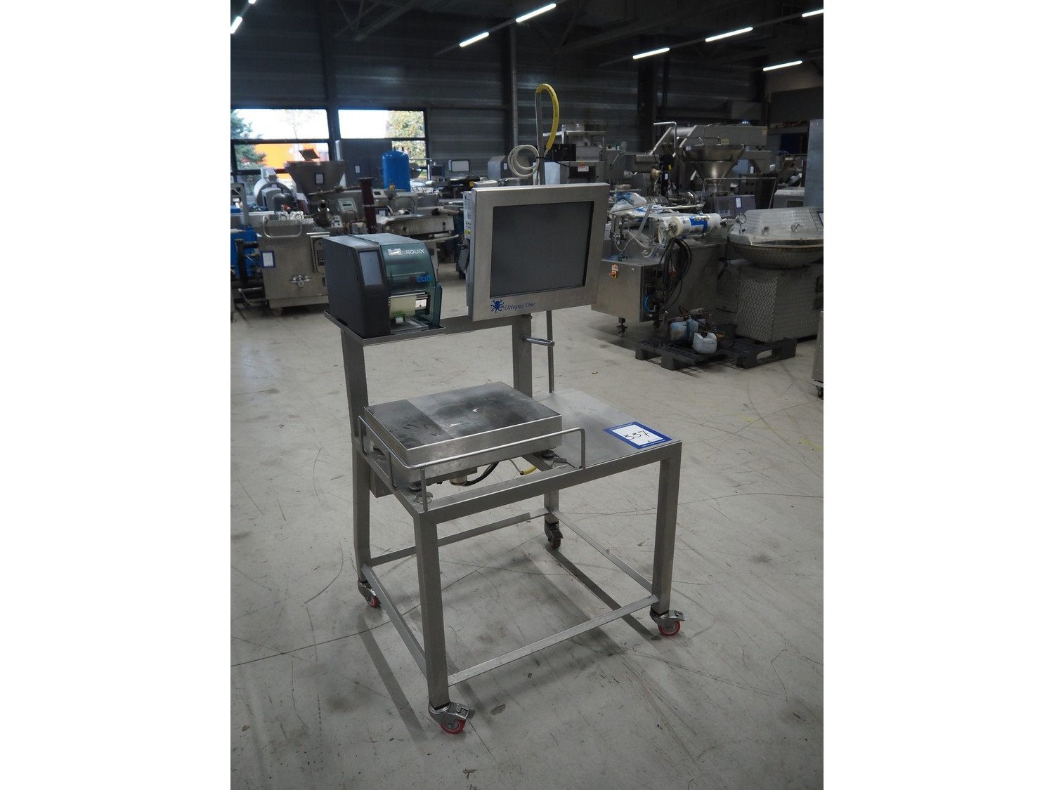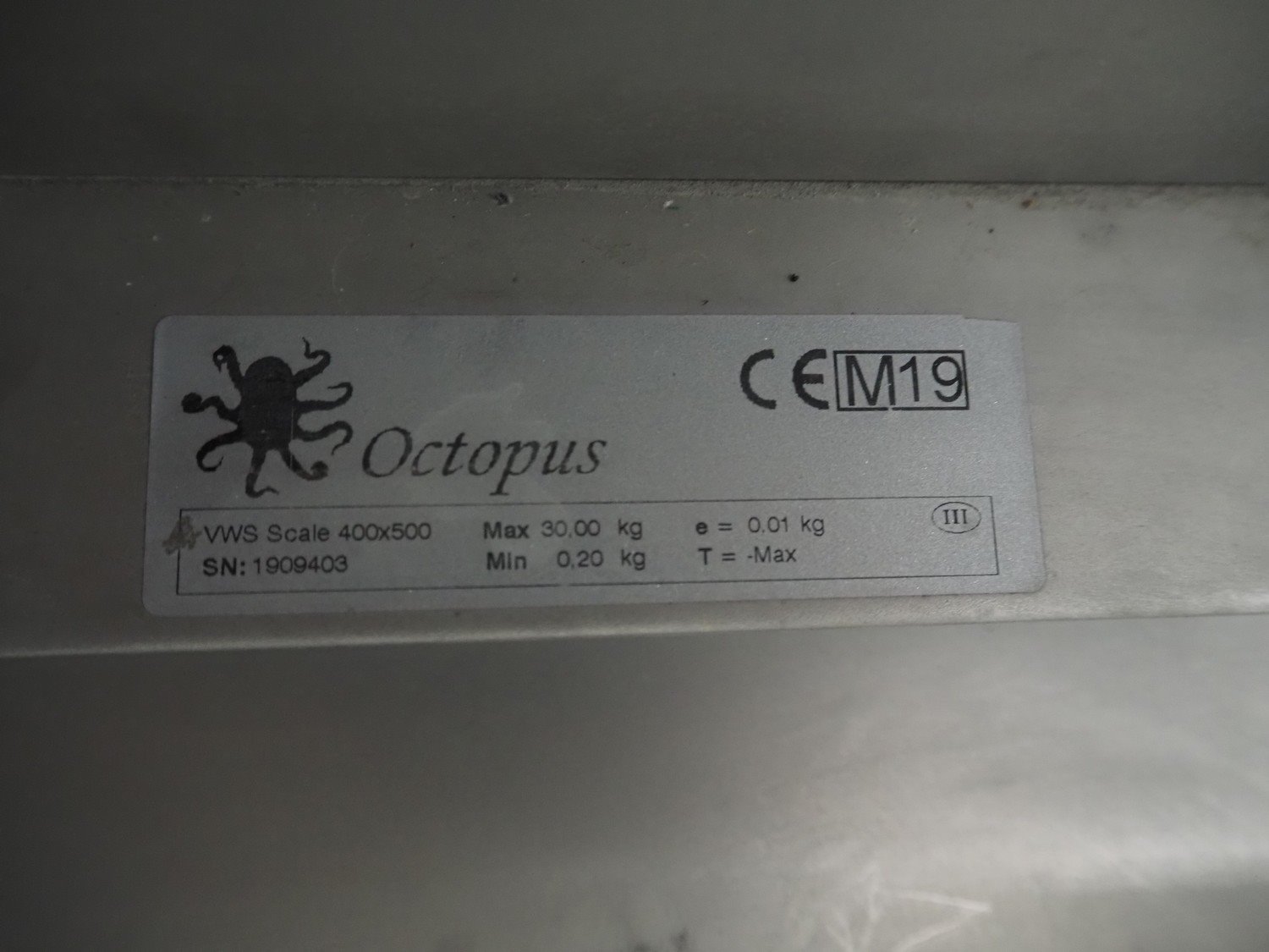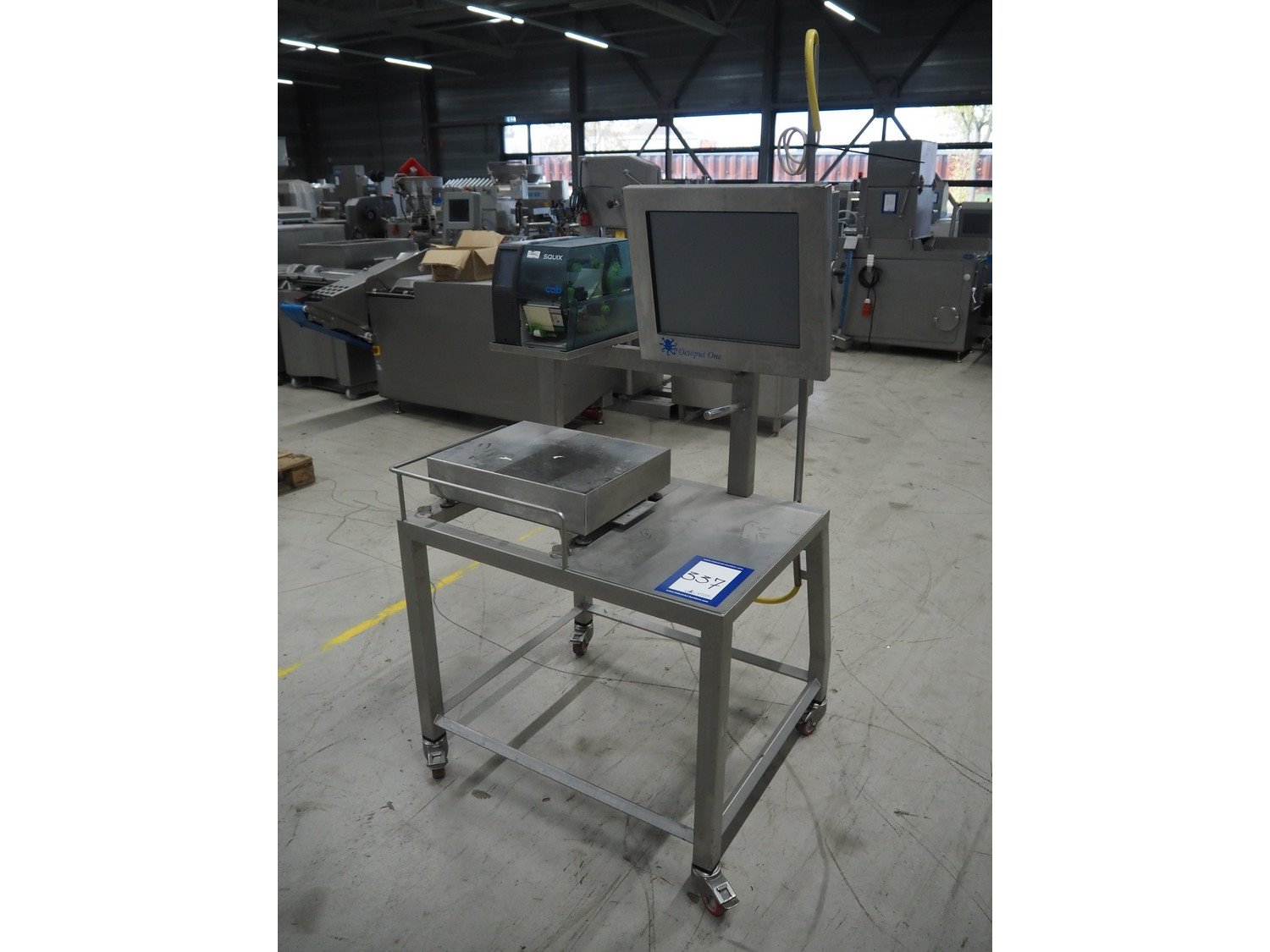 Octopus weiging scale with CAB label printer on s/s frame, type weighing scale: VWS Scale 400x500, serial number: 1909403, maximum weight: 30 kg, minimum weight: 0.20 kg, e= 0.01 kg, T= -30 kg, dimensions scale: 500 mm x 400 mm, serial number screen: 1909403, 110-240 V, 50-60 Hz, 600 mA, model CAB label printer: SQUIX 4.3/300P, serial number; 0038273, 100-240 V, 50-60 Hz, 2 A, total dimensions: 940 mm x 850 mm x 1900 mm.