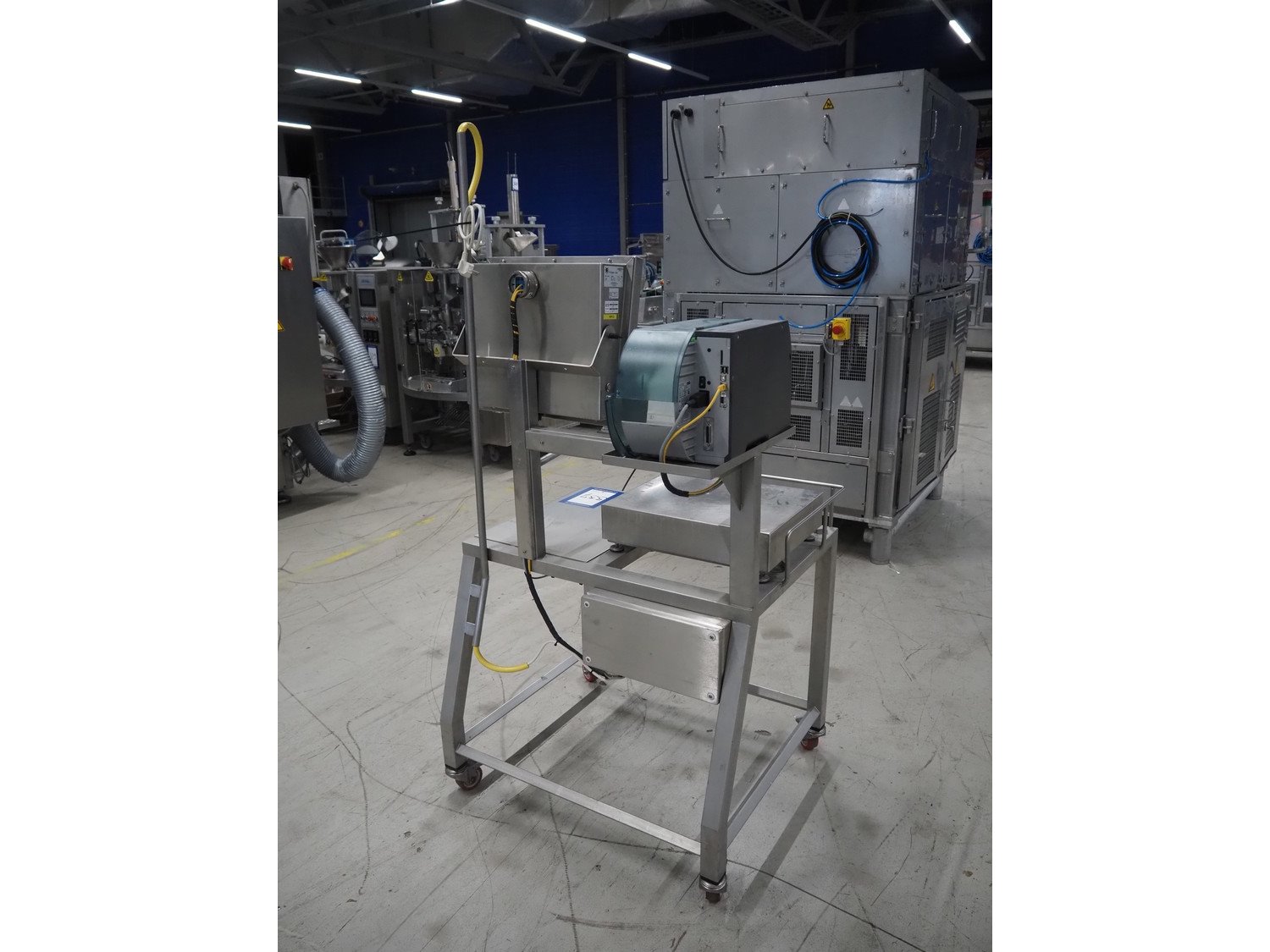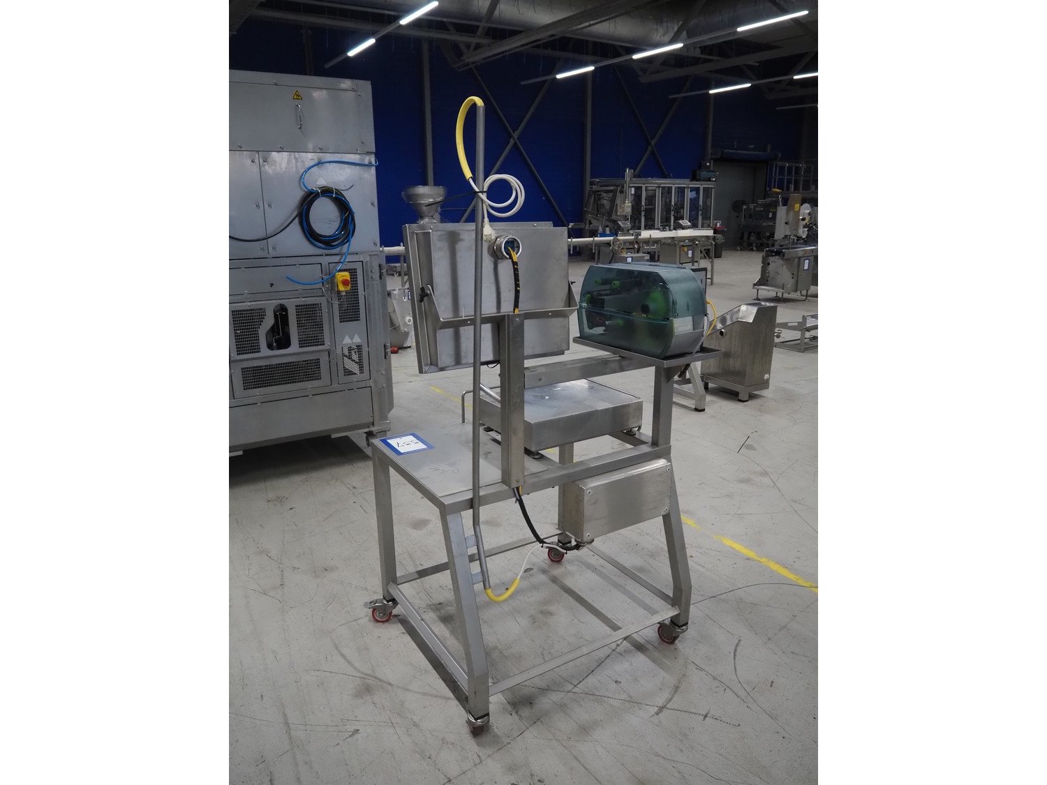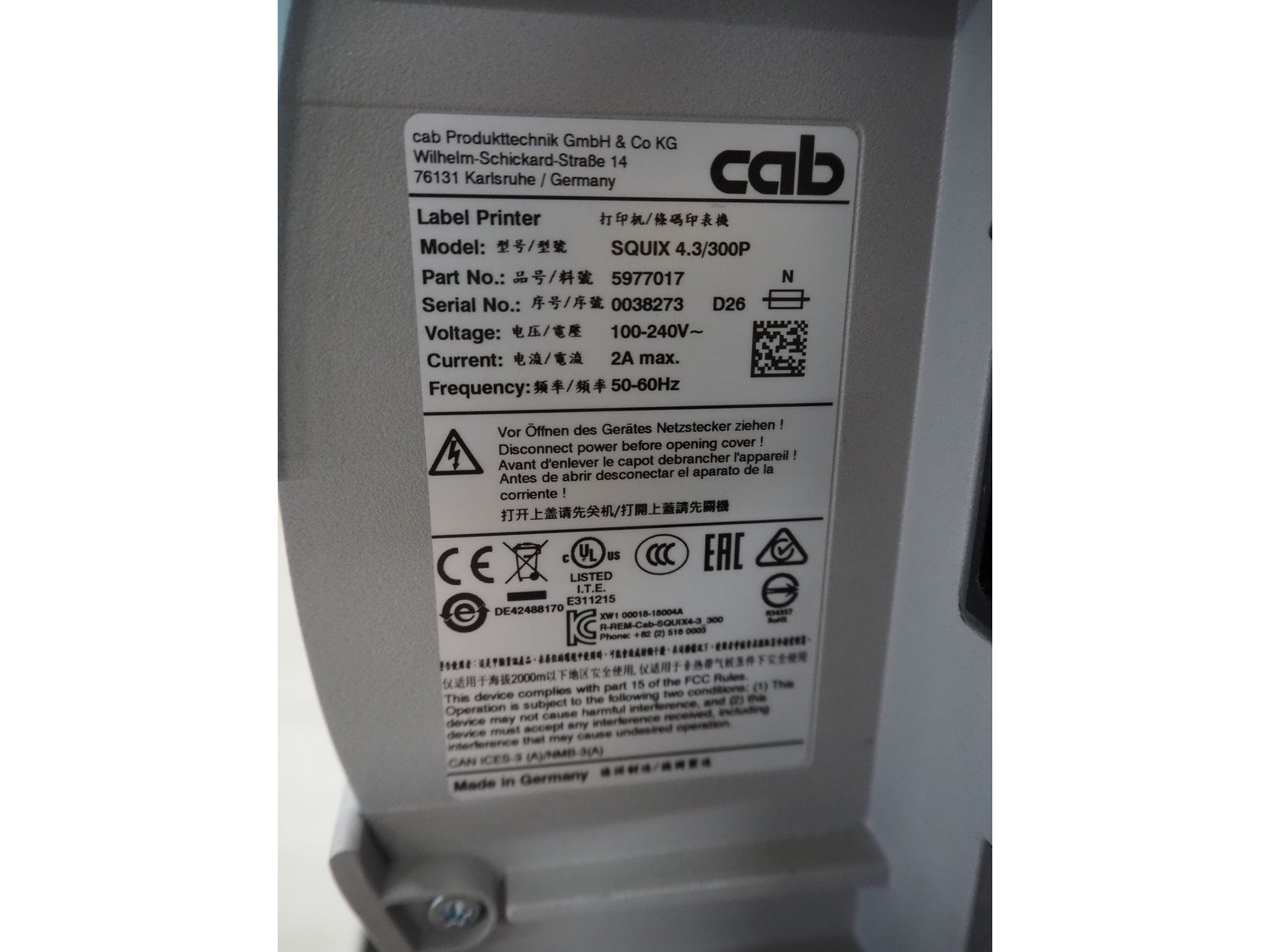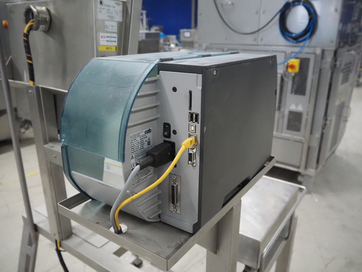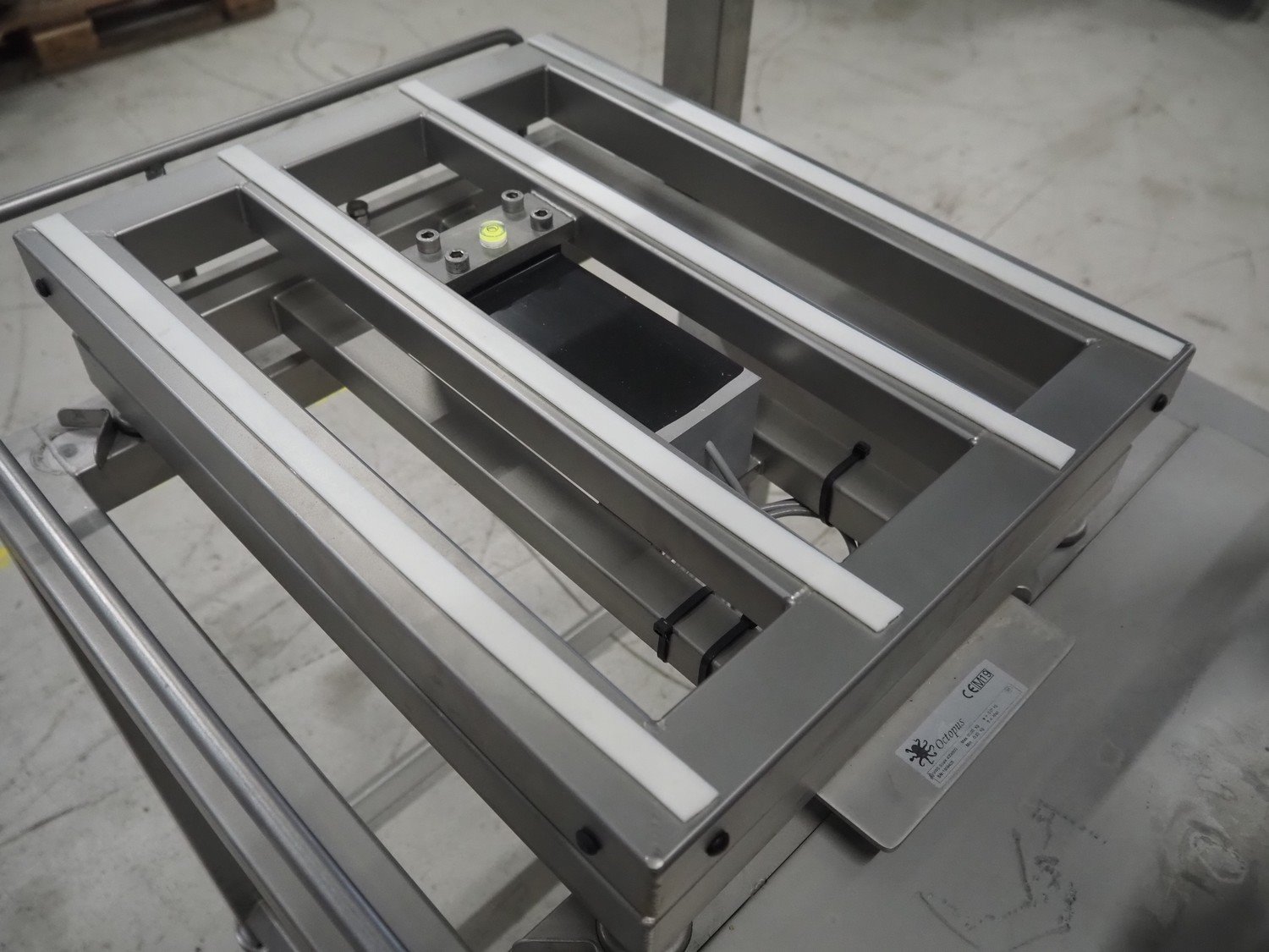 Octopus weiging scale with CAB label printer on s/s frame, type weighing scale: VWS Scale 400x500, serial number: 1909403, maximum weight: 30 kg, minimum weight: 0.20 kg, e= 0.01 kg, T= -30 kg, dimensions scale: 500 mm x 400 mm, serial number screen: 1909403, 110-240 V, 50-60 Hz, 600 mA, model CAB label printer: SQUIX 4.3/300P, serial number; 0038273, 100-240 V, 50-60 Hz, 2 A, total dimensions: 940 mm x 850 mm x 1900 mm.