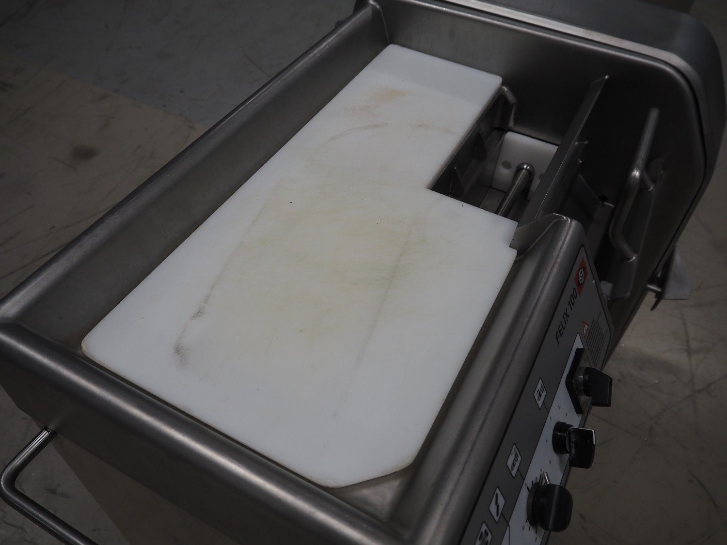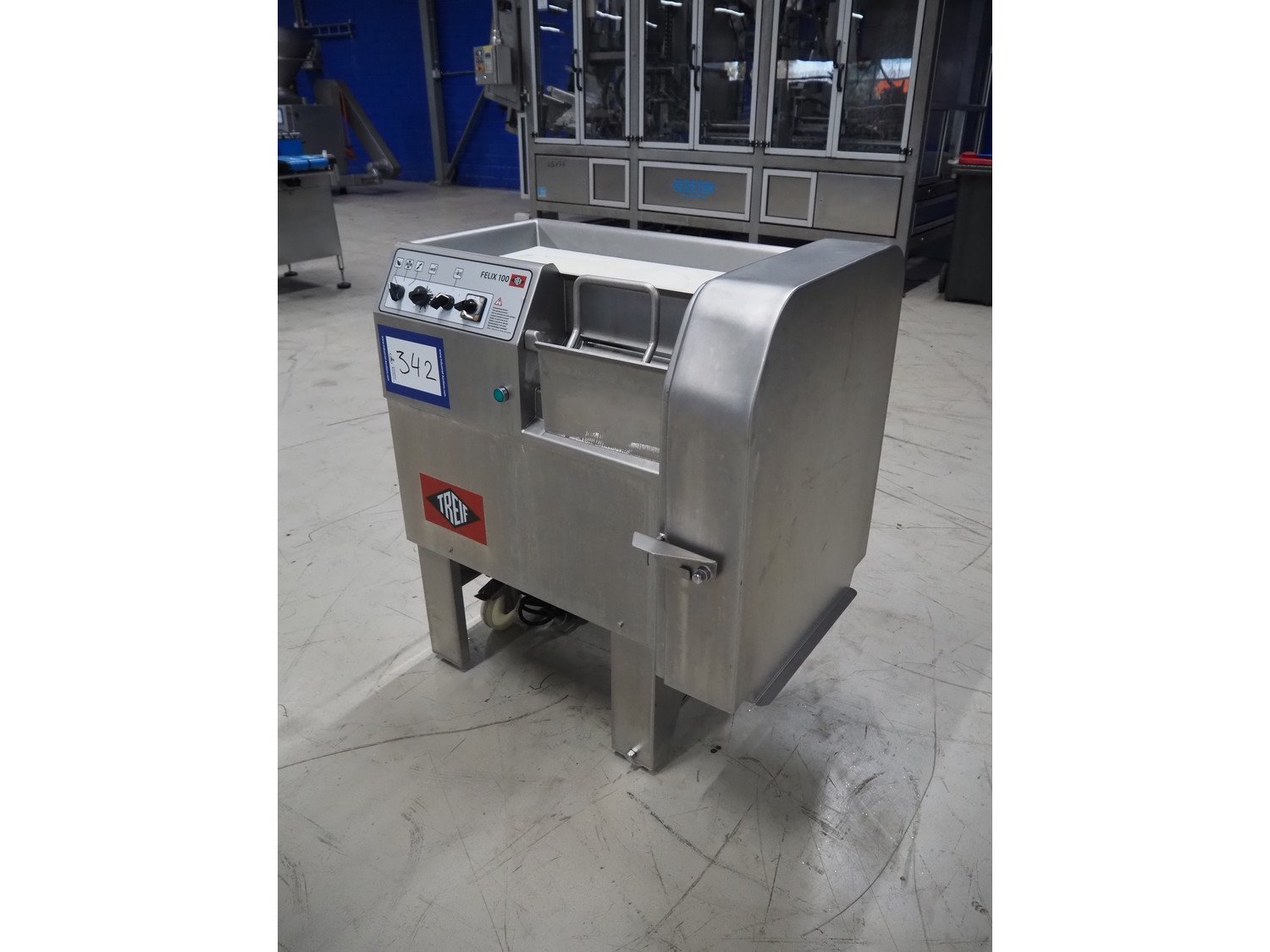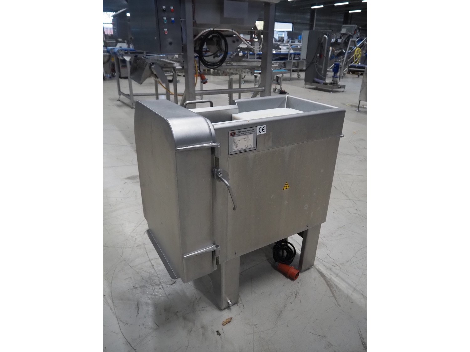 Treif Maschinenbau GmbH dicer, model: FELIX 100, machine number: 027115.208680.137985, year of construction: 2019, 230/400 V, 3 Ph, 50/60 Hz, 3/10 A, 1.36 kW, weight: 174 kg, dimensions chamber: 95 mm x 95 mm, total dimensions: 980 mm x 620 mm x 1020 mm. Without grids.