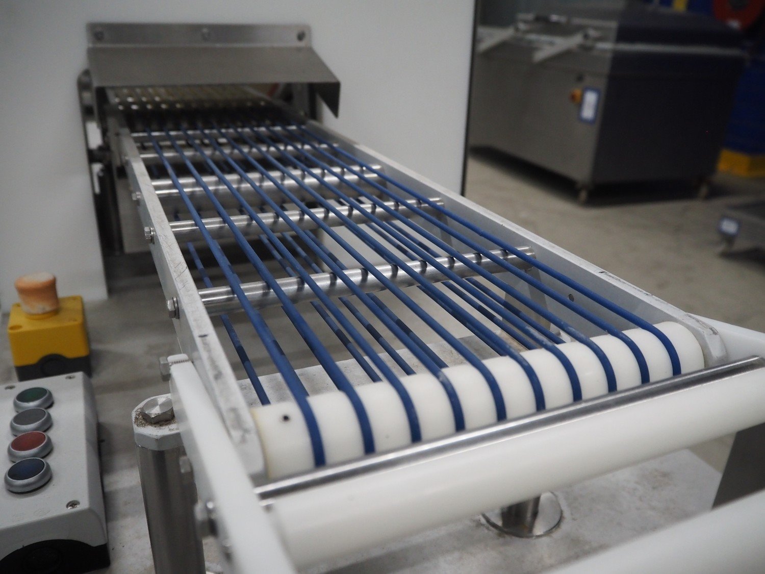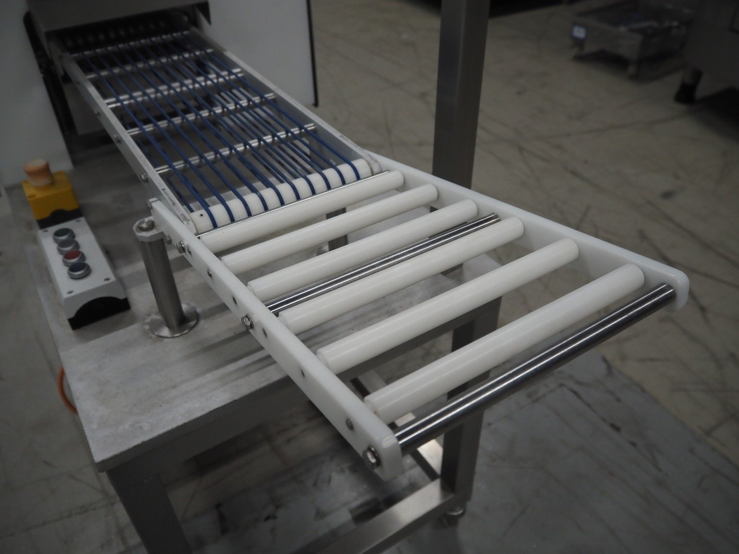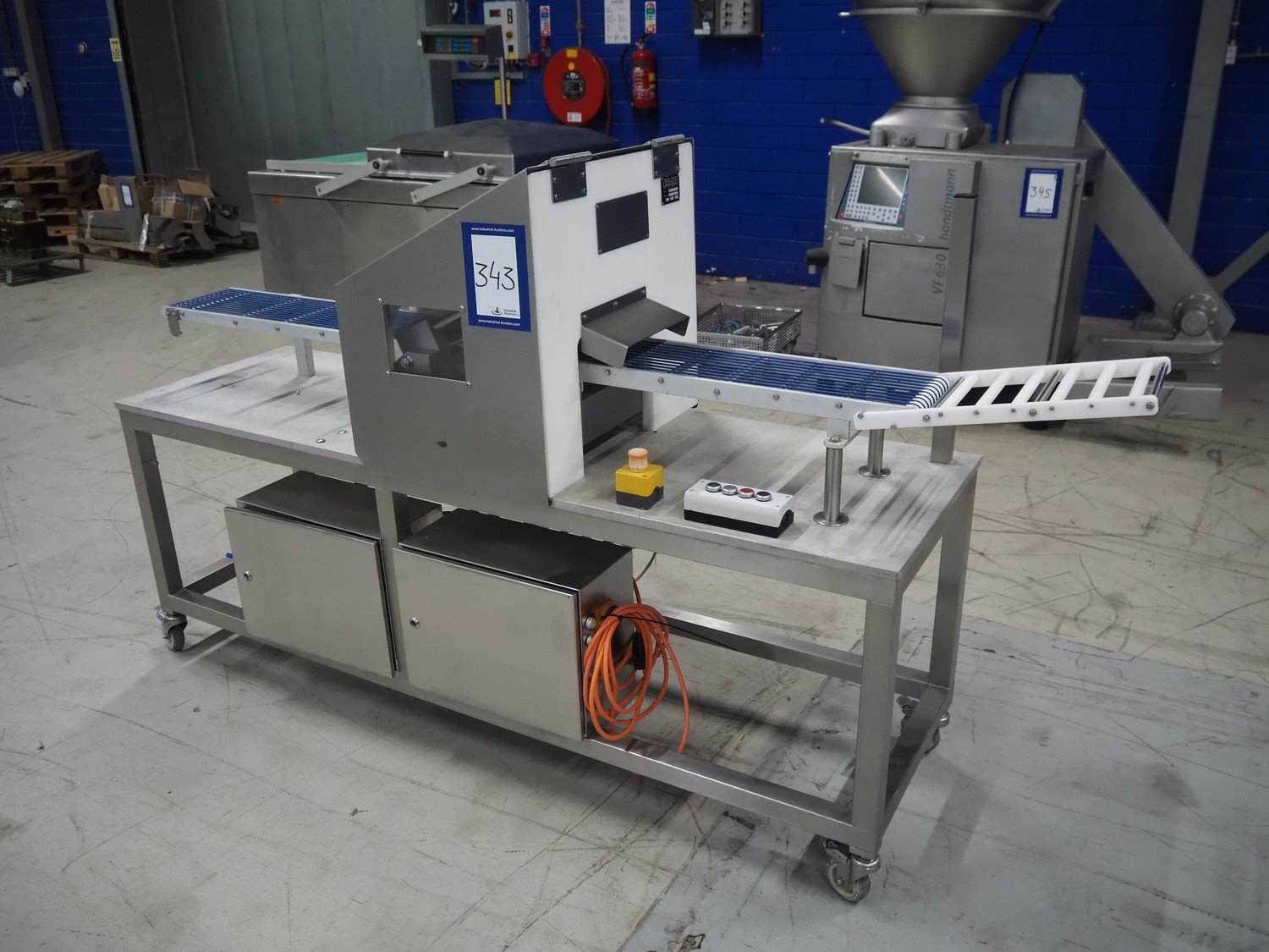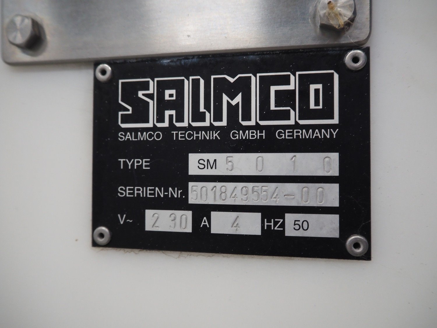 Salmco Technik GmbH mobile salmon slicer, type: SM 5010, serial number: 501849554-00, 230 V, 50 Hz, 4 A, plastic string belt, belt width: 250 mm, total dimensions: 2200 mm x 670 mm x 1400 mm.