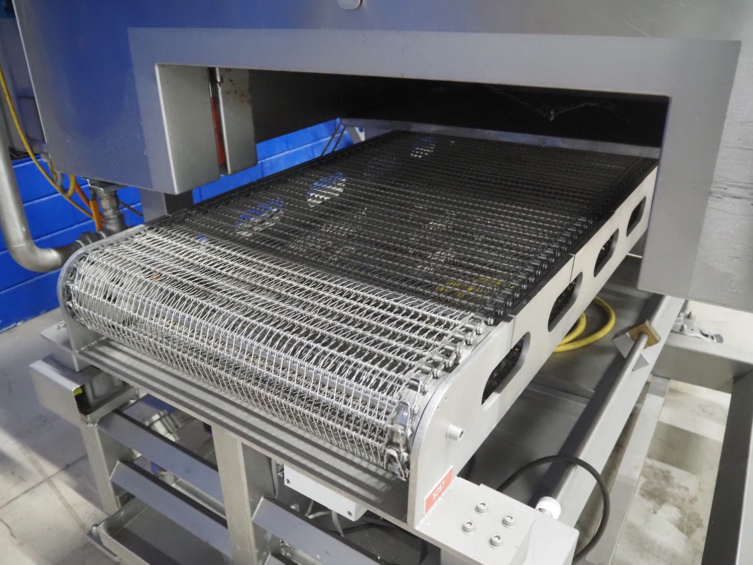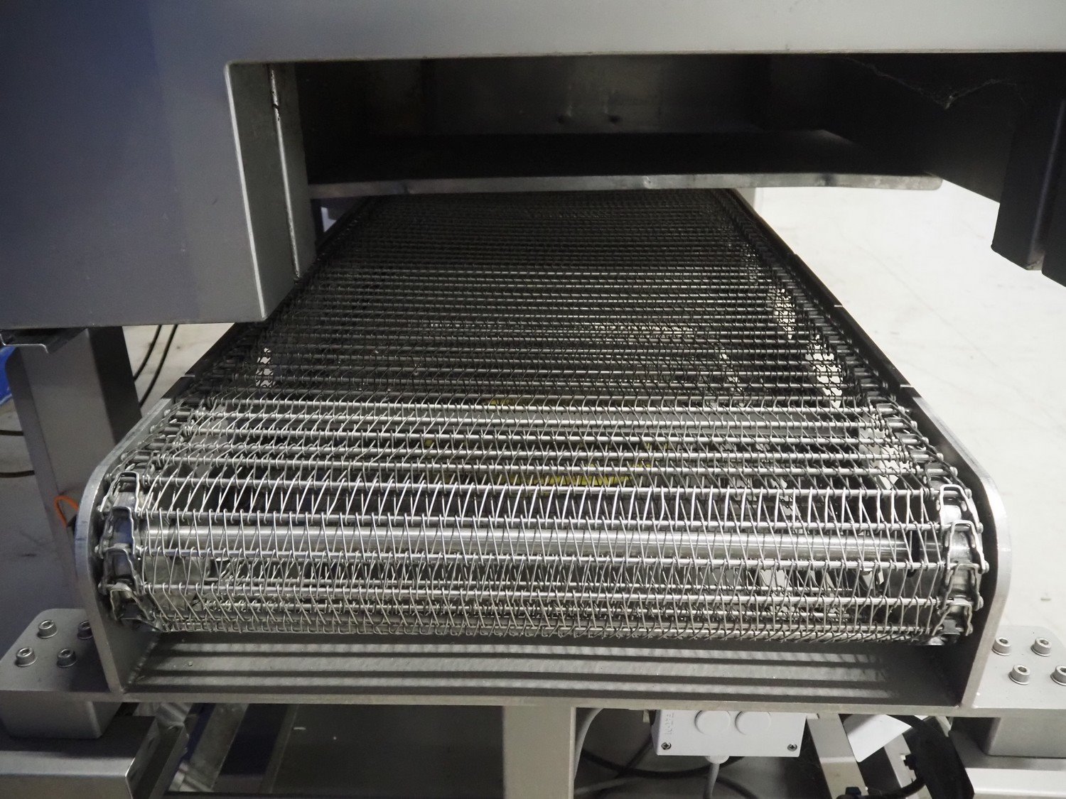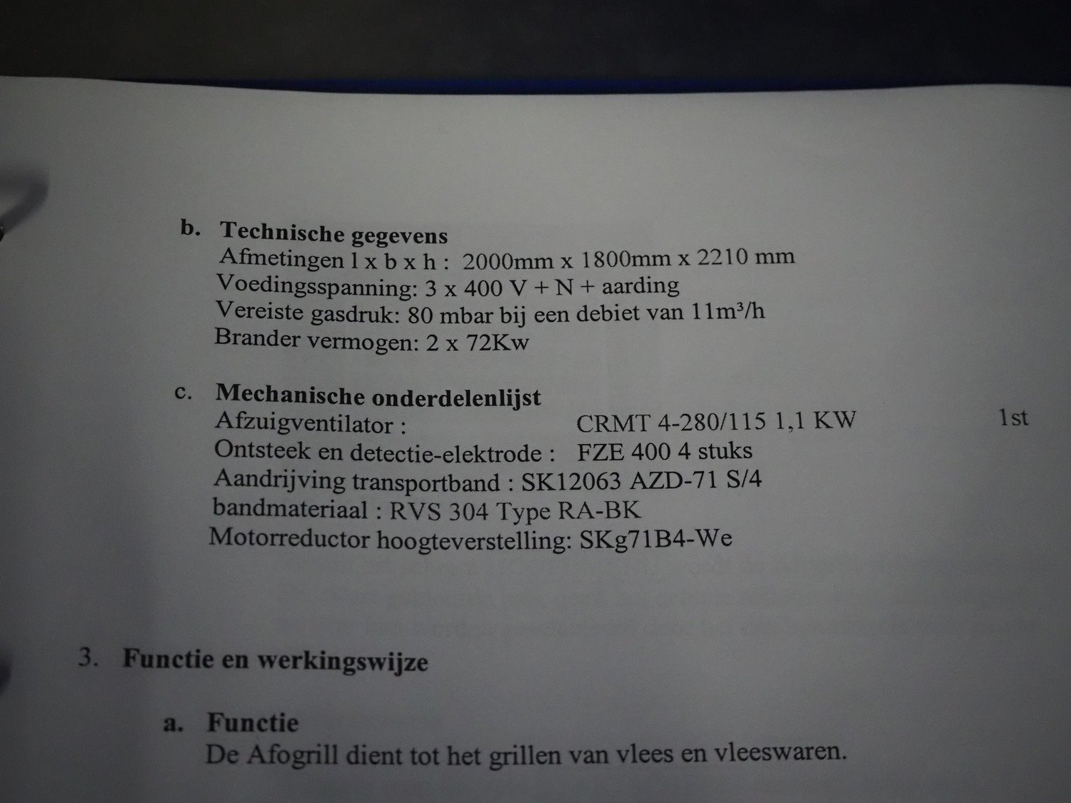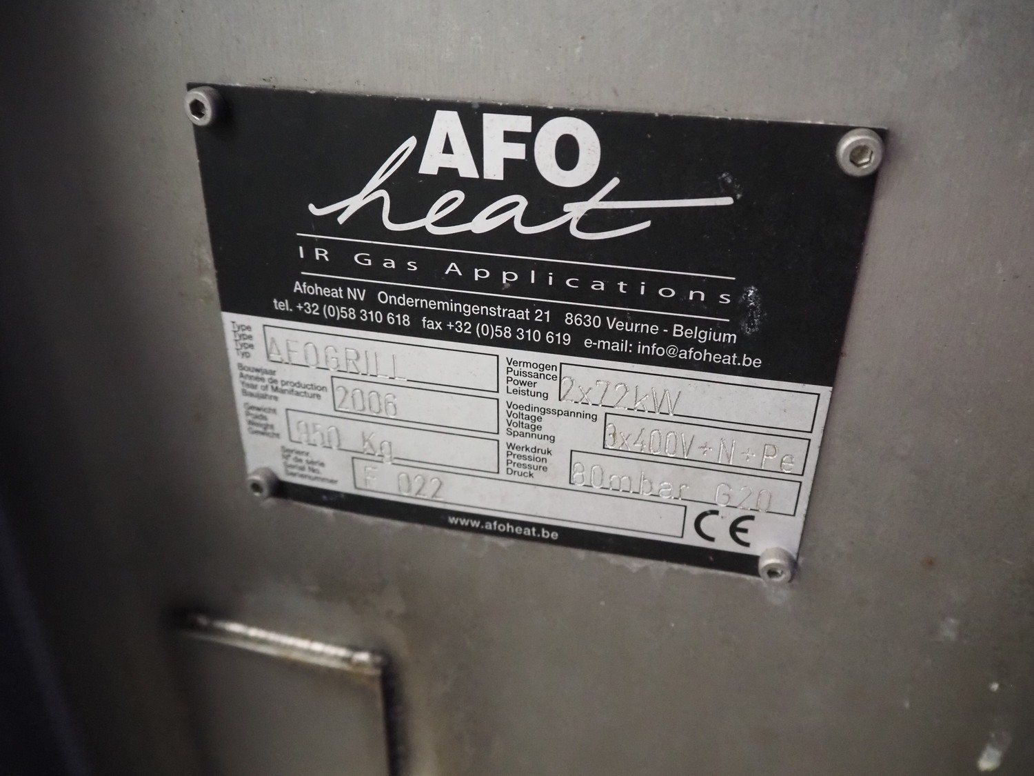 AFO Heat grill, type: AFOGRILL, serial number: F 022, year of construction: 2006, 400 V, 3 Ph, (2x) 72 kW, weight: 950 kg, s/s mesh belt, belt width: 630 mm, clearance: 700 mm x 220 mm, total dimensions: 2350 mm x 1800 mm x 2210 mm.