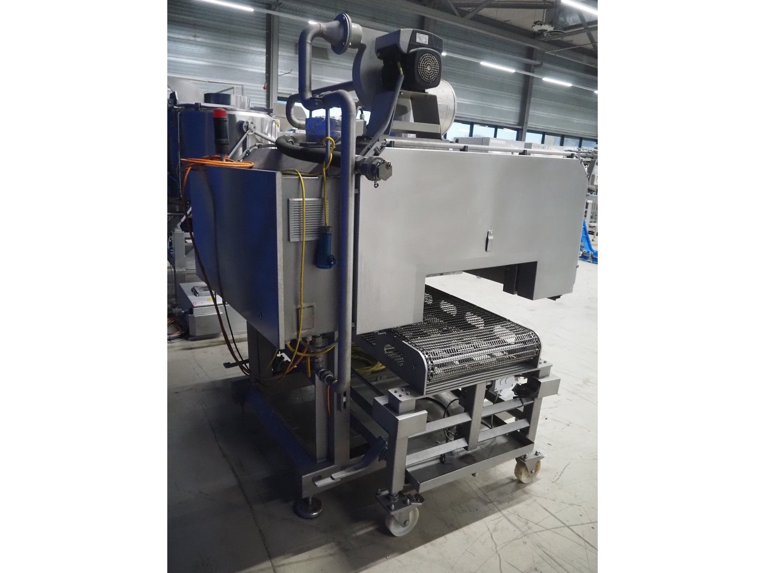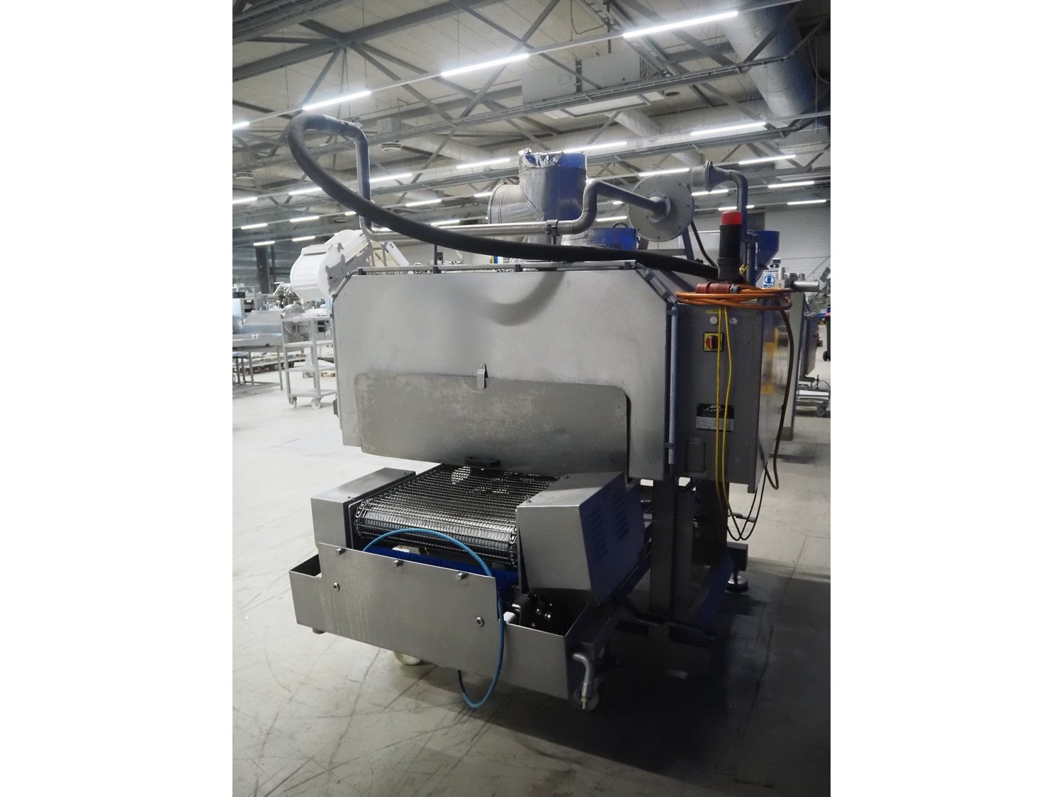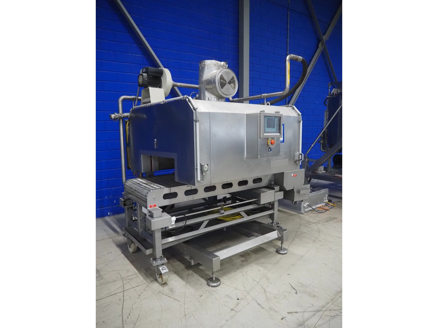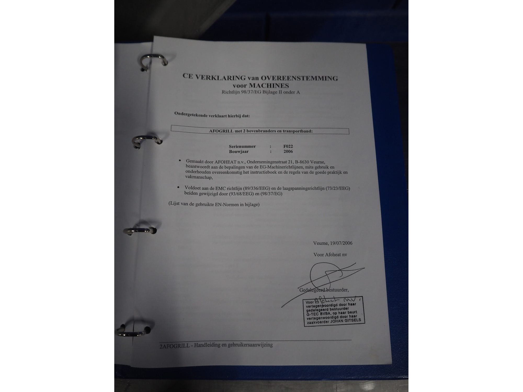 AFO Heat grill, type: AFOGRILL, serial number: F 022, year of construction: 2006, 400 V, 3 Ph, (2x) 72 kW, weight: 950 kg, s/s mesh belt, belt width: 630 mm, clearance: 700 mm x 220 mm, total dimensions: 2350 mm x 1800 mm x 2210 mm.