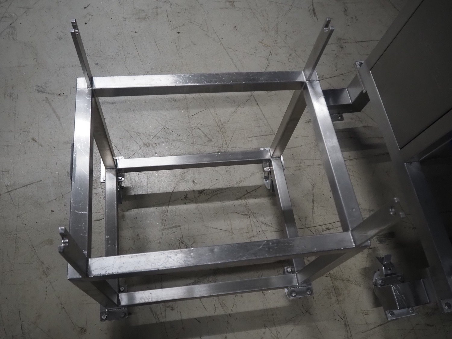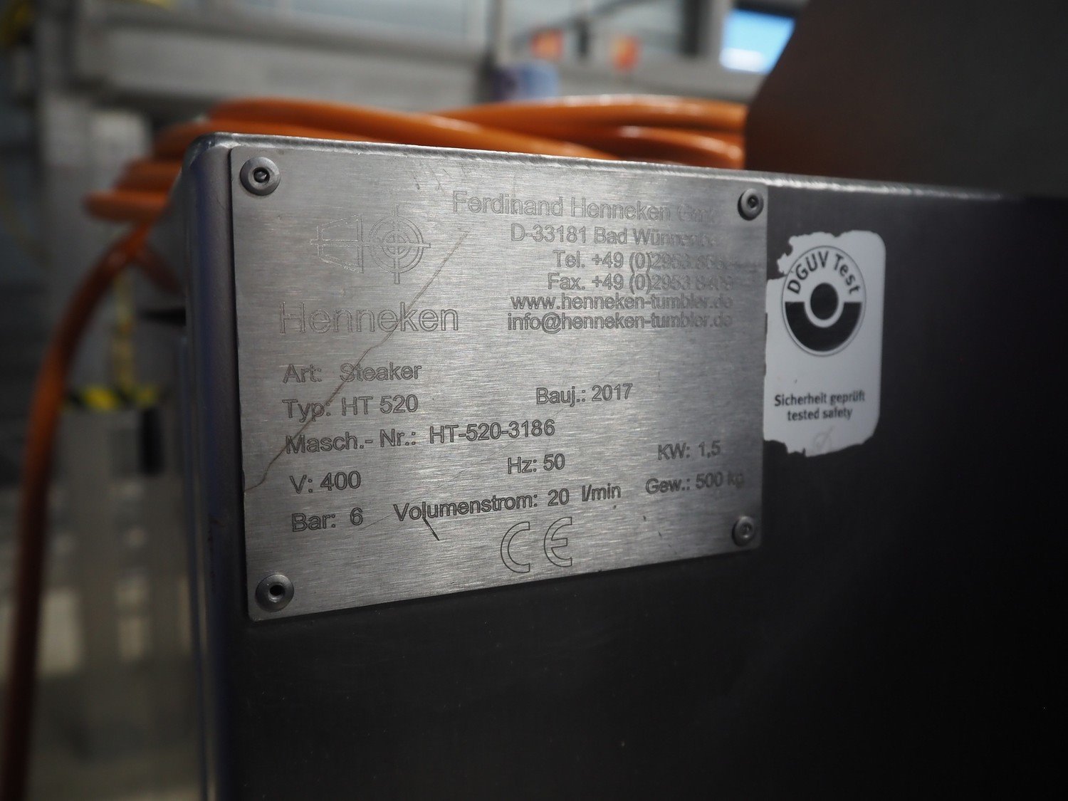Henneken mobile steaker, type: HT 520, machine number: HT-520-3186, year of construction: 2017, 400 V, 50 Hz, 1.5 kW, 6 bar, 20 liter per minute, weight: 500 kg, plastic belt, belt width: 515 mm, working width: 500 mm, total dimensions: 1800 mm x 1200 mm x 1700 mm, including tool trolley, dimensions: 660 mm x 520 mm x 820 mm.