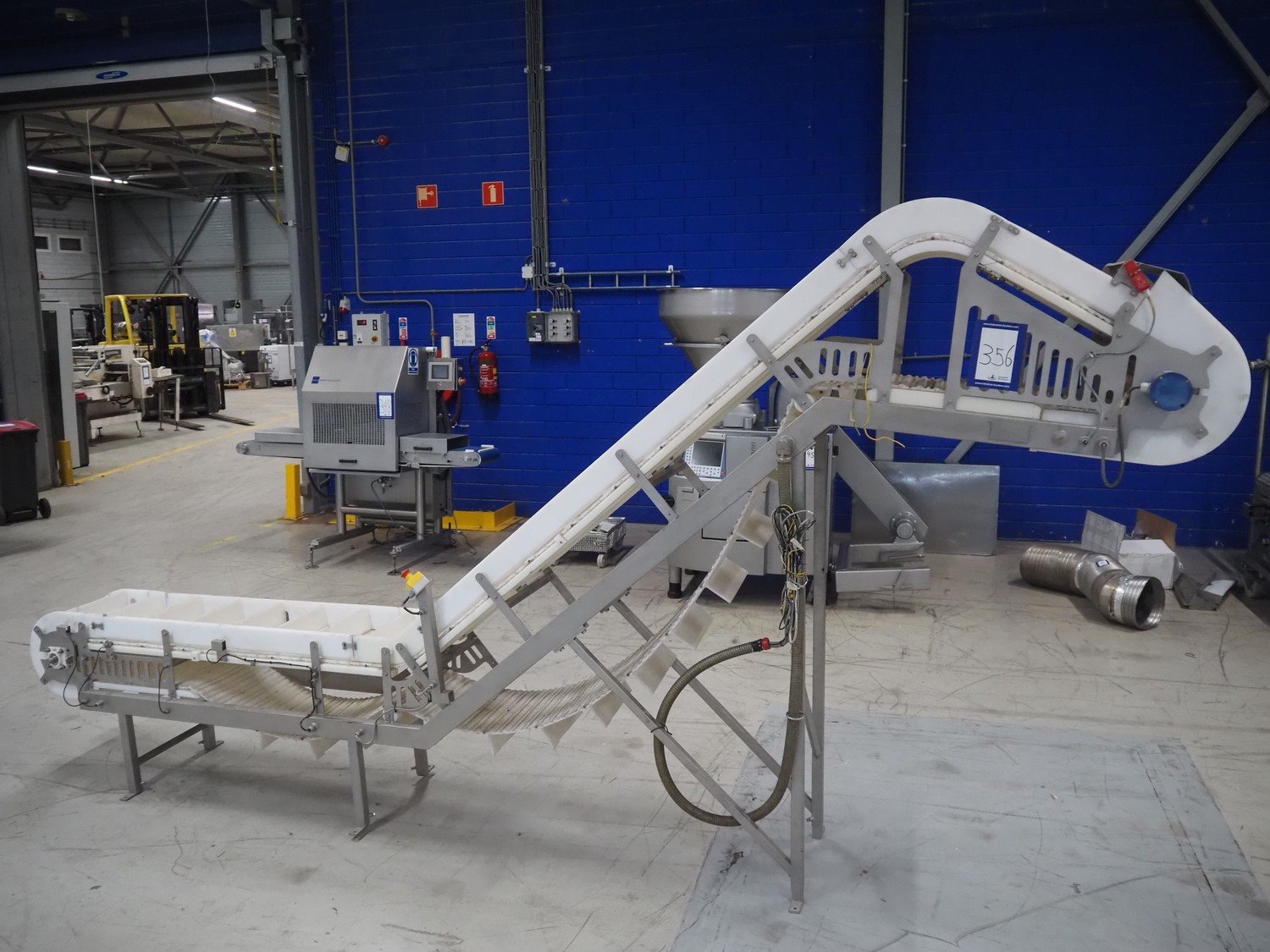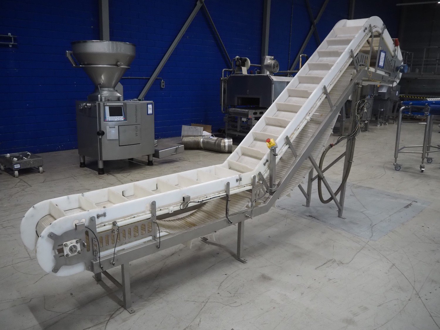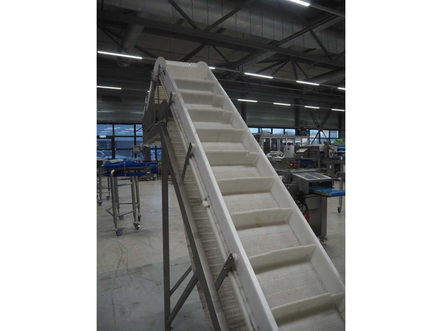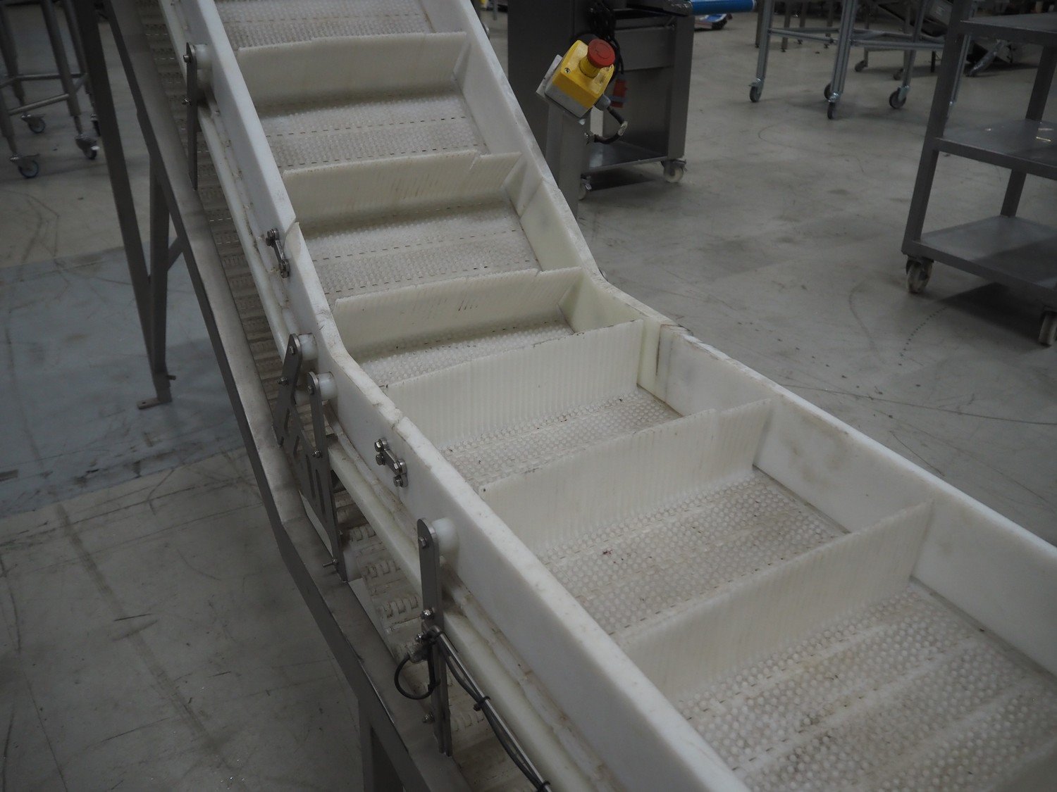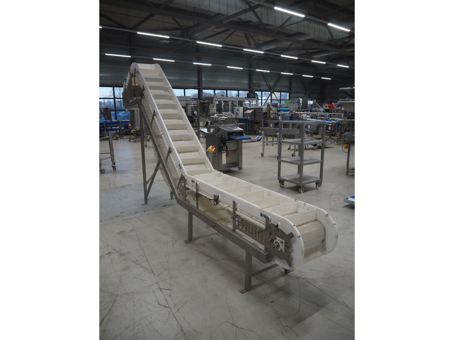 Scanvaegt elevating belt, type: 100346, year of construction: 06.02.10, s/s frame, plastic belt with dividers, belt width: 350 mm, distance between dividers: 200 mm, divider height: 100 mm, elevating height: 1800 mm, total dimensions: 4500 mm x 600 mm x 2300 mm.