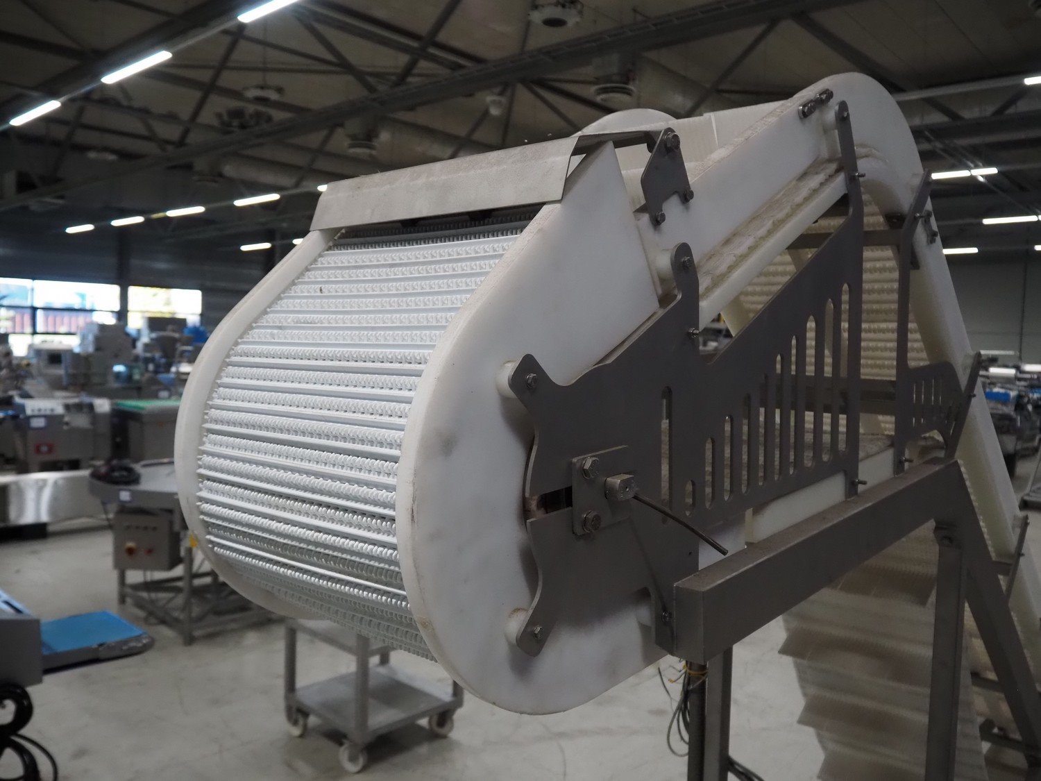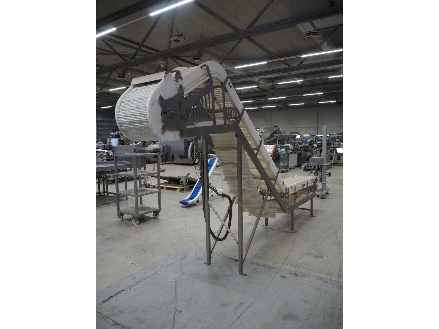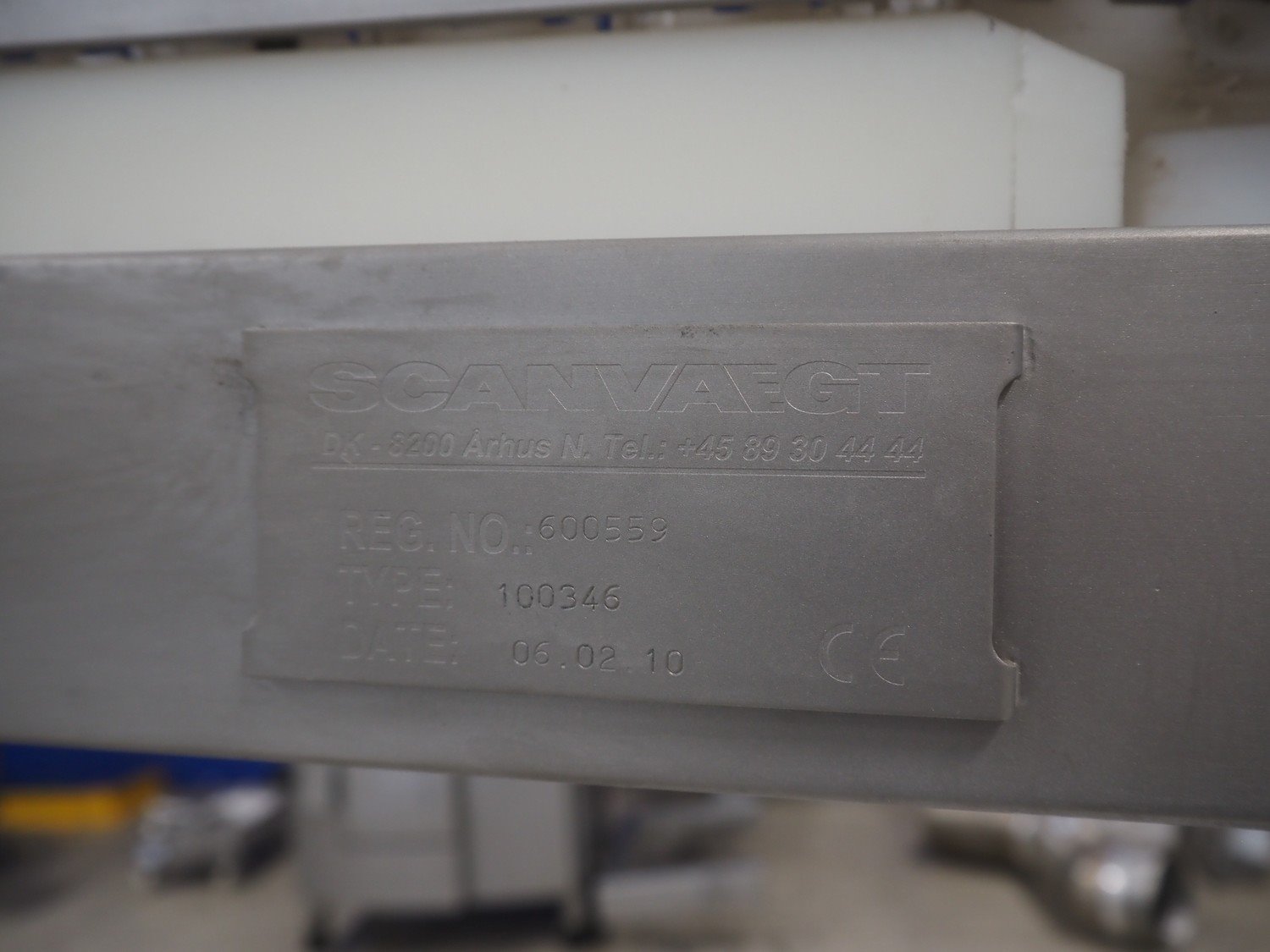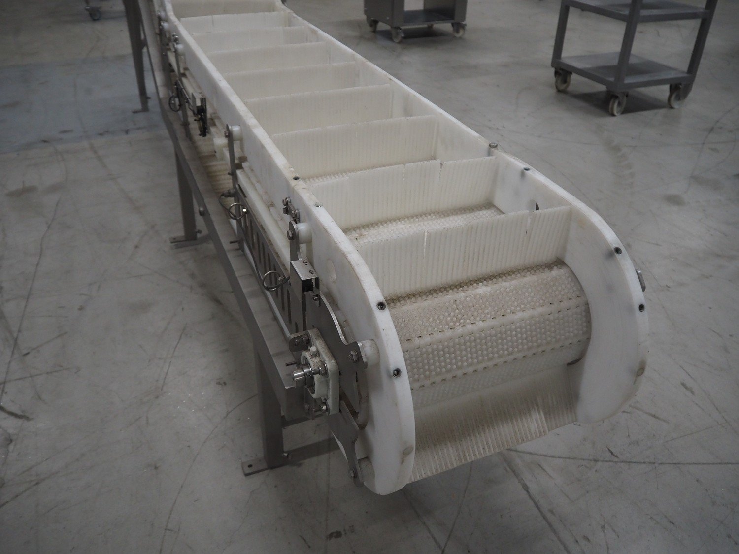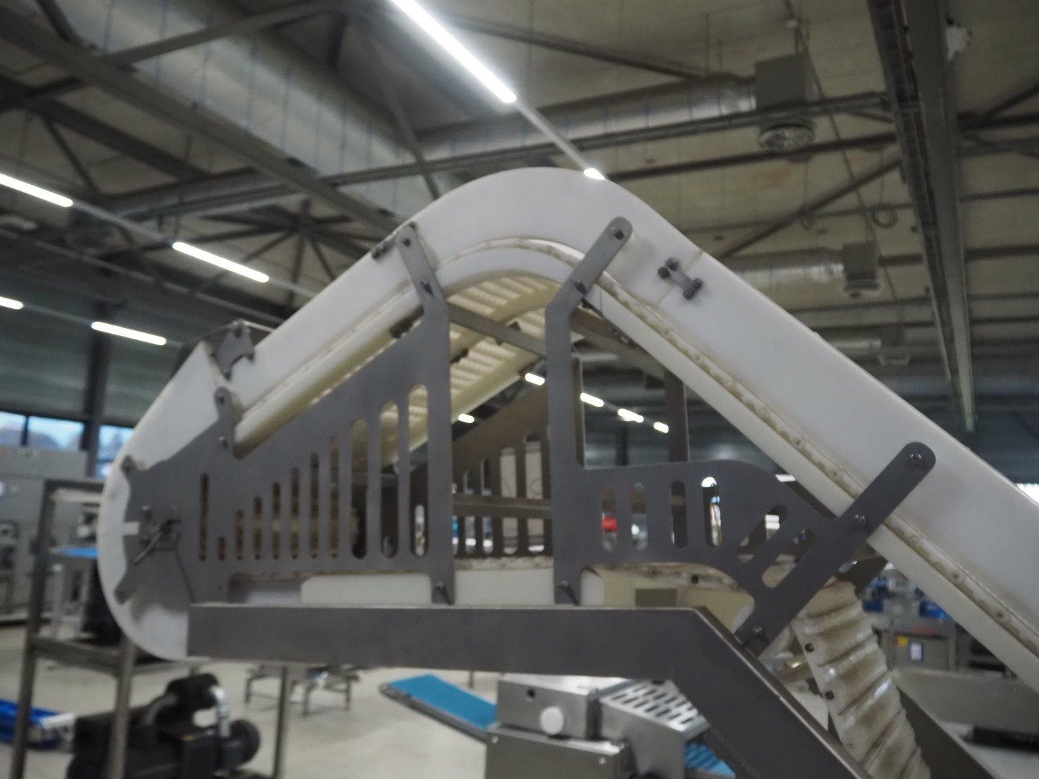 Scanvaegt elevating belt, type: 100346, year of construction: 06.02.10, s/s frame, plastic belt with dividers, belt width: 350 mm, distance between dividers: 200 mm, divider height: 100 mm, elevating height: 1800 mm, total dimensions: 4500 mm x 600 mm x 2300 mm.