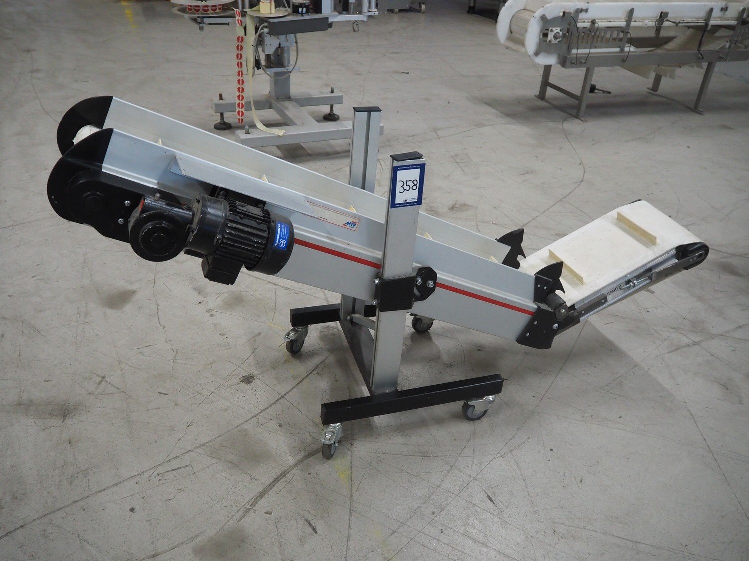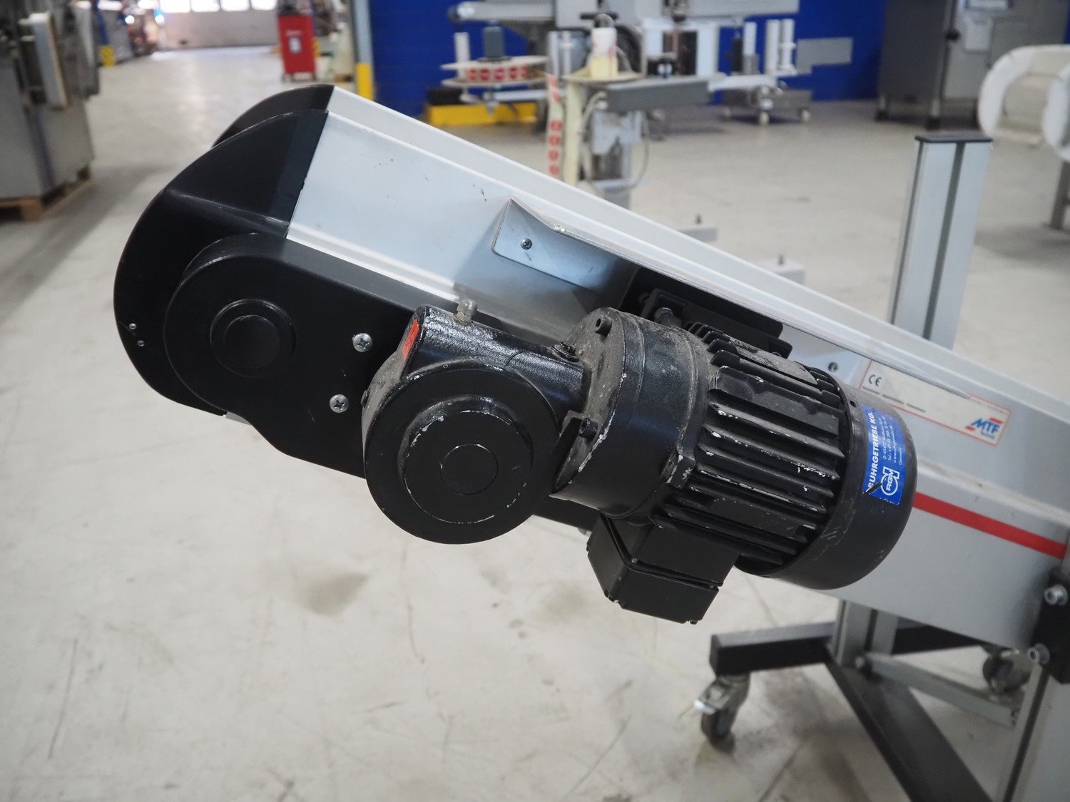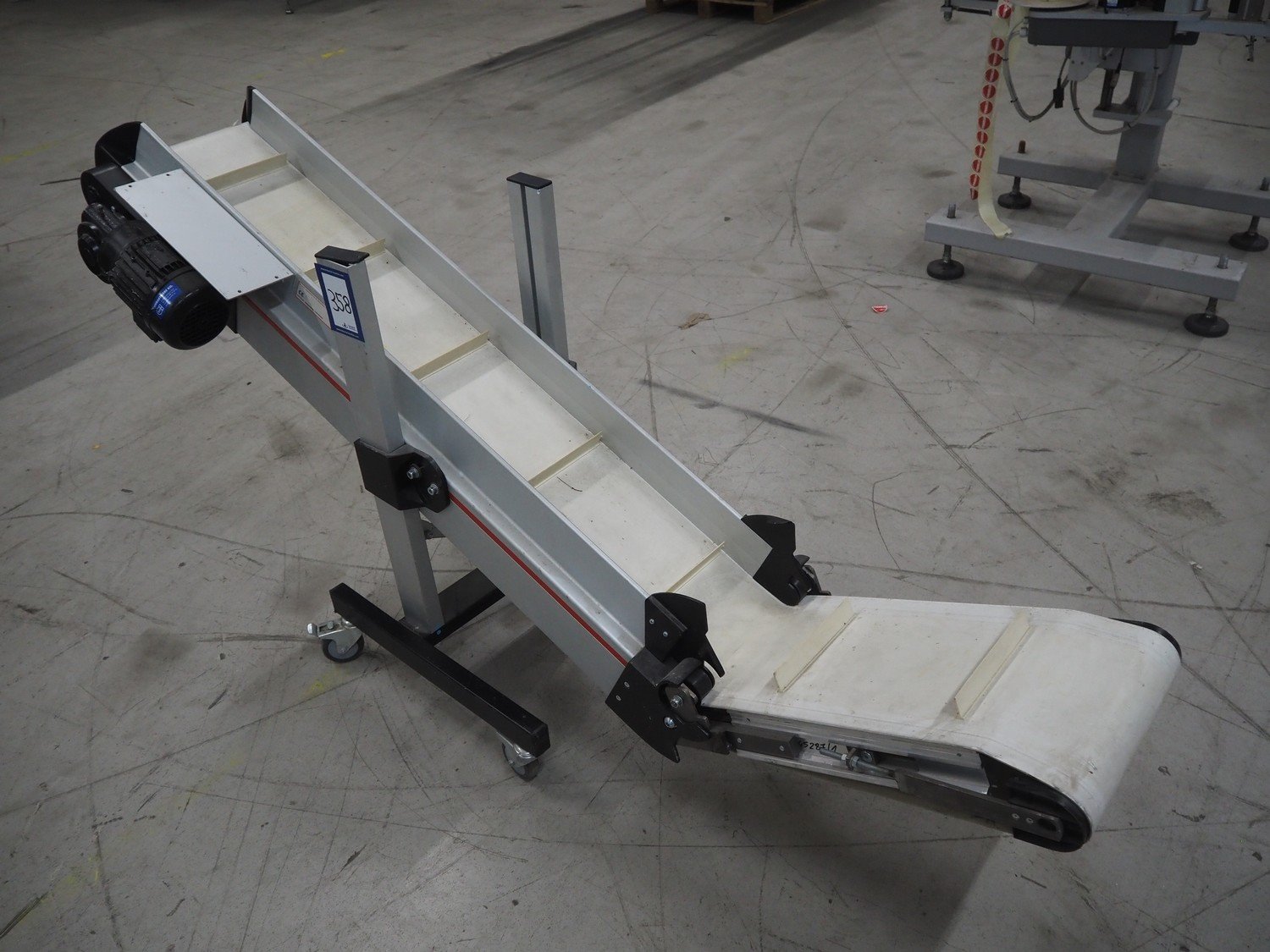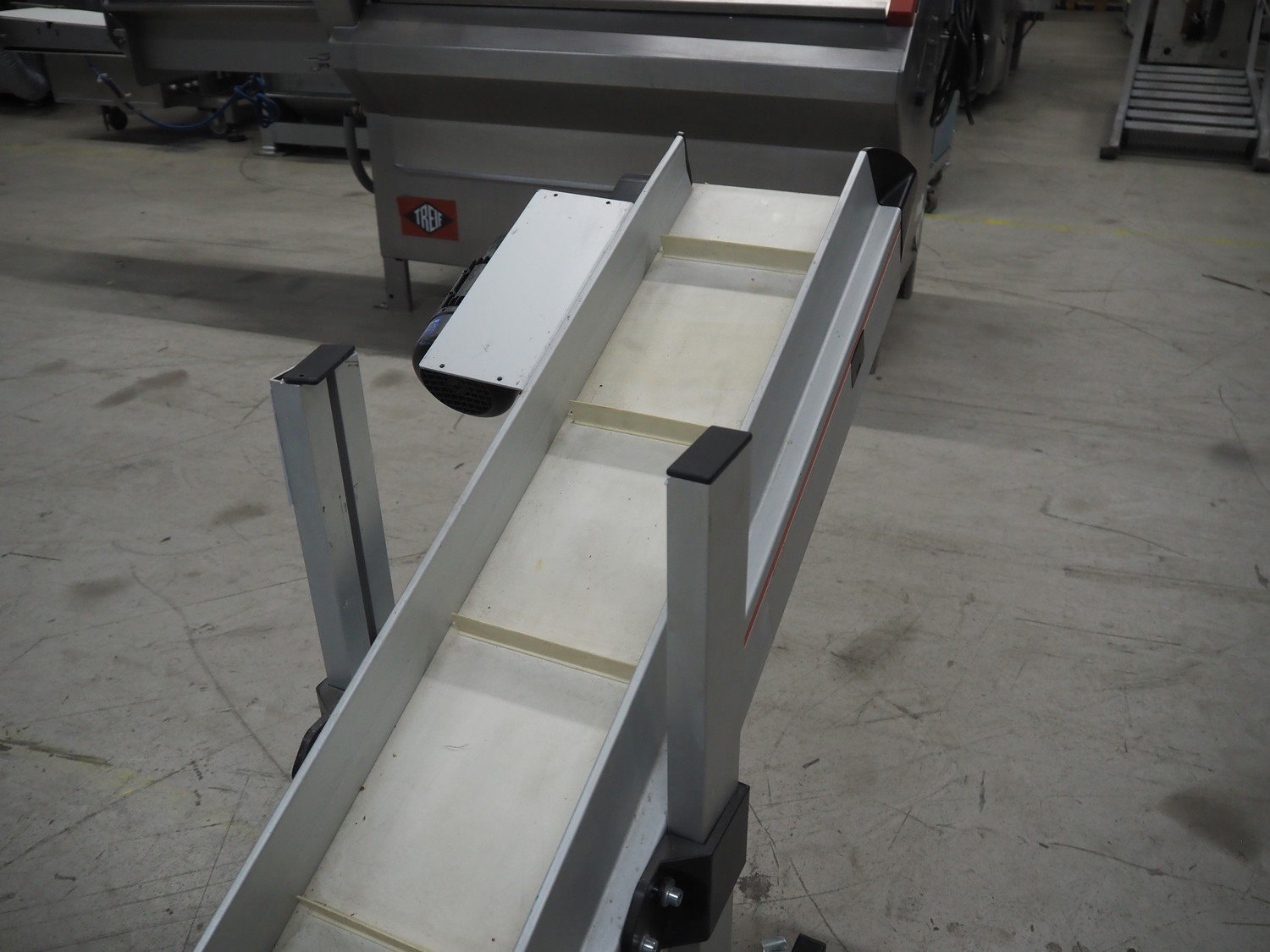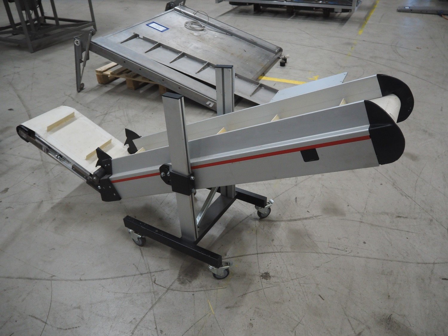 MTF Technik mobile elevating belt, s/s frame, type: NL-HE 020, number: 21257, year of construction: 2011, 230 V, 50 Hz, plastic belt with dividers, belt width: 200 mm, divider height: 30 mm, distance between dividers: 340 mm, elevating height: 800 mm, total dimensions: 1750 mm x 500 mm x 800 mm.