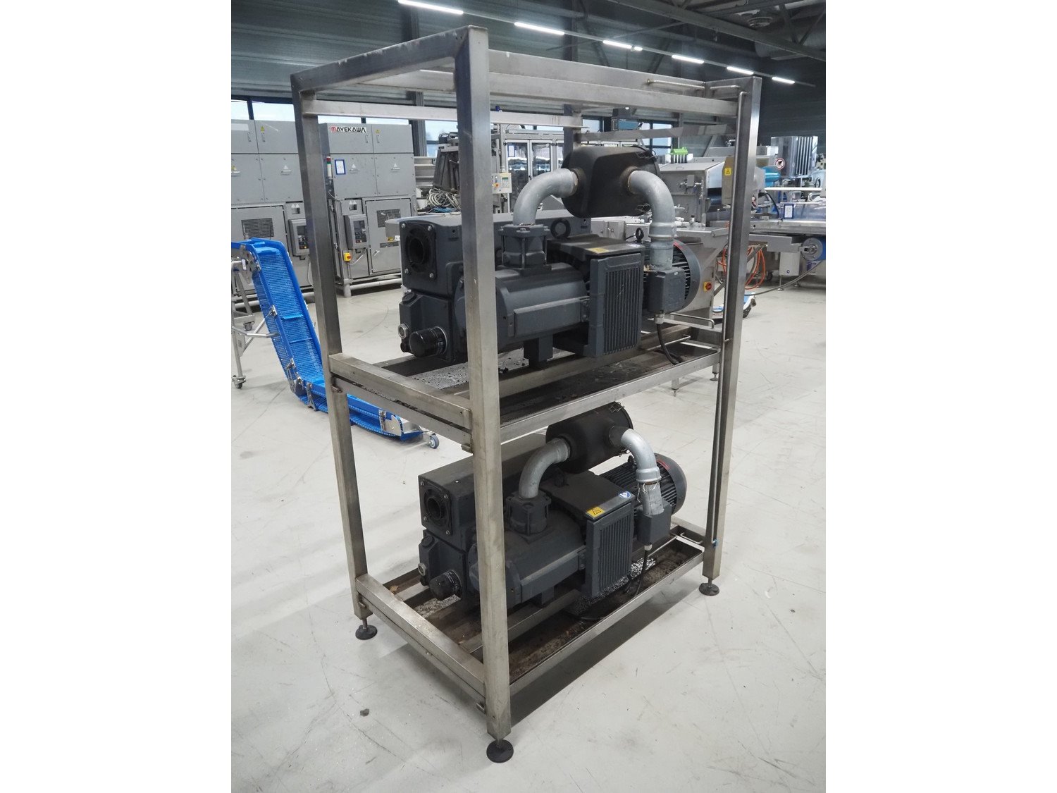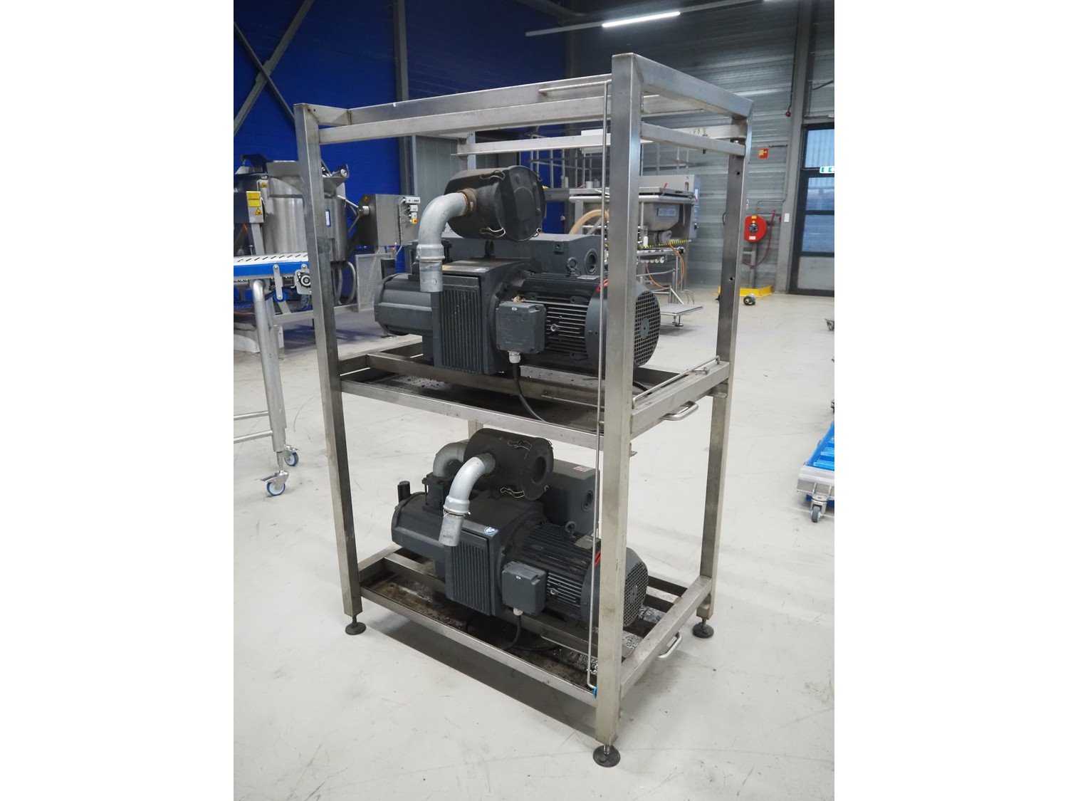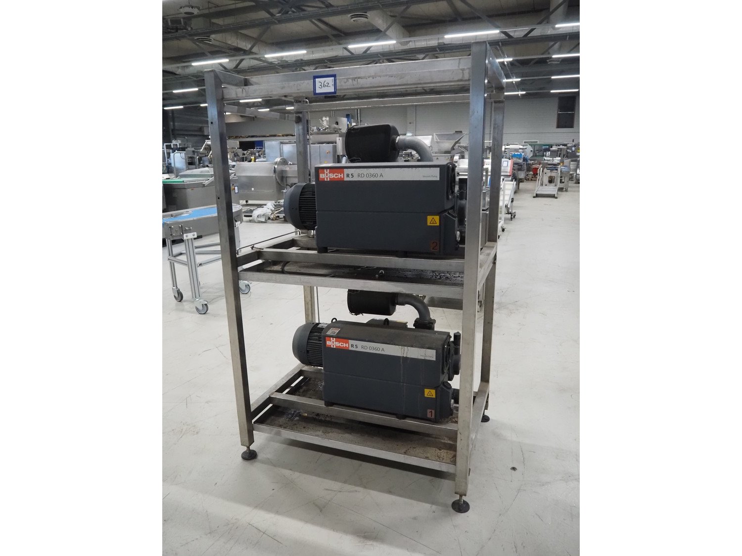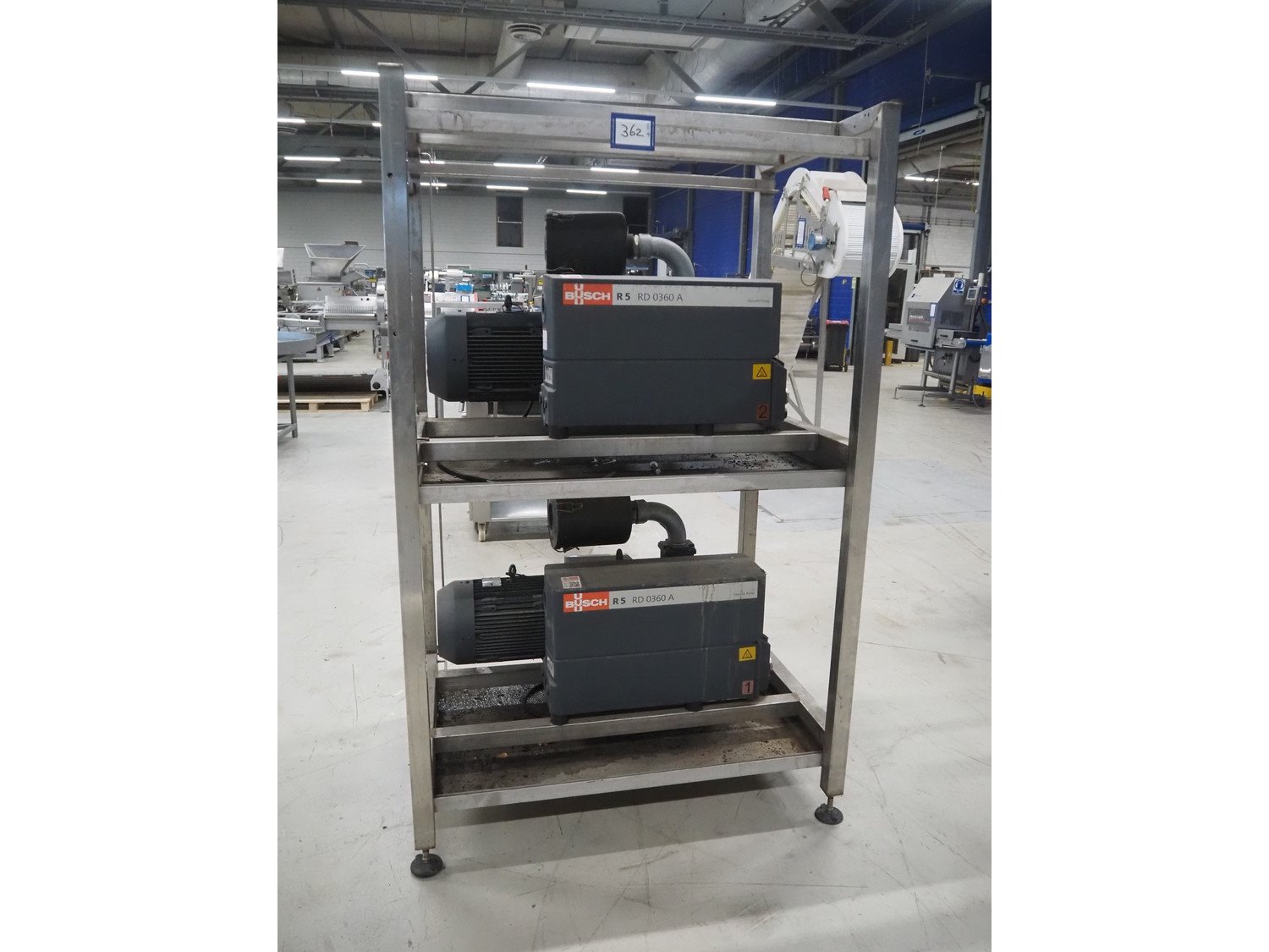 S/s rack with 2 Busch vacuum pumps, type: (2x) RD 0360 A 503, serial number: CHM120330107 / CHM120330110, year of construction: 2020, capacity: (2x) 300 m³ per hour, total dimensions: 1150 mm x 800 mm x 1850 mm.