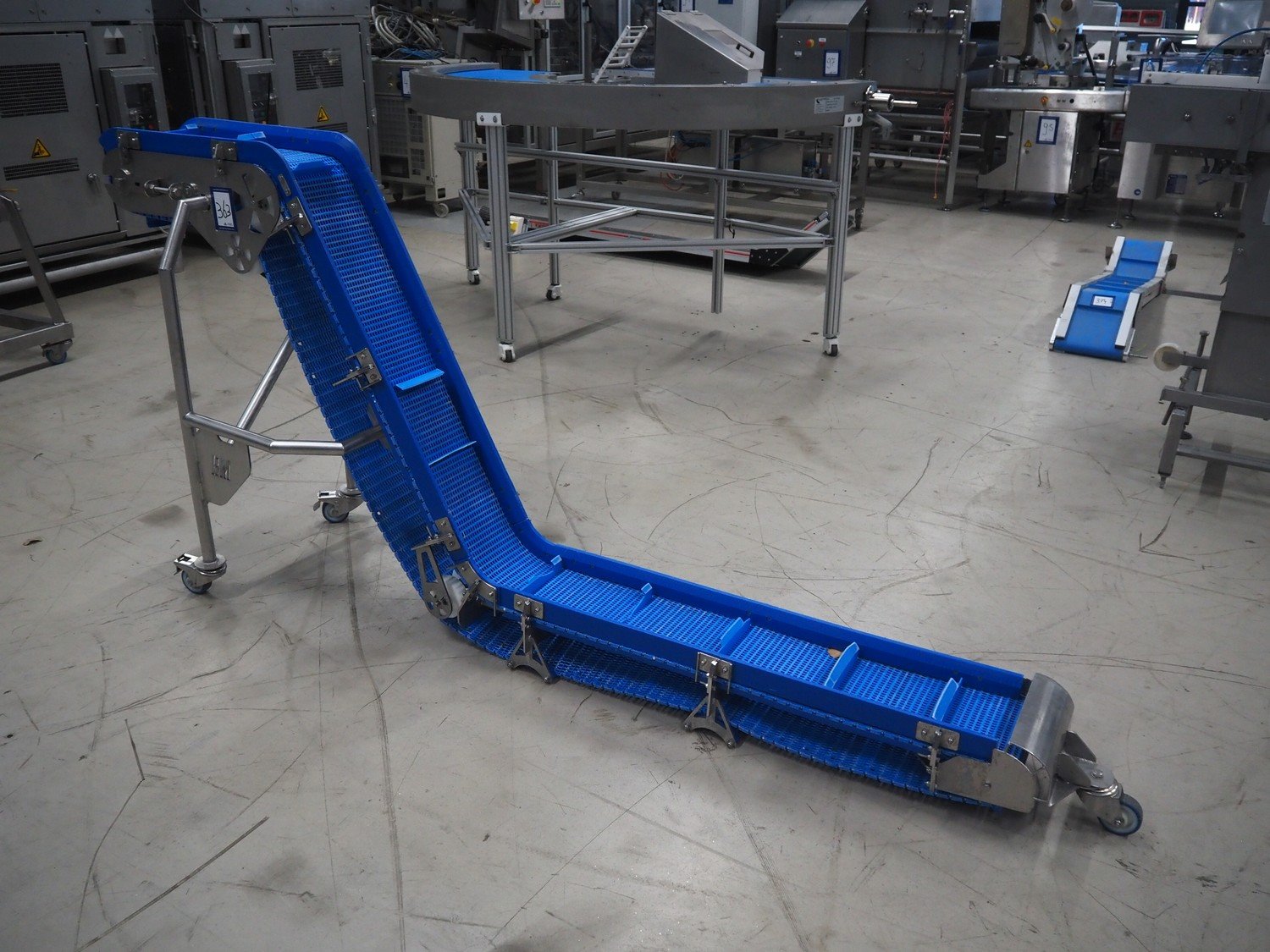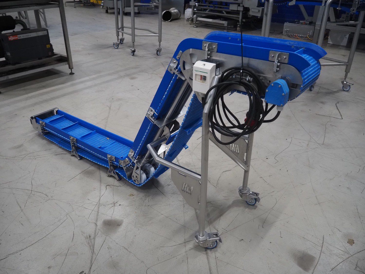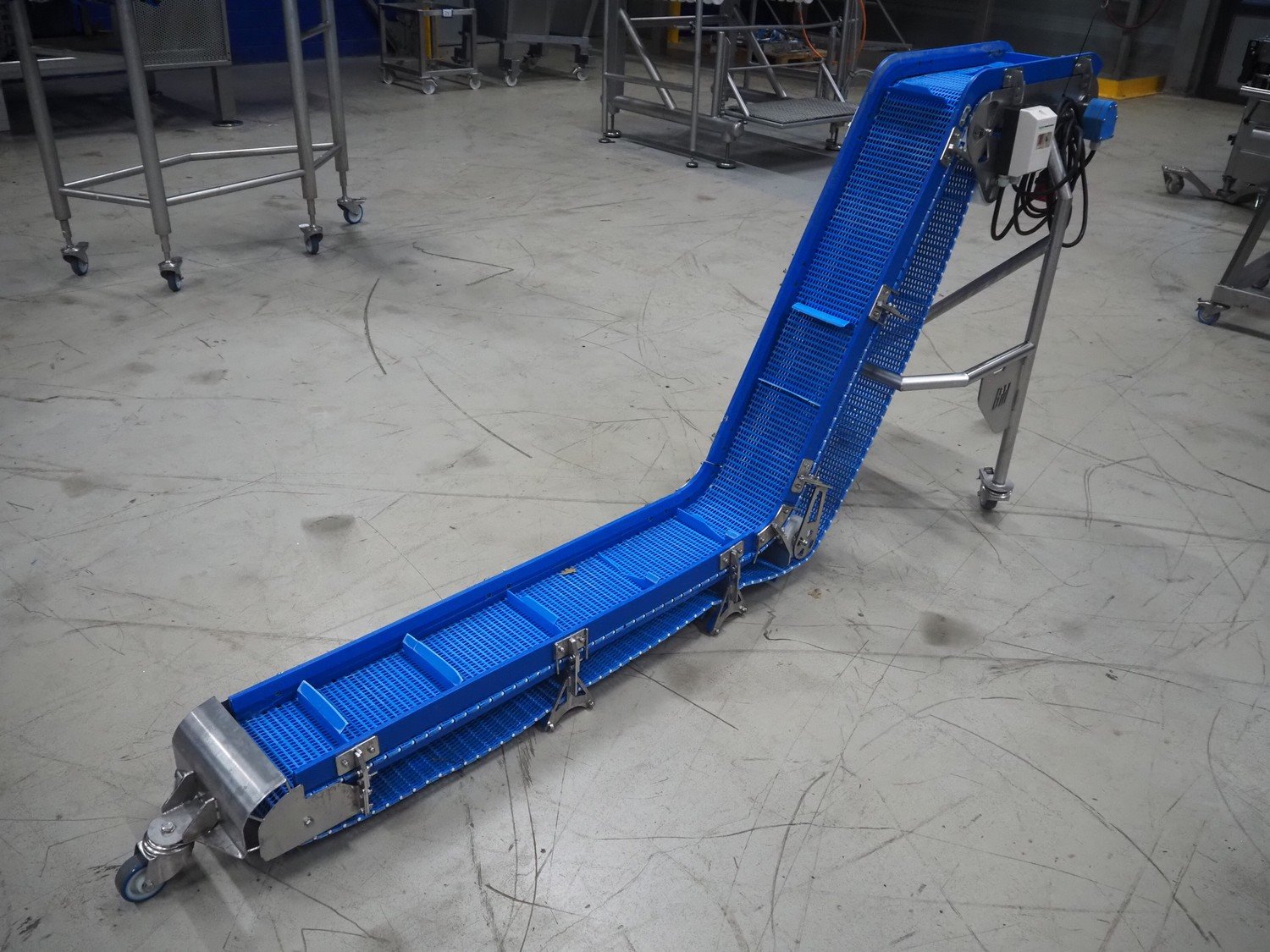 BM mobile elevating belt, s/s frame, plastic mesh belt with dividers, belt width: 215 mm, divider height: 30 mm, distance between dividers: 245 mm, elevating height: 1110 mm, total dimensions: 2550 mm x 600 mm x 1170 mm.