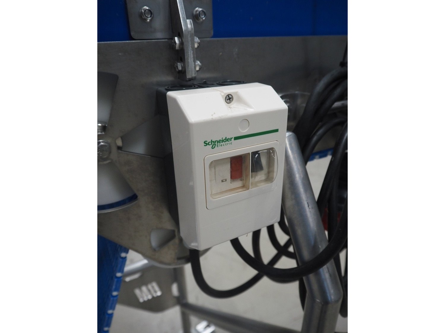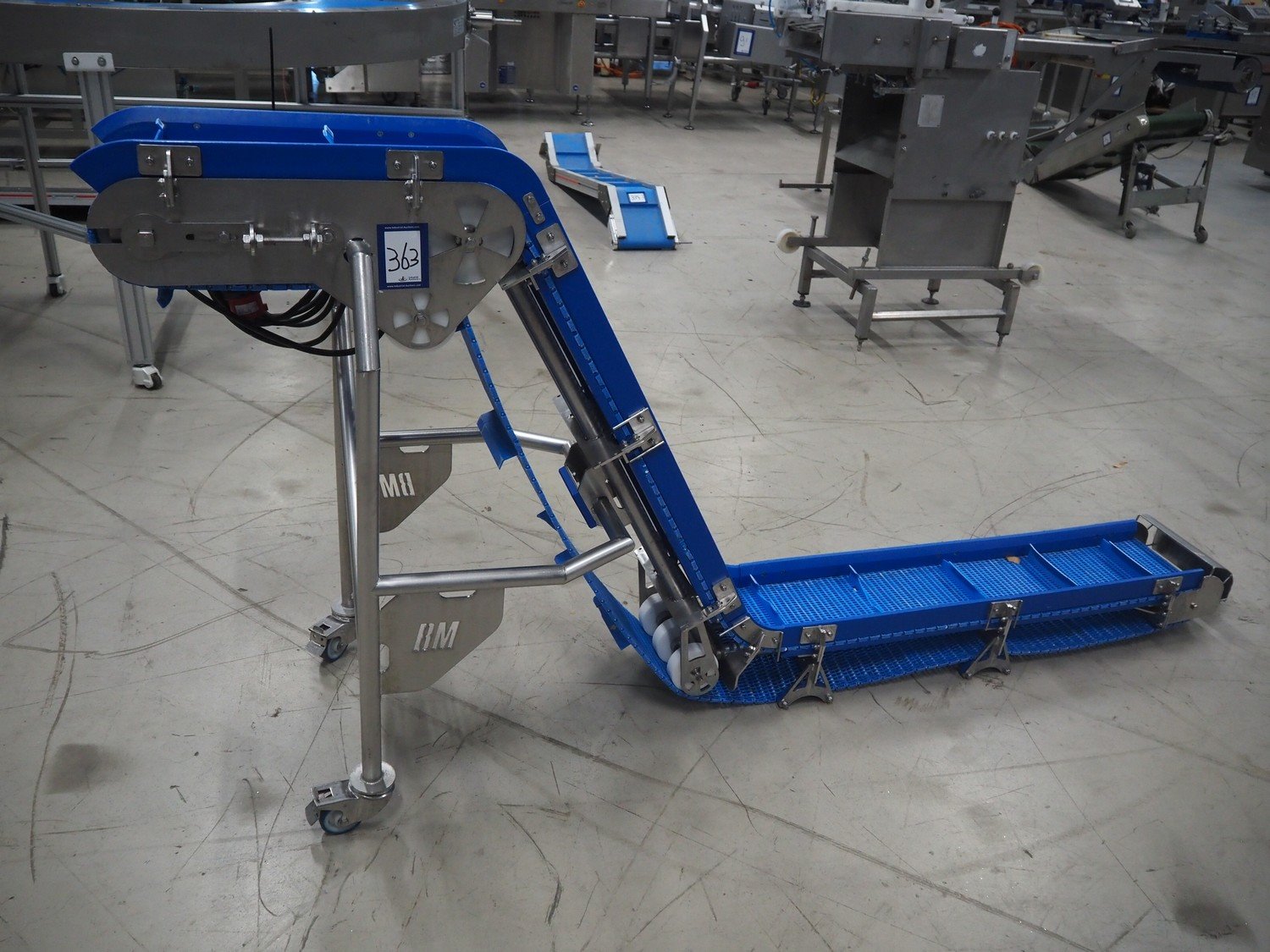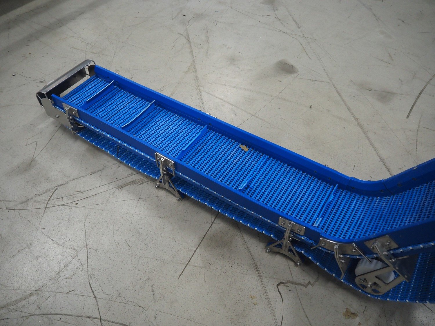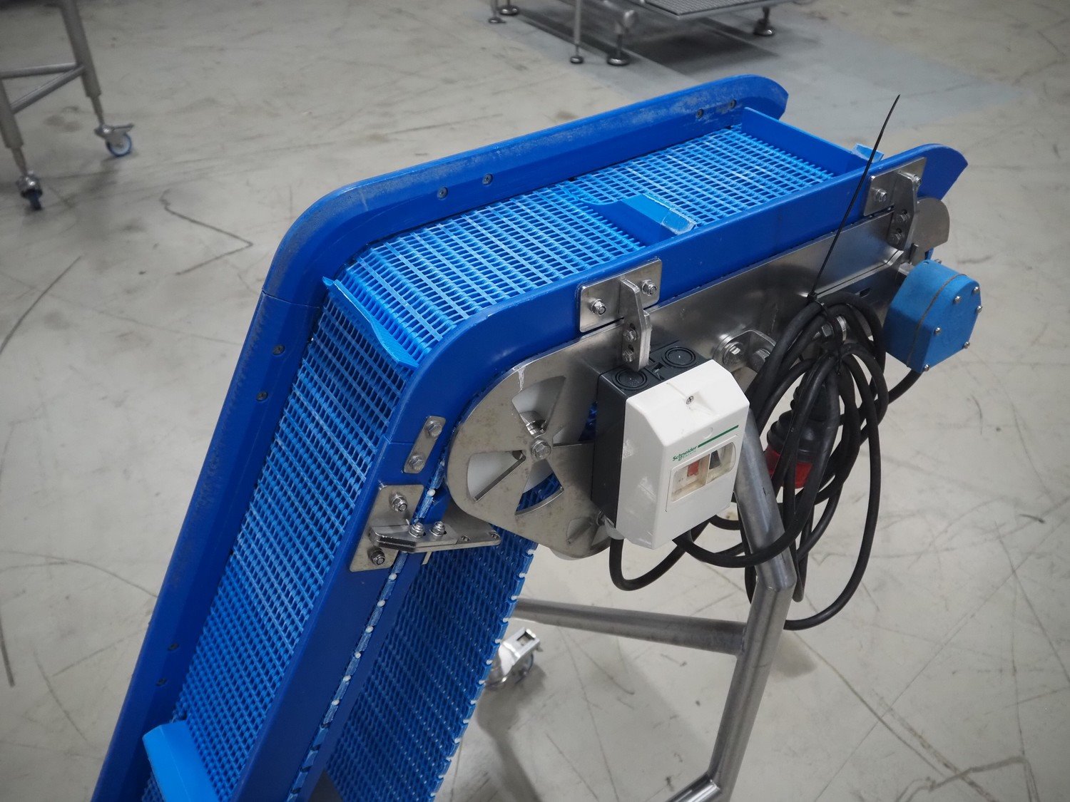 BM mobile elevating belt, s/s frame, plastic mesh belt with dividers, belt width: 215 mm, divider height: 30 mm, distance between dividers: 245 mm, elevating height: 1110 mm, total dimensions: 2550 mm x 600 mm x 1170 mm.