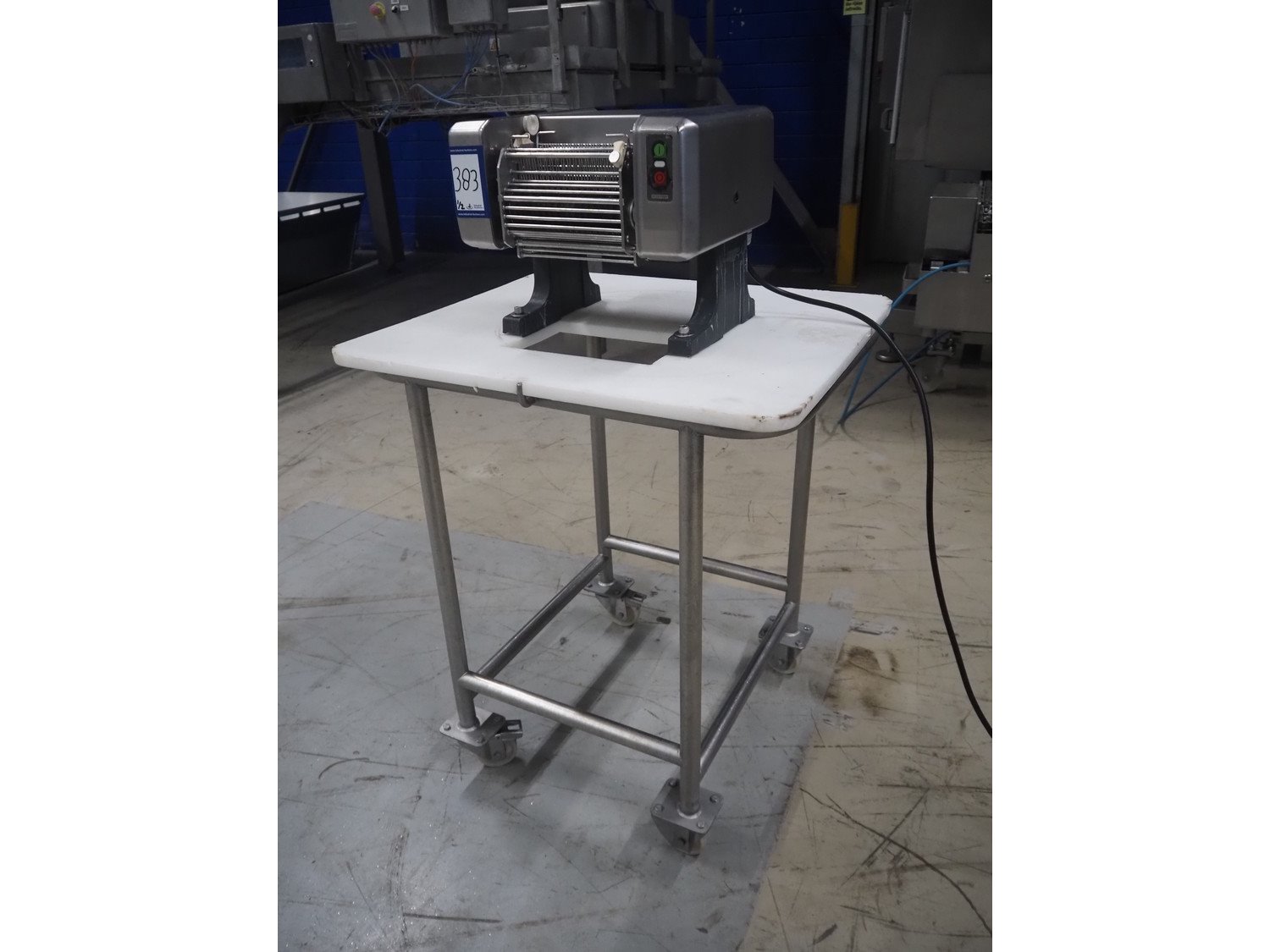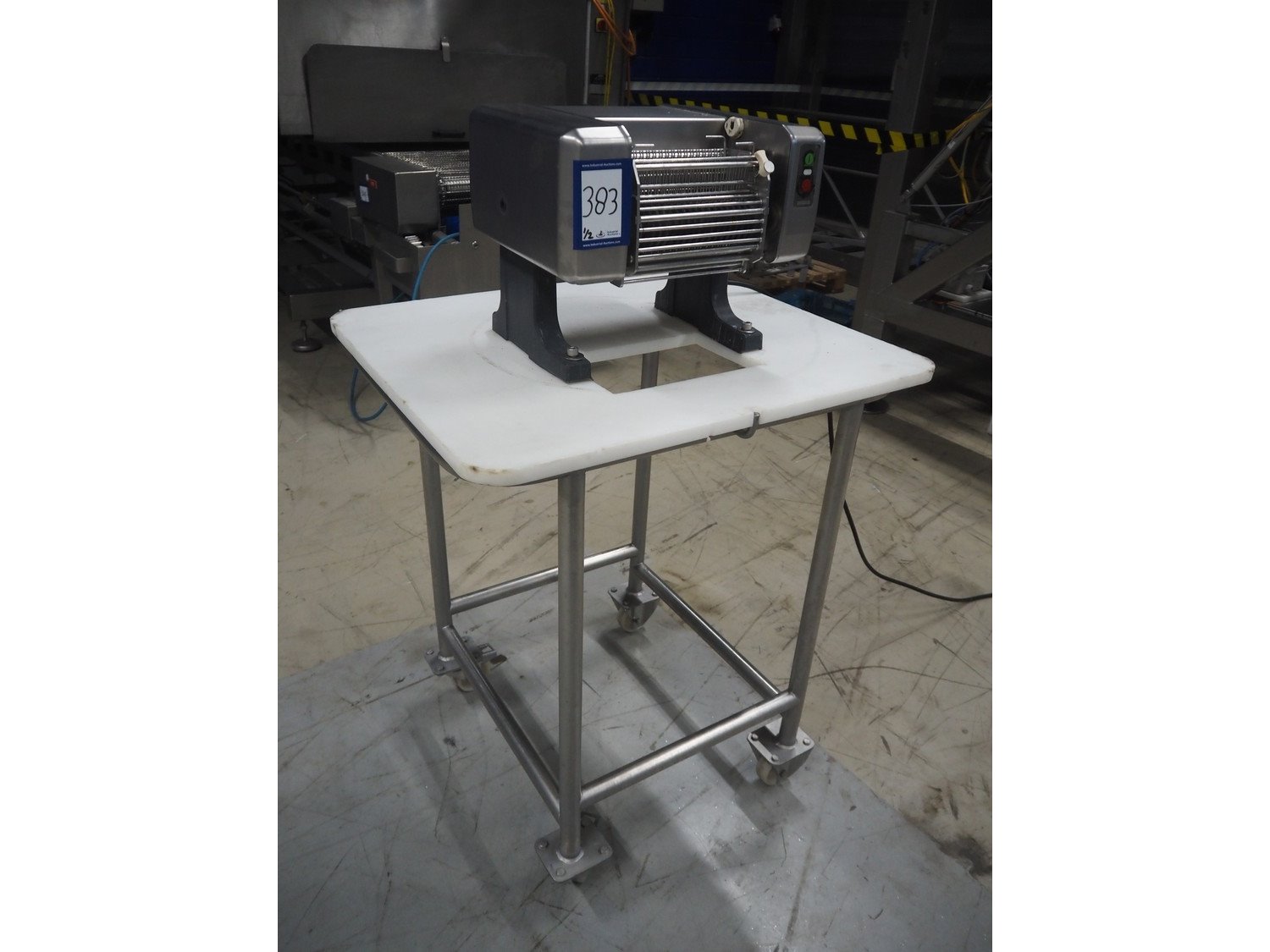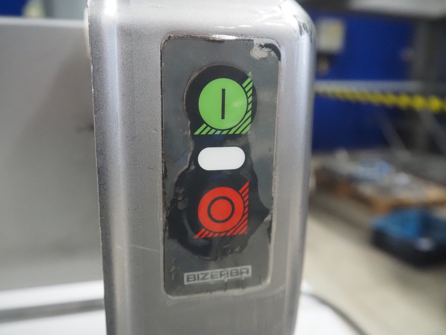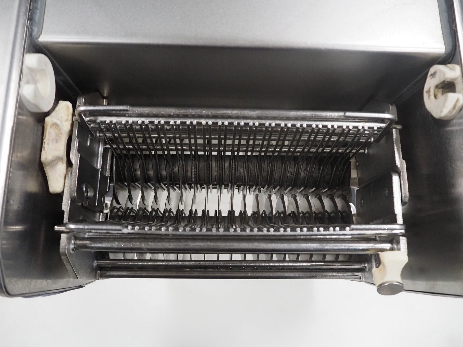 Bizerba strip cutter on s/s trolley with plastic top, model: S 111 Plus, number: 10283157, year of construction: 2006, 230 V, 1 Ph, 50 Hz, 2.7 A, dimensions: 760 mm x 650 mm x 1200 mm. With crate with knives.