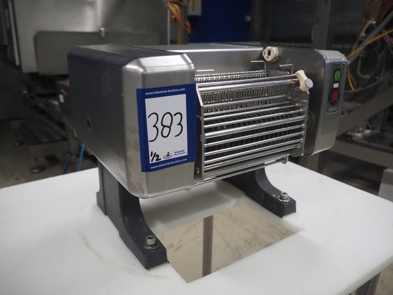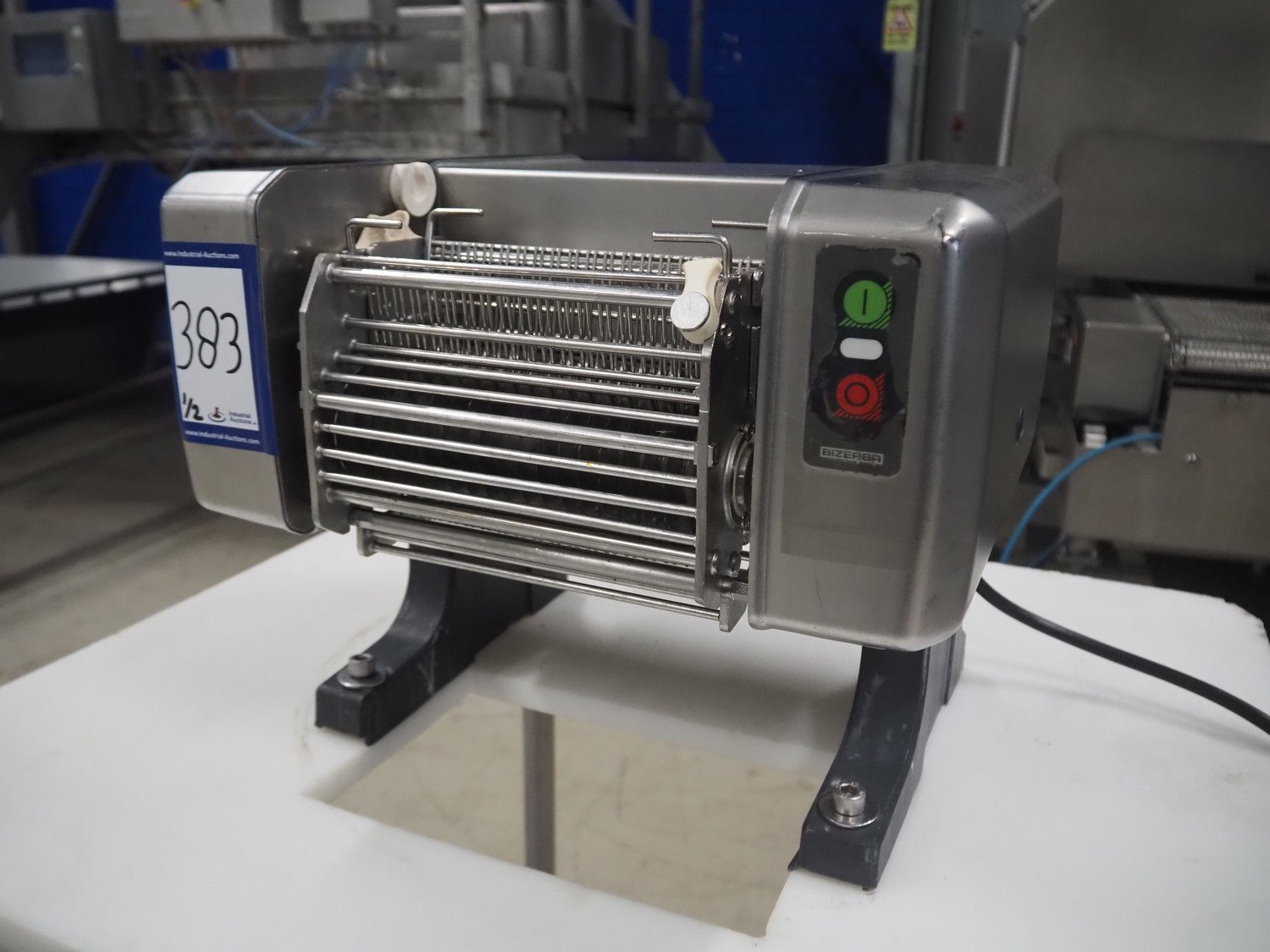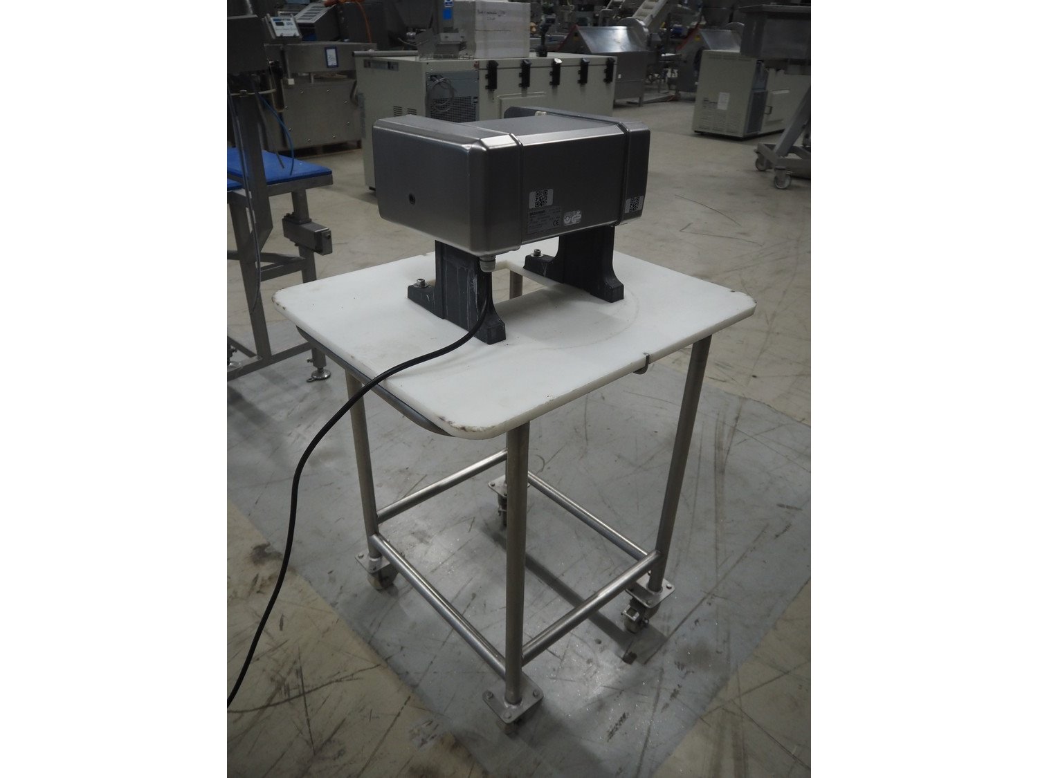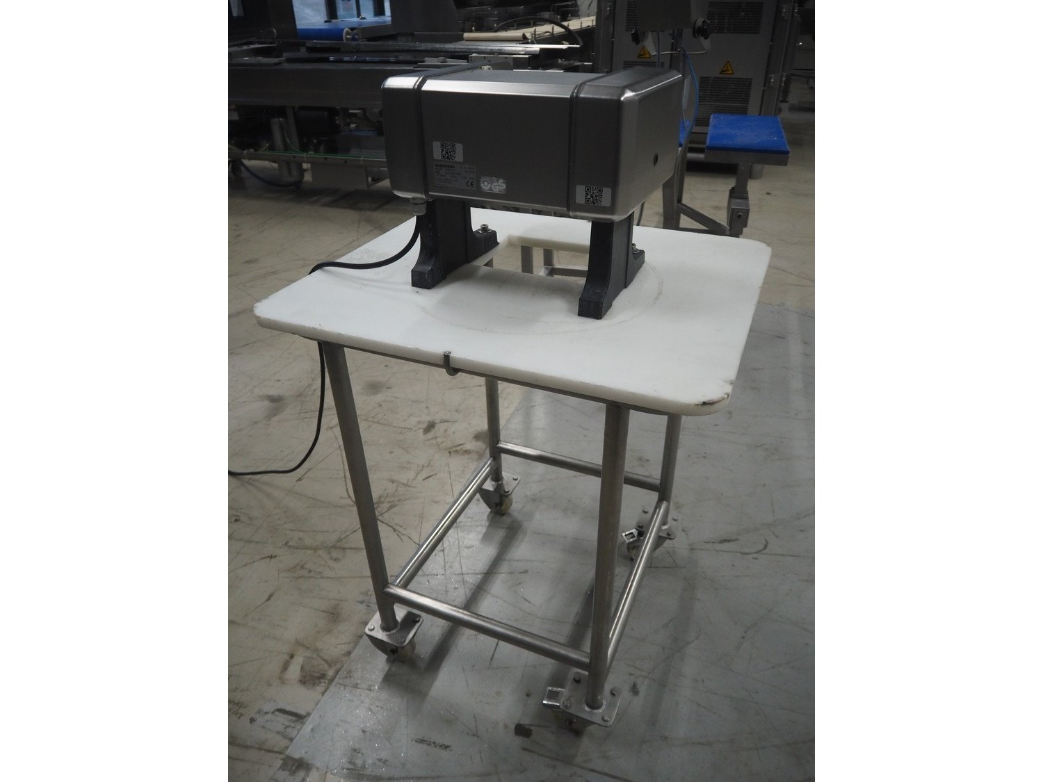 Bizerba strip cutter on s/s trolley with plastic top, model: S 111 Plus, number: 10283157, year of construction: 2006, 230 V, 1 Ph, 50 Hz, 2.7 A, dimensions: 760 mm x 650 mm x 1200 mm. With crate with knives.