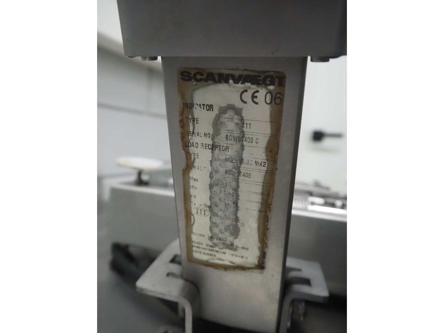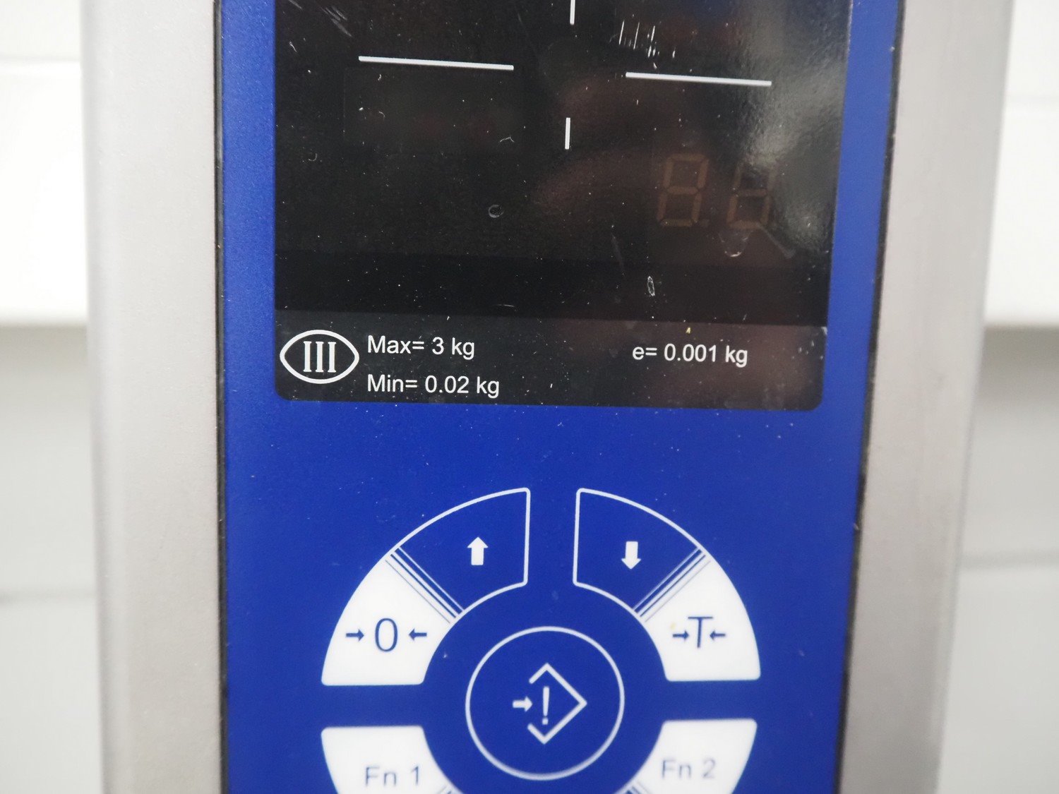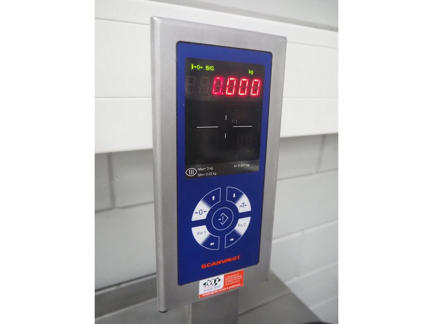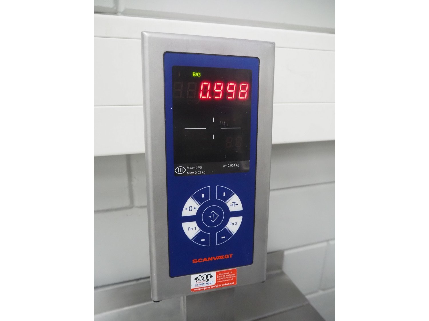 Scanvaegt weighing scale, serial number: BOW00408, maximum weight: 3 kg, minimum weight: 0.02 kg, e=: 0.001 kg, dimensions: 300 mm x 280 mm x 450 mm.