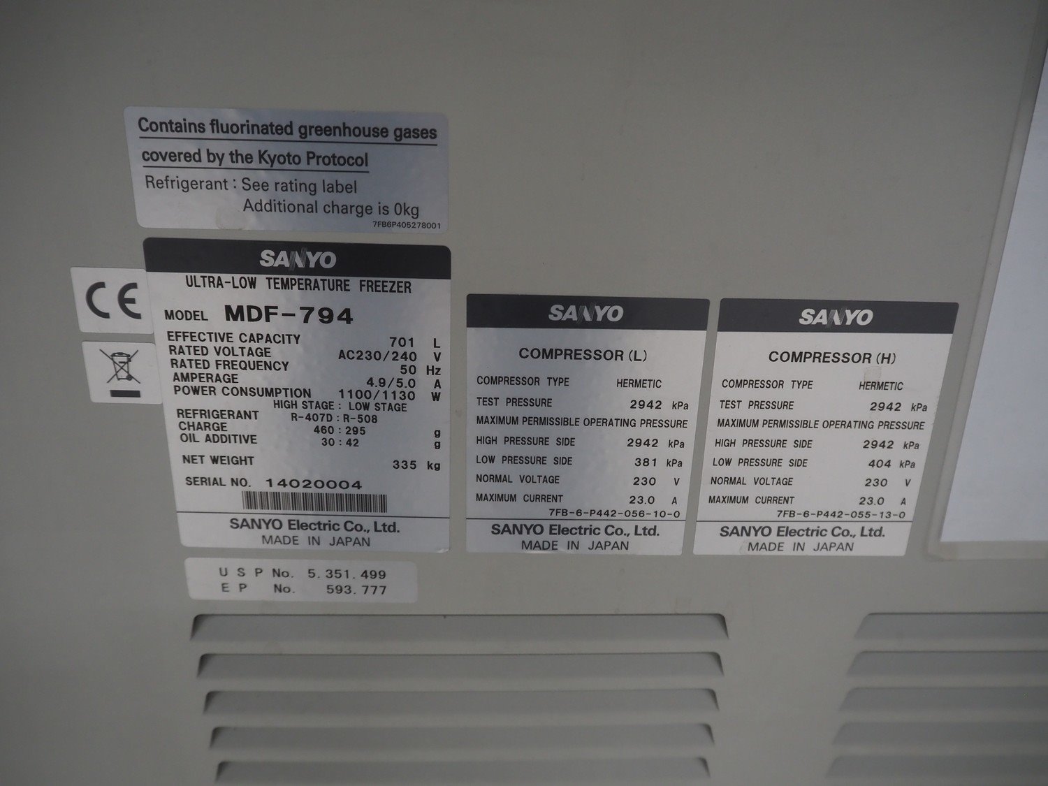 Sanyo Ultra-low temperature freezer, model: MDF-794, serial number: 14020004, 230/240 V, 50 Hz, 4.9/5.0 A, 1100/1130 W, refrigerant: R-407D:R508, 460:295 gram, volume: 701 liter, dimensions: 2570 mm x 870 mm x 1080 mm.