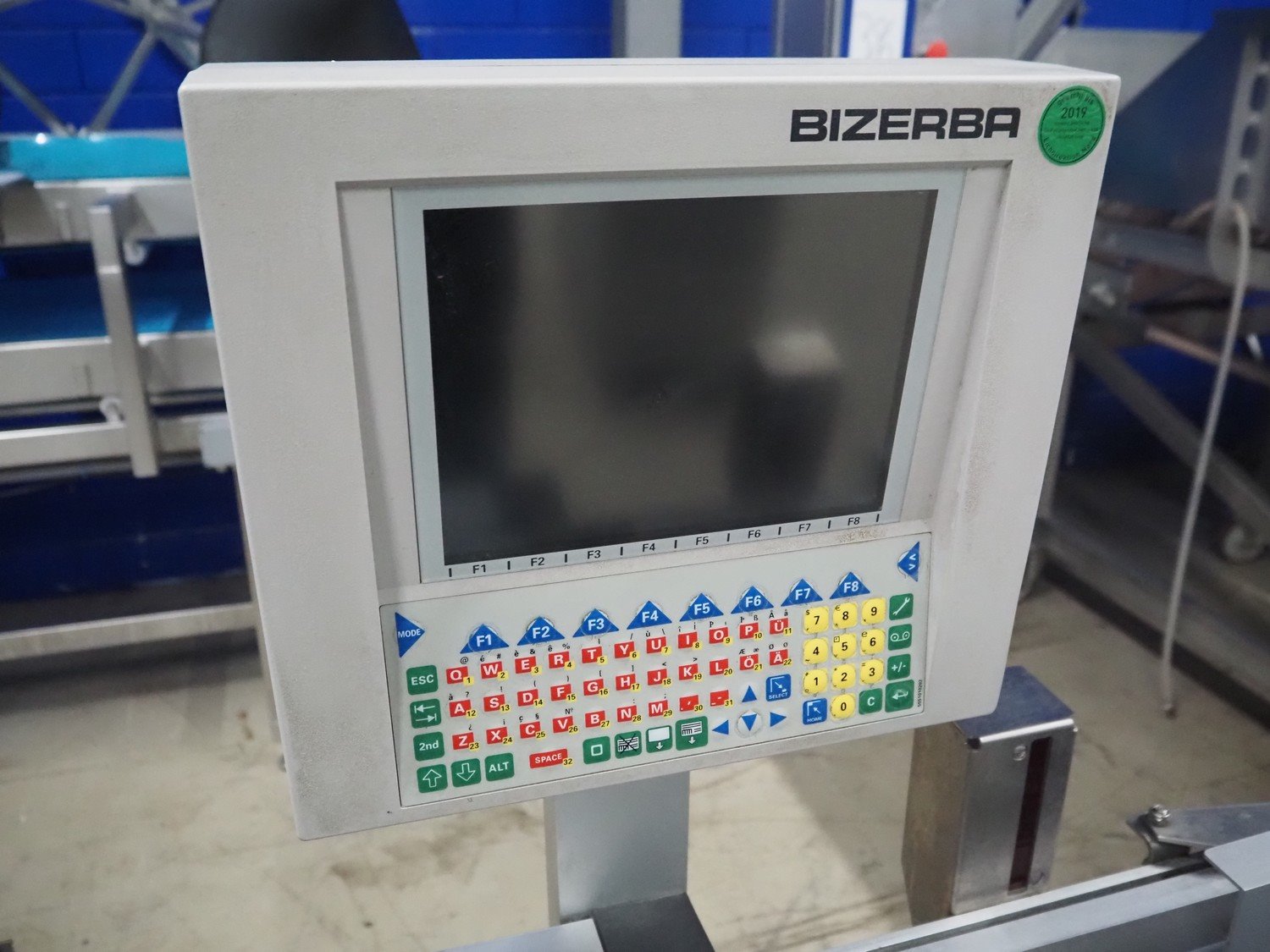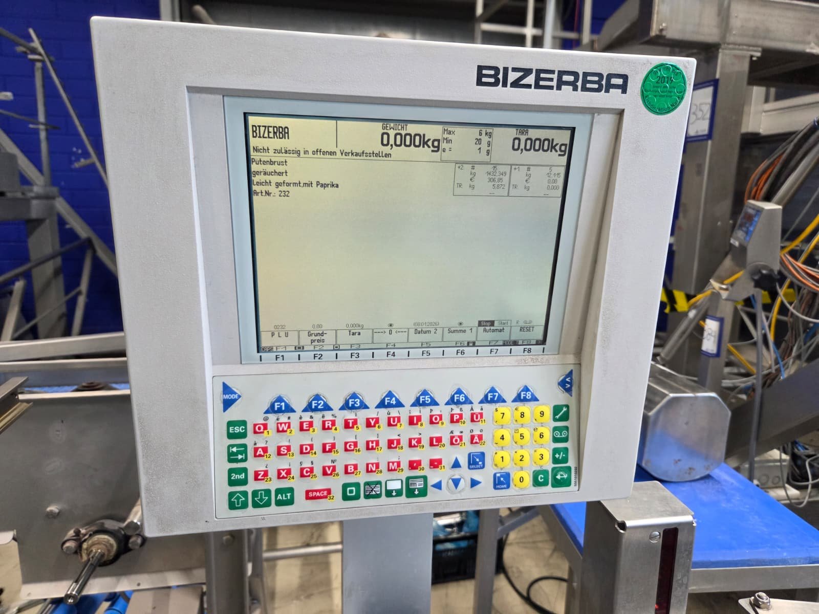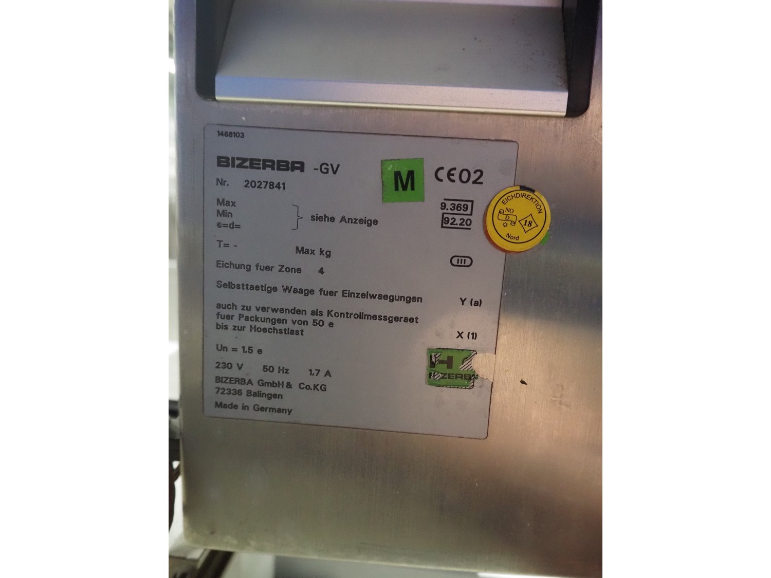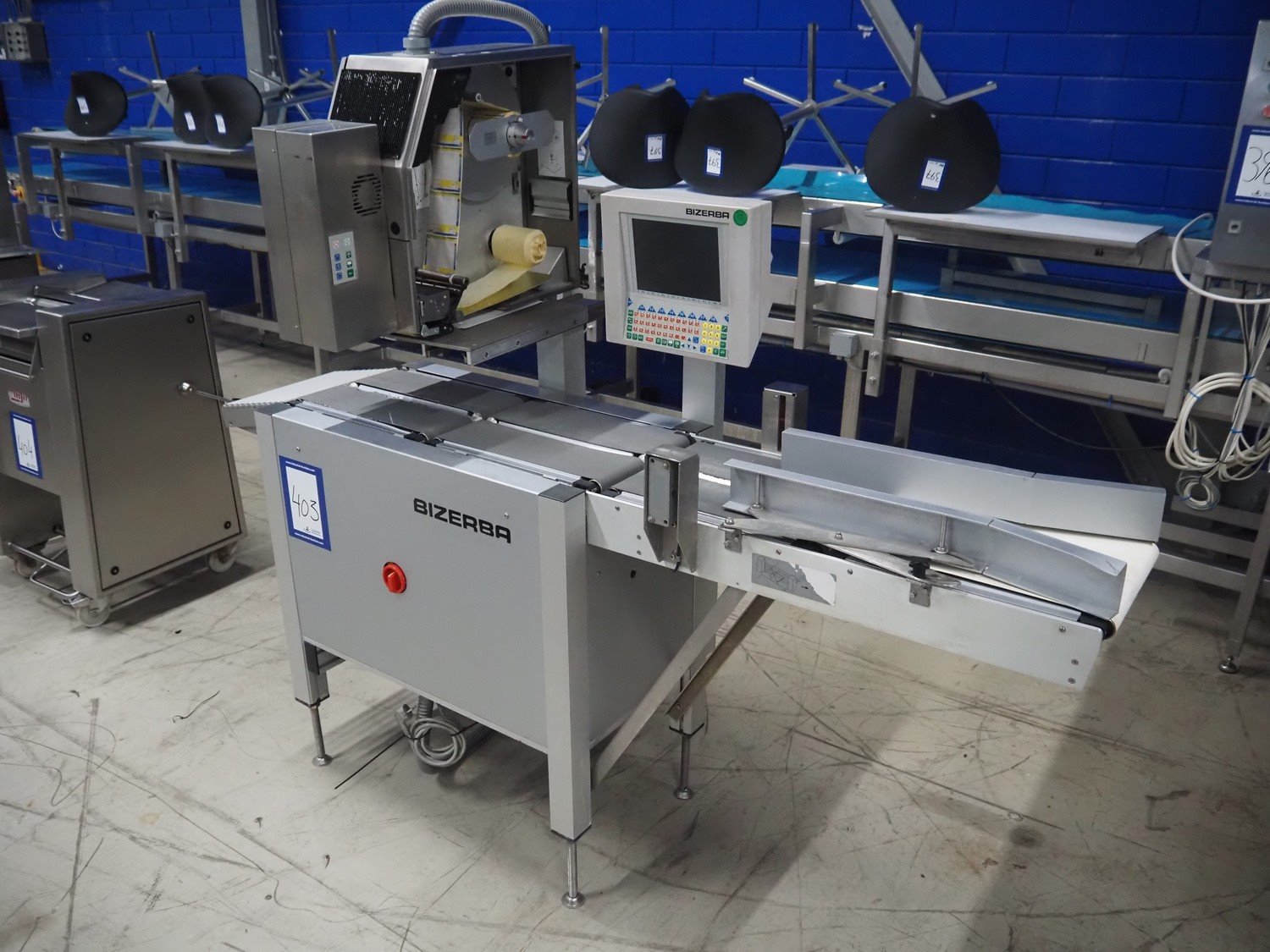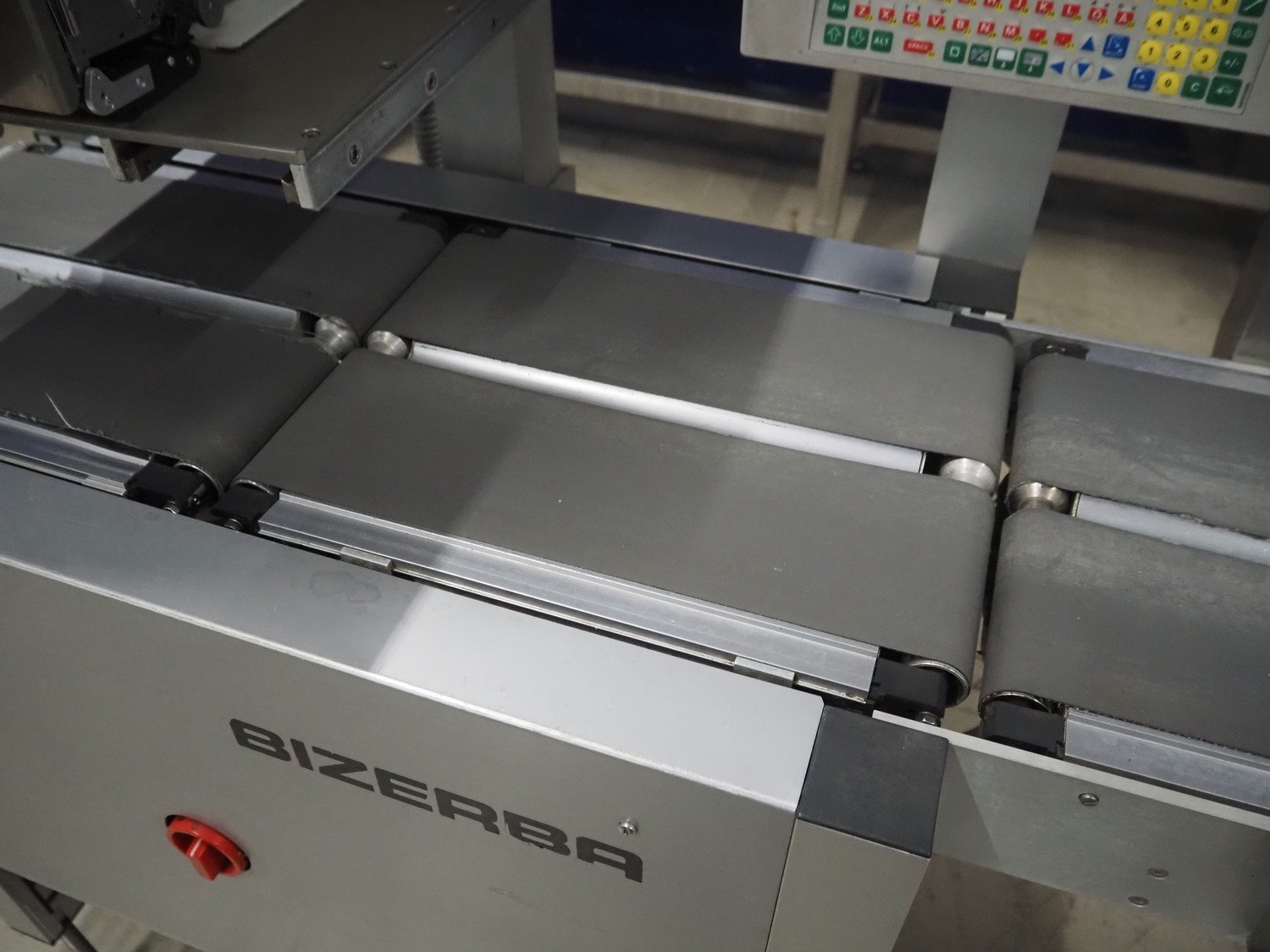 Bizerba weighing and labelling machine with top labeller, number: 2027841, 230 V, 50 Hz, 1.7 A, plastic belts, belt width: (2x) 135 mm and (1x) 295 mm, total dimensions: 2000 mm x 730 mm x 1770 mm.