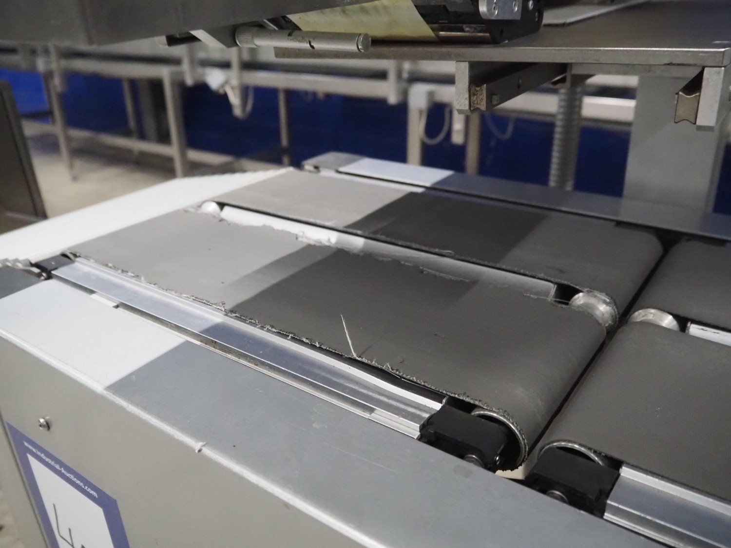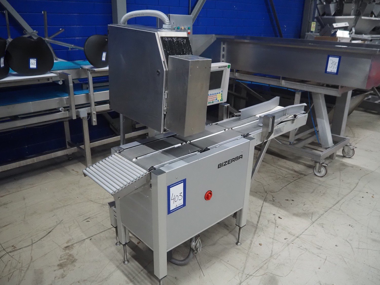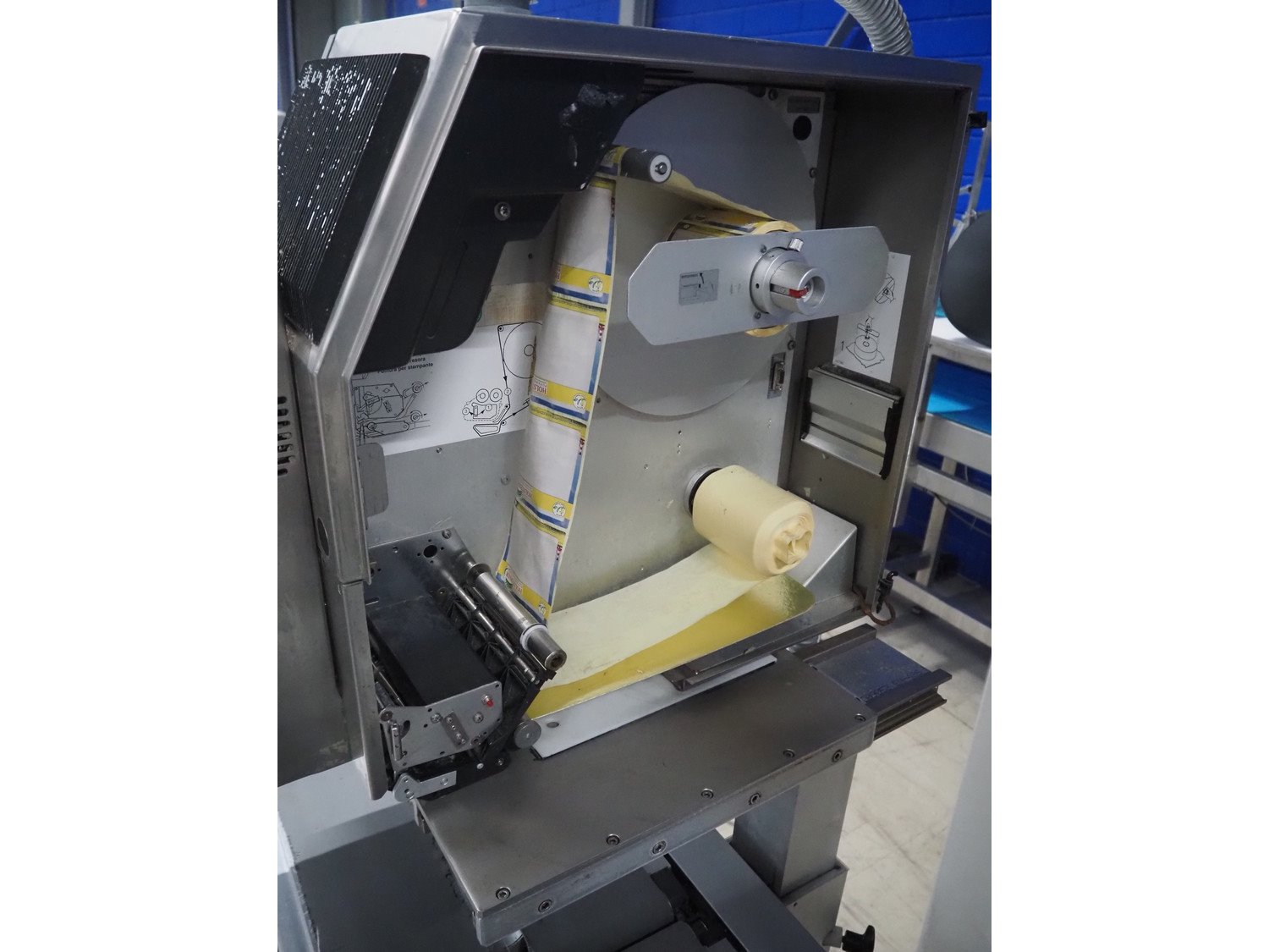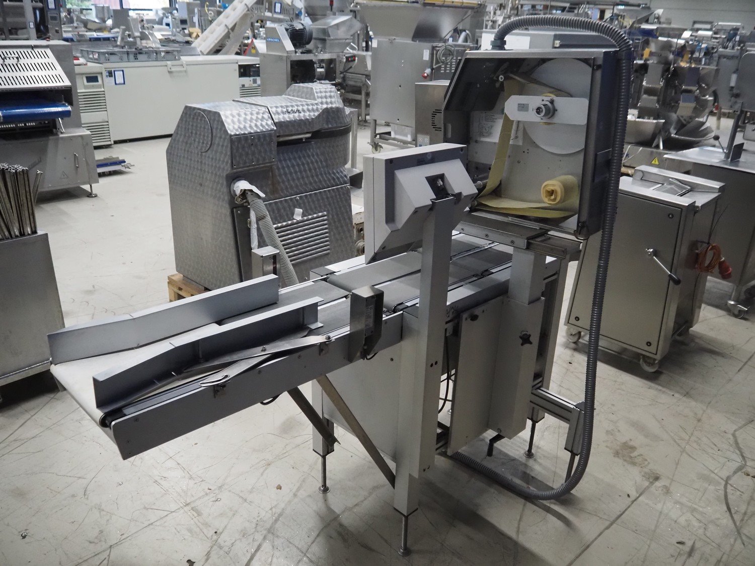 Bizerba weighing and labelling machine with top labeller, number: 2027841, 230 V, 50 Hz, 1.7 A, plastic belts, belt width: (2x) 135 mm and (1x) 295 mm, total dimensions: 2000 mm x 730 mm x 1770 mm.