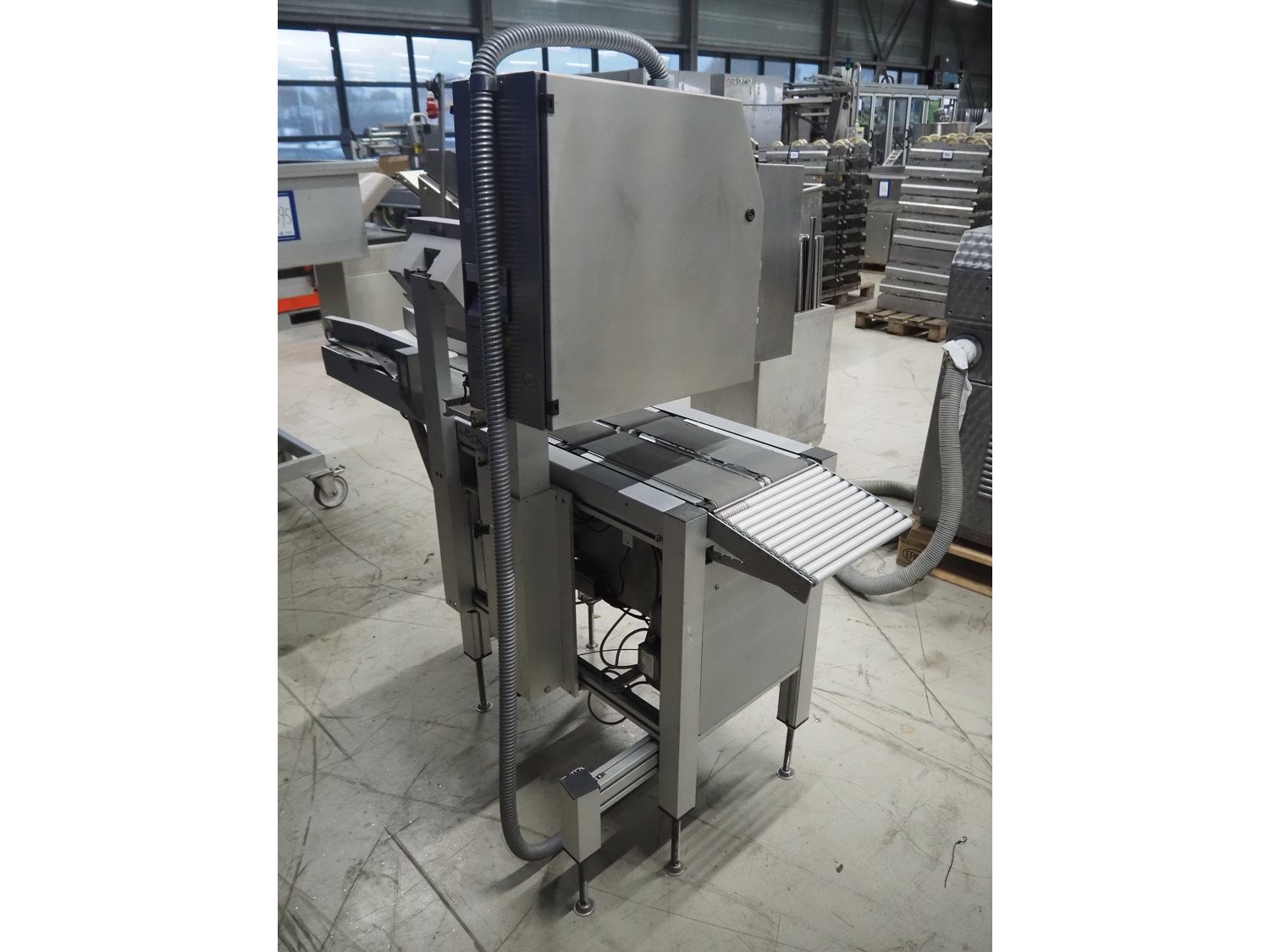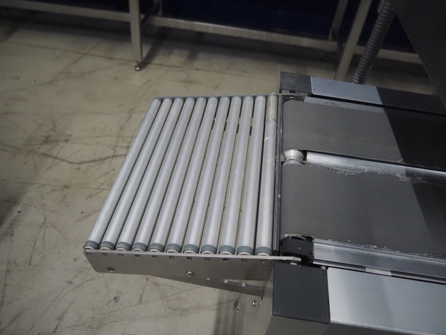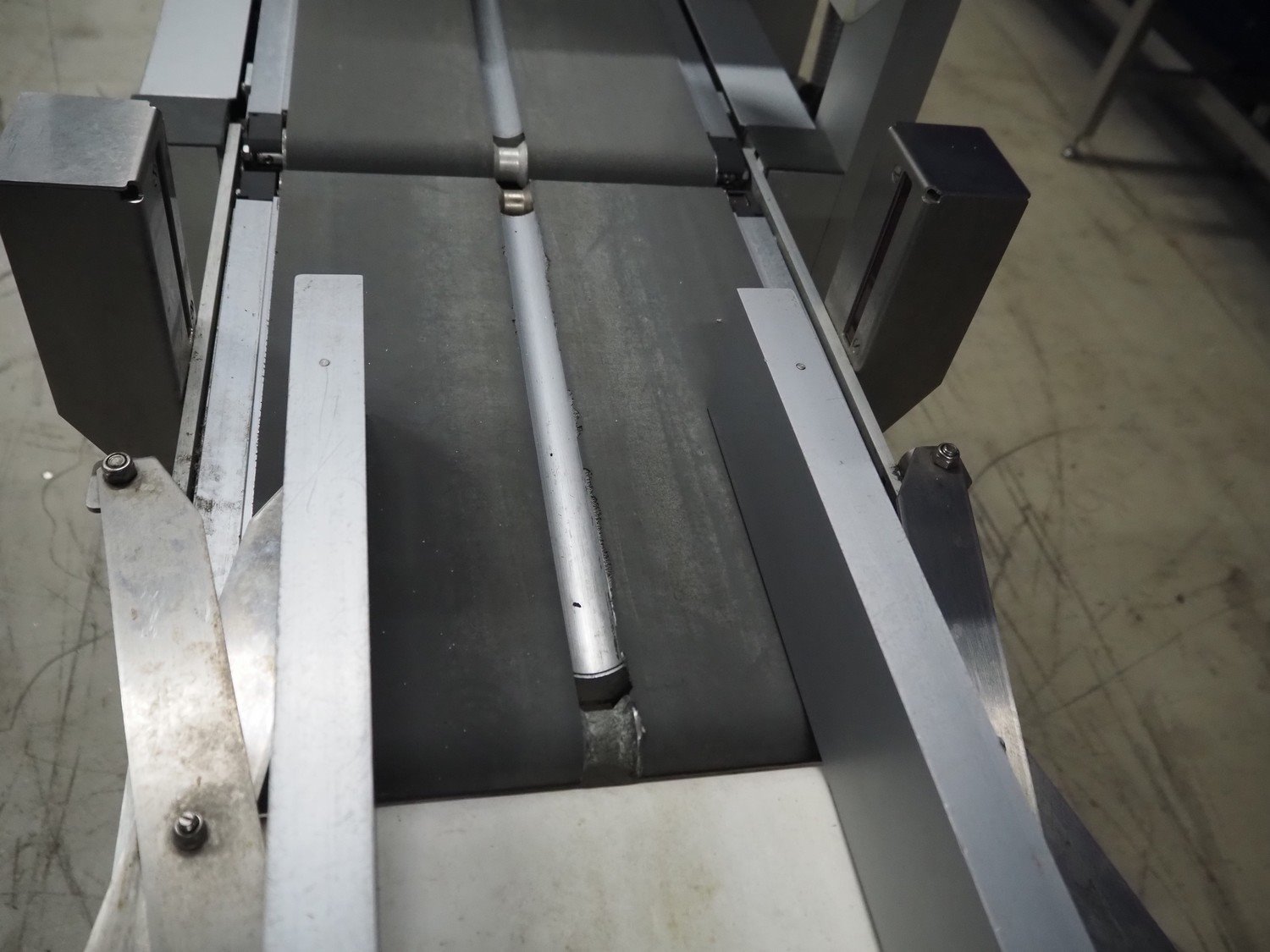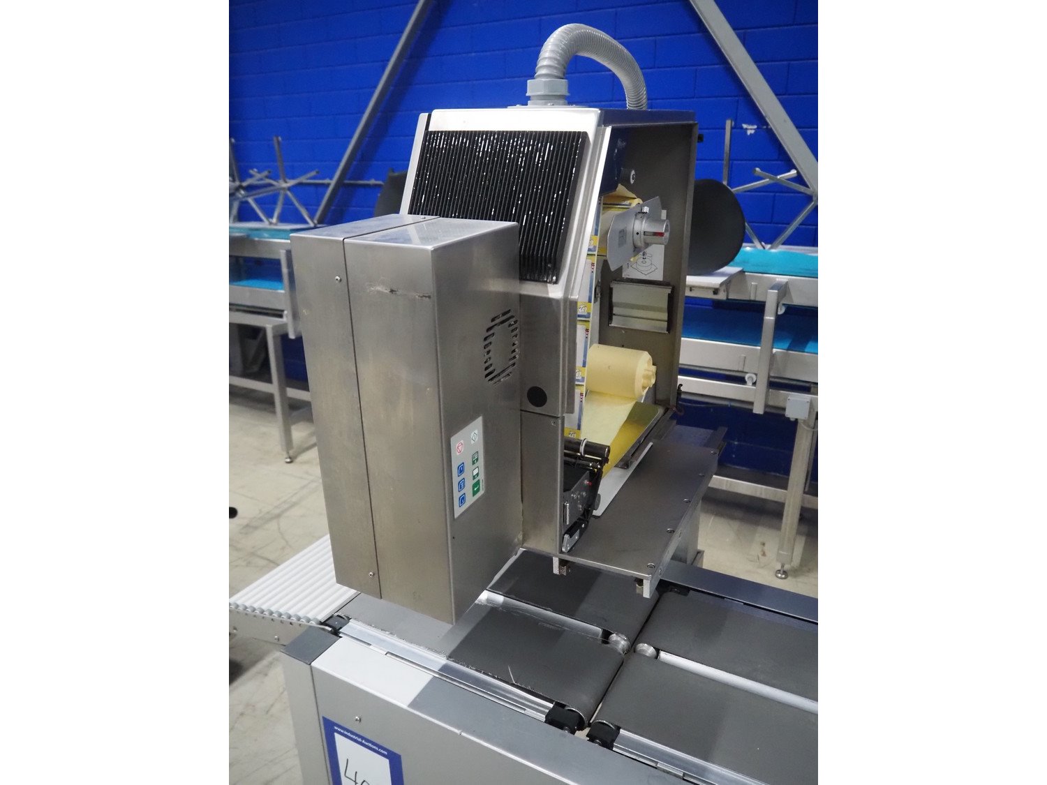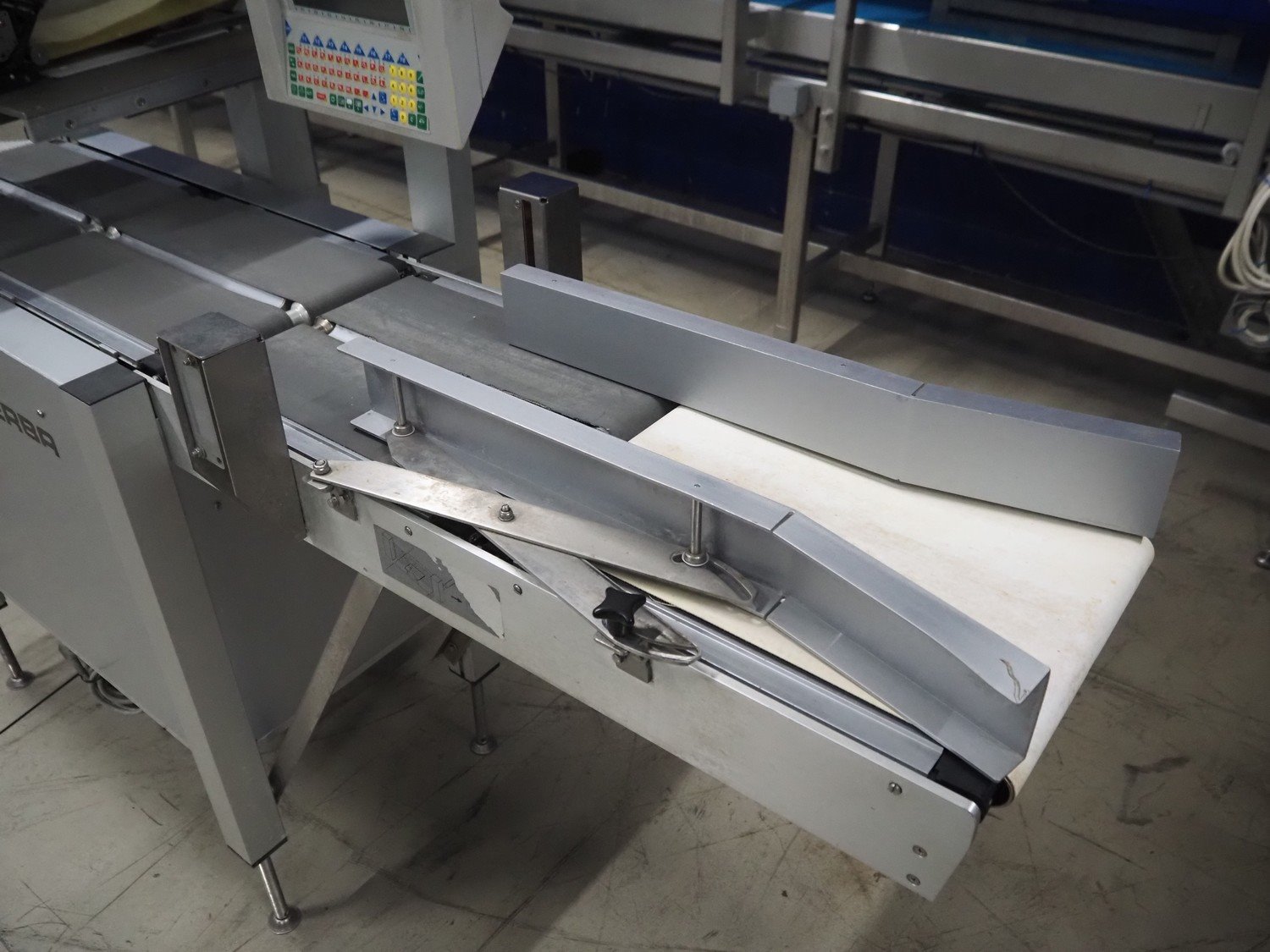 Bizerba weighing and labelling machine with top labeller, number: 2027841, 230 V, 50 Hz, 1.7 A, plastic belts, belt width: (2x) 135 mm and (1x) 295 mm, total dimensions: 2000 mm x 730 mm x 1770 mm.