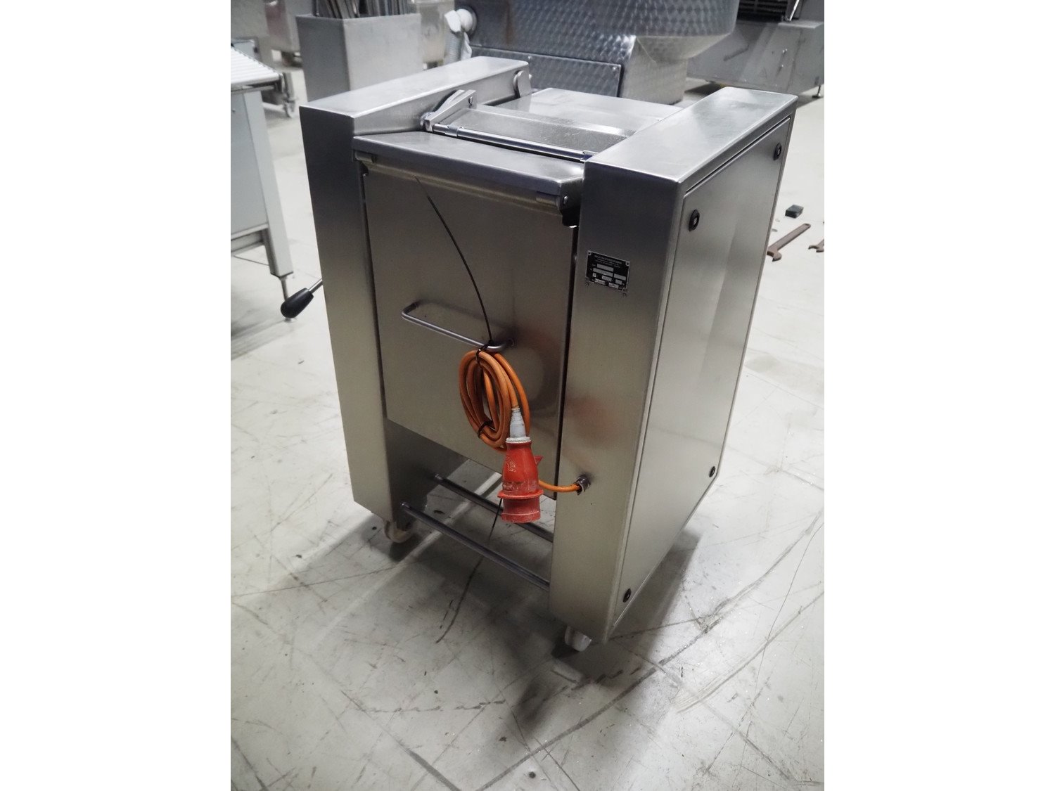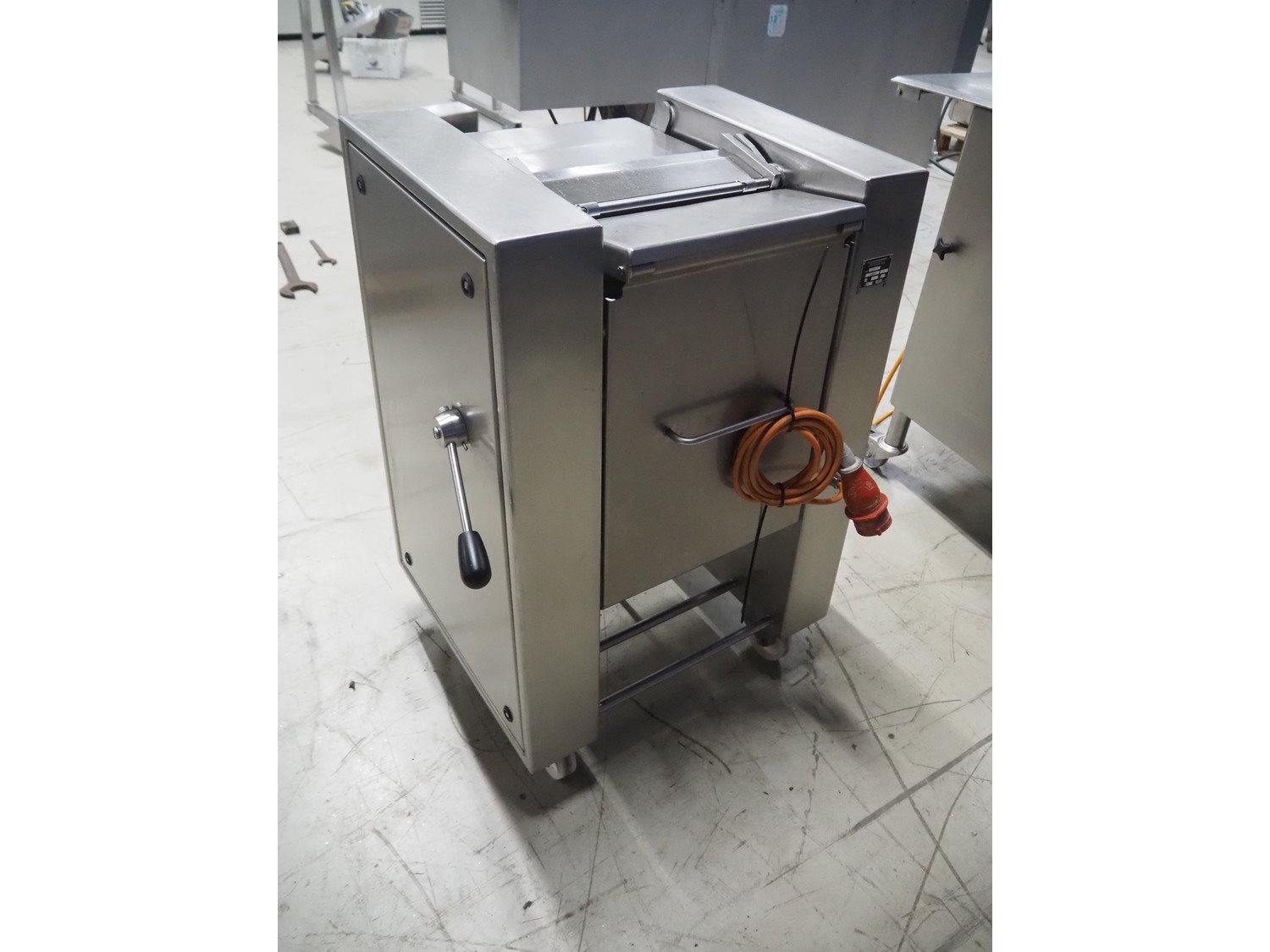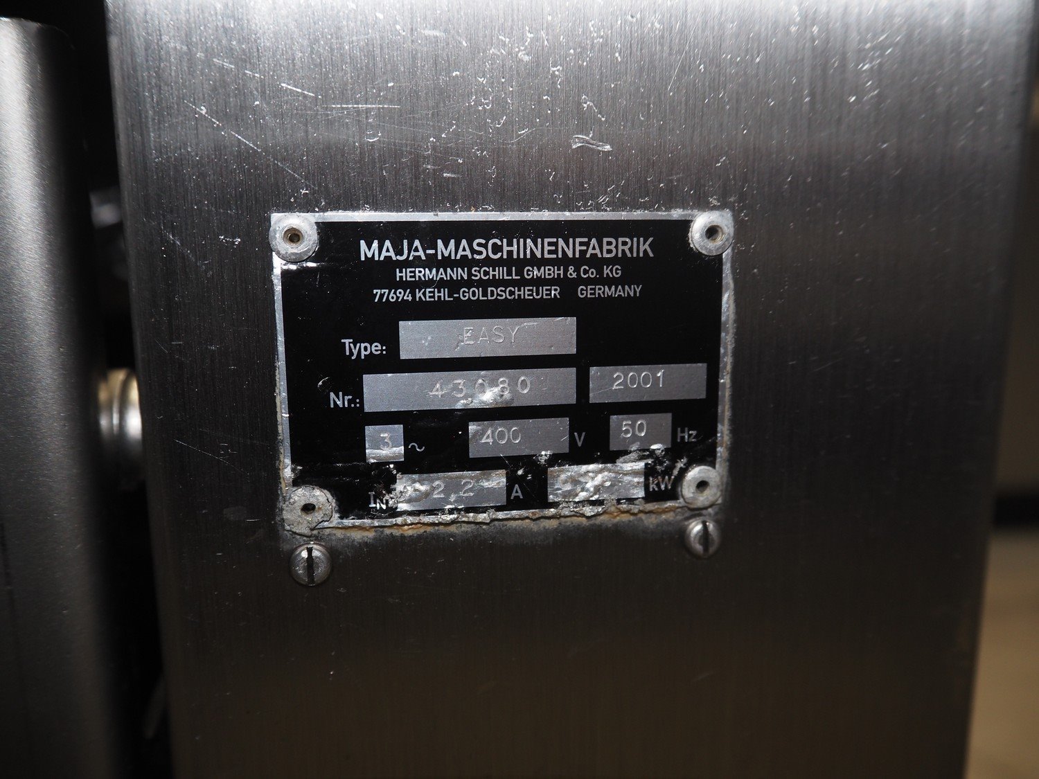 Maja Maschinenfabrik mobile skinning machine, type: Easy, number: 43080, year of construction: 2001, 400 V, 3 Ph, 50 Hz, 2.2 A, 0.75 kW, working width: 330 mm, total dimensions: 700 mm x 570 mm x 1000 mm.