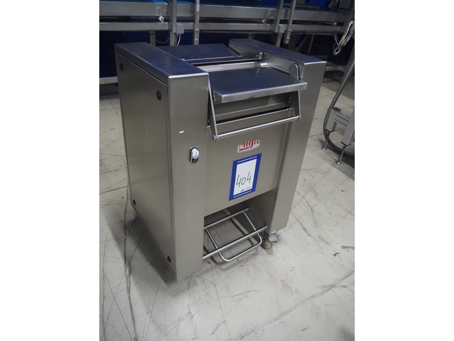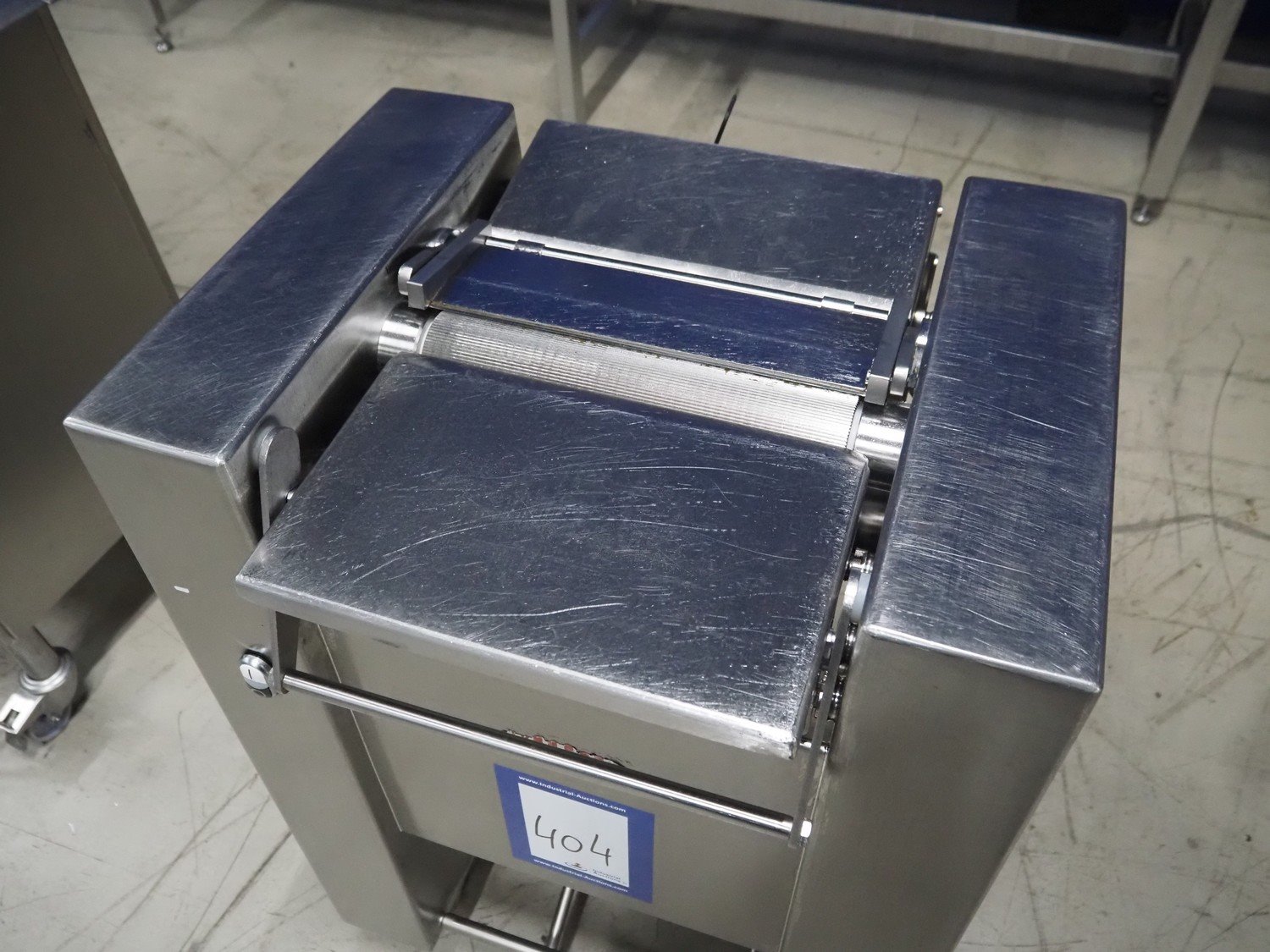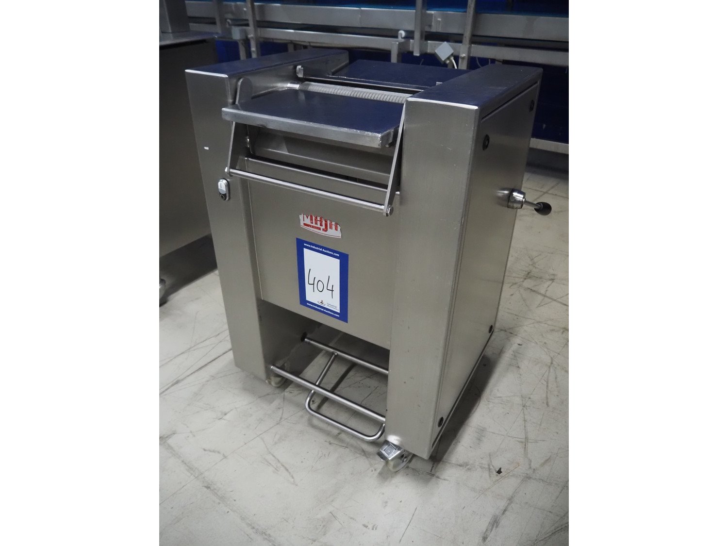 Maja Maschinenfabrik mobile skinning machine, type: Easy, number: 43080, year of construction: 2001, 400 V, 3 Ph, 50 Hz, 2.2 A, 0.75 kW, working width: 330 mm, total dimensions: 700 mm x 570 mm x 1000 mm.