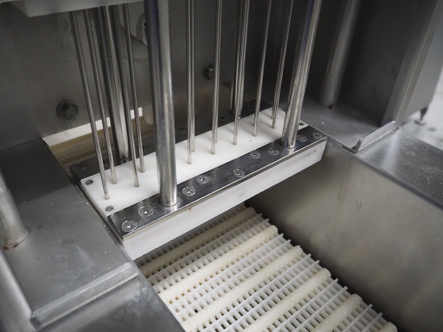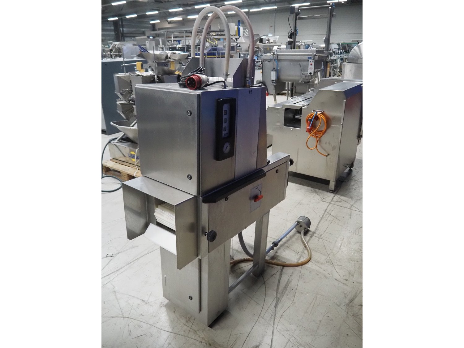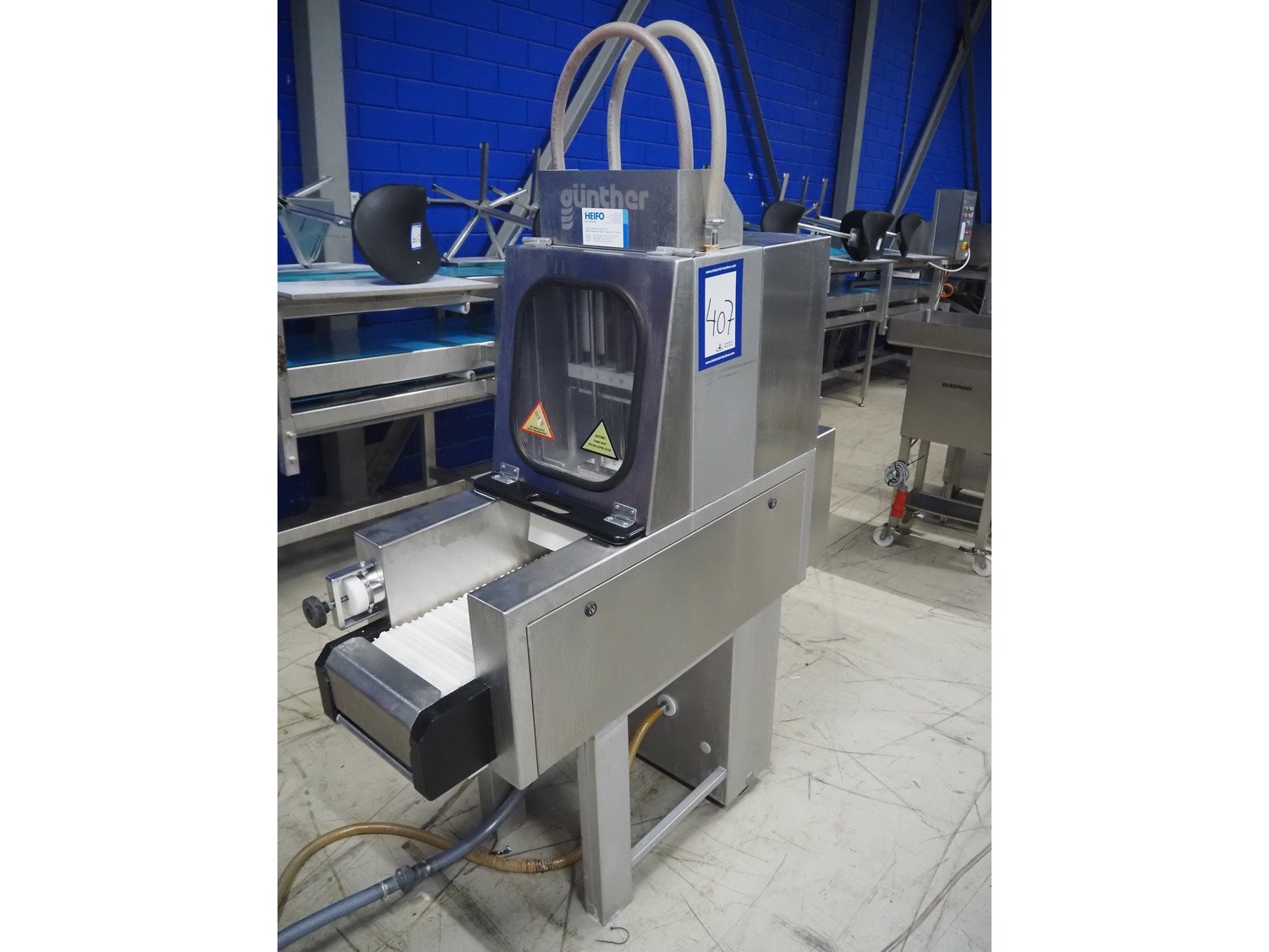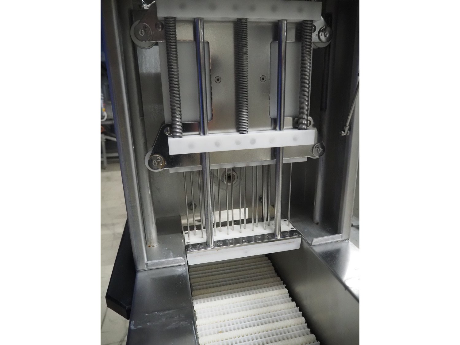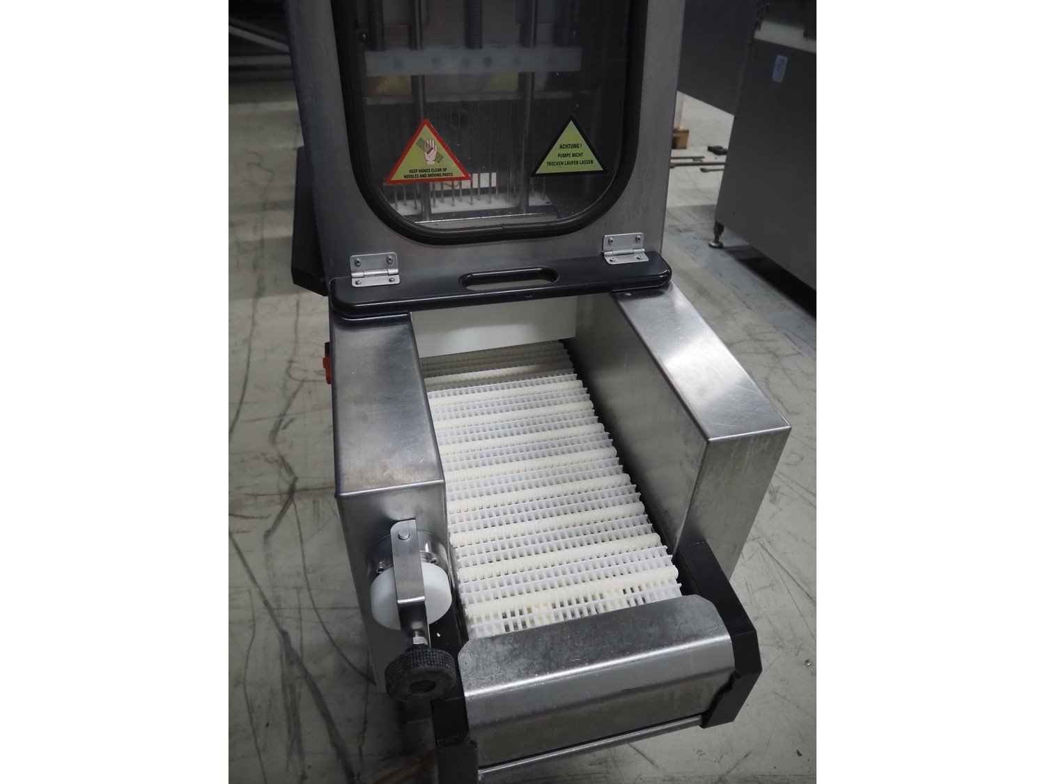 Günther injector, plastic mesh belt, belt width: 250 mm, 17 needles, clearance: 260 mm x 200 mm, total dimensions: 1300 mm x 470 mm x 1460 mm.