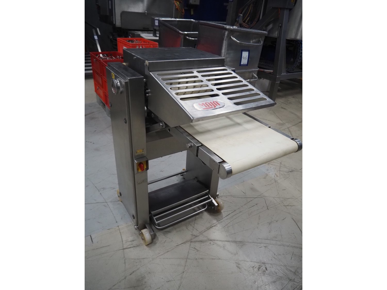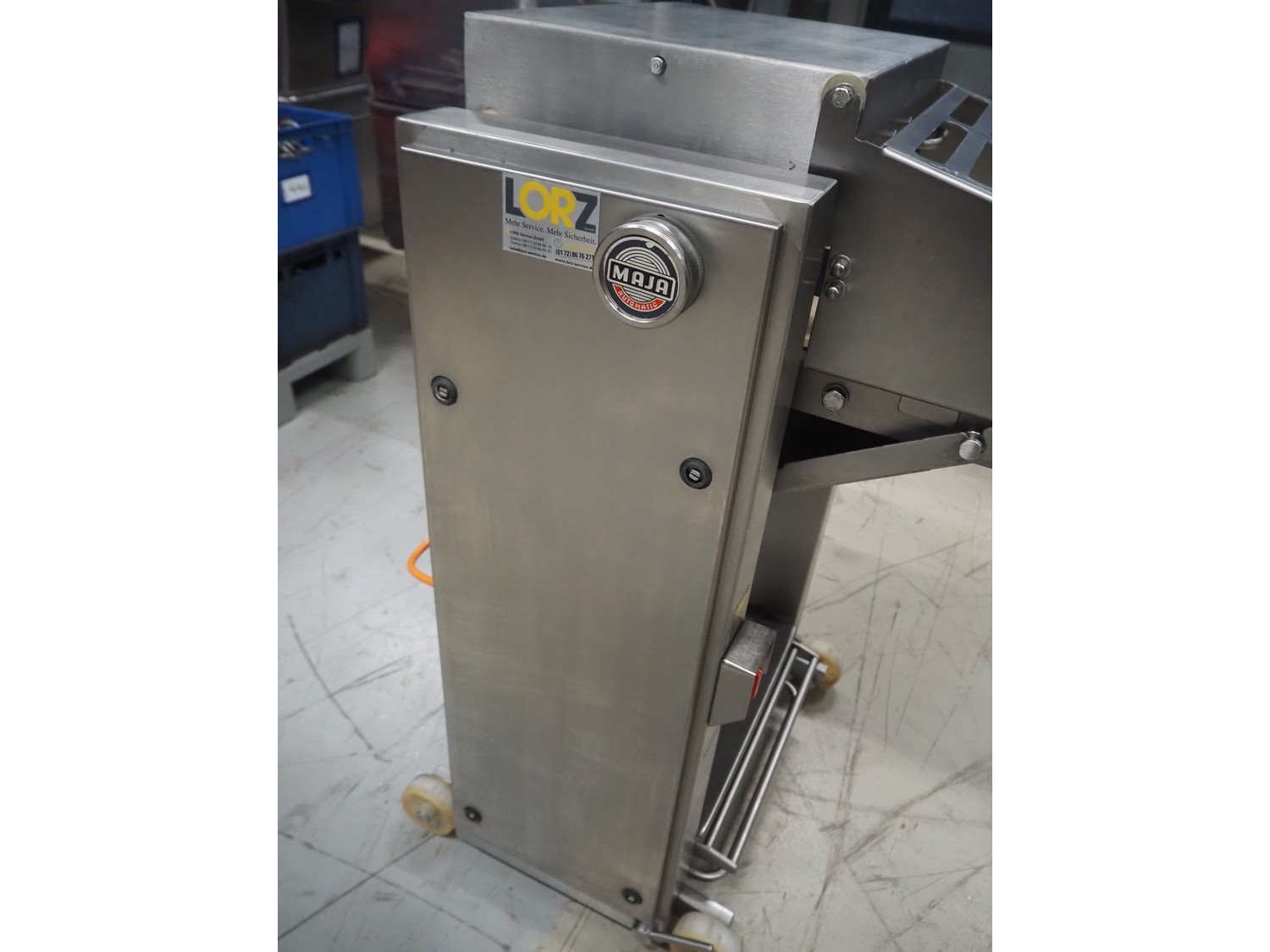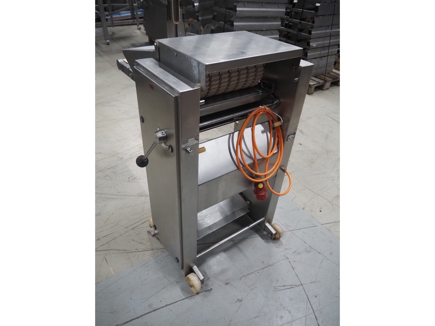 Maja Maschinenfabrik mobile skinning and derinding machine, type: ESB 441 H, number: 38228, year of construction: 1995, 380 V, 3 Ph, 50 Hz, 2.2 A, 0.75 kW, plastic belt, belt width: 370 mm, working width: 400 mm, total dimensions: 950 mm x 850 mm x 1150 mm.