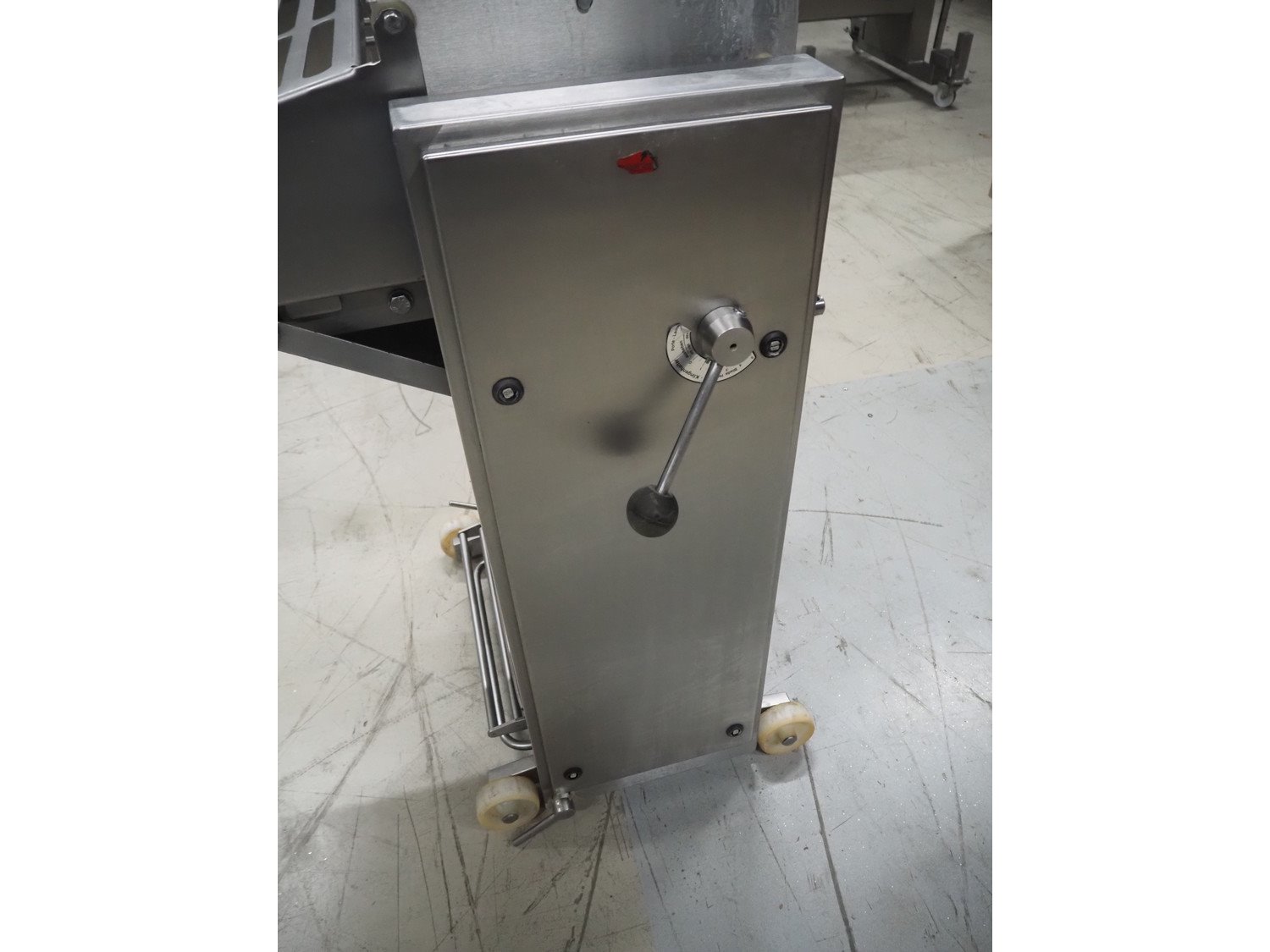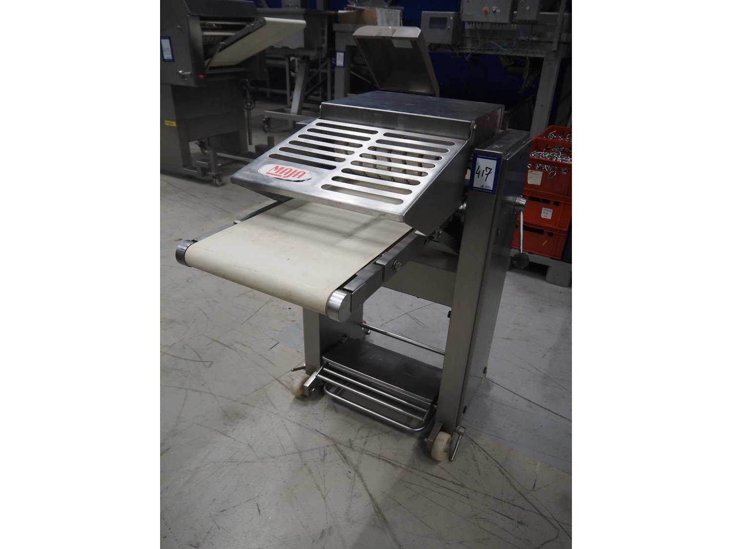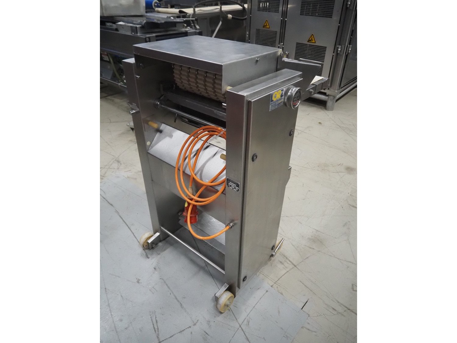 Maja Maschinenfabrik mobile skinning and derinding machine, type: ESB 441 H, number: 38228, year of construction: 1995, 380 V, 3 Ph, 50 Hz, 2.2 A, 0.75 kW, plastic belt, belt width: 370 mm, working width: 400 mm, total dimensions: 950 mm x 850 mm x 1150 mm.