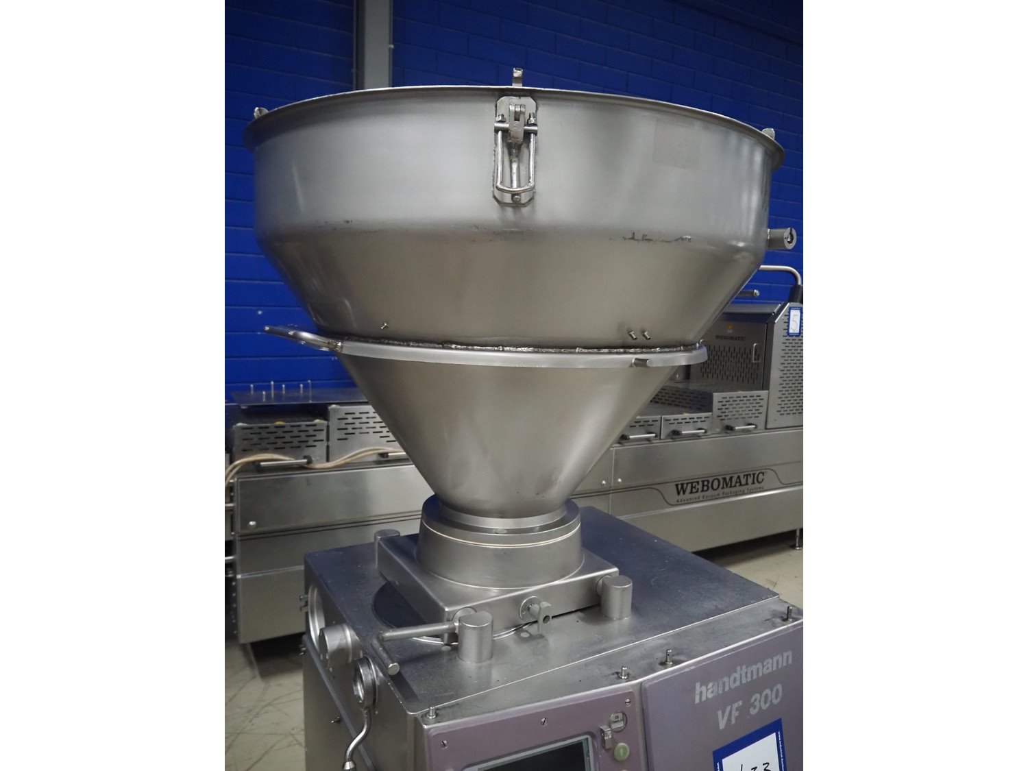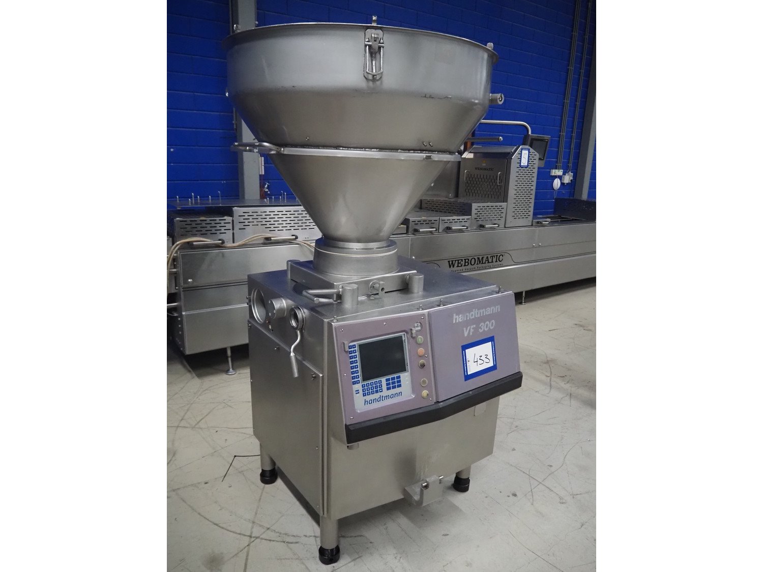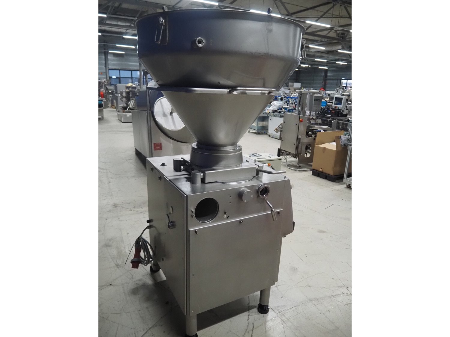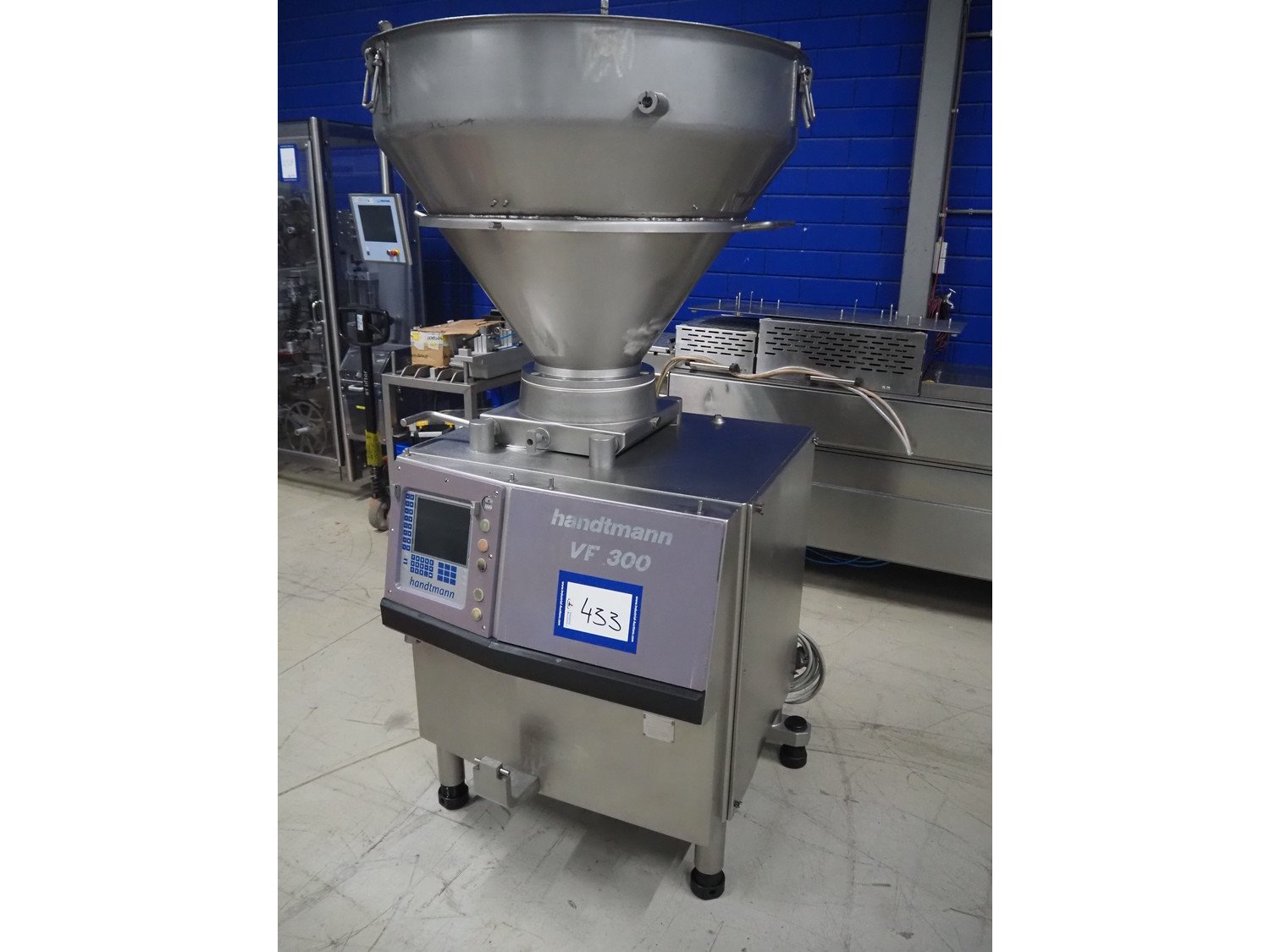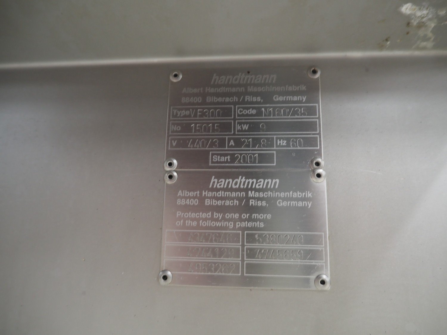 Handtmann vacuum filling machine, type: VF300, number: 15015, year of construction: 2001, 440 V, 3 Ph, 60 Hz, 21.8 A, 9 kW, dimensions: 950 mm x 920 mm x 2020 mm.