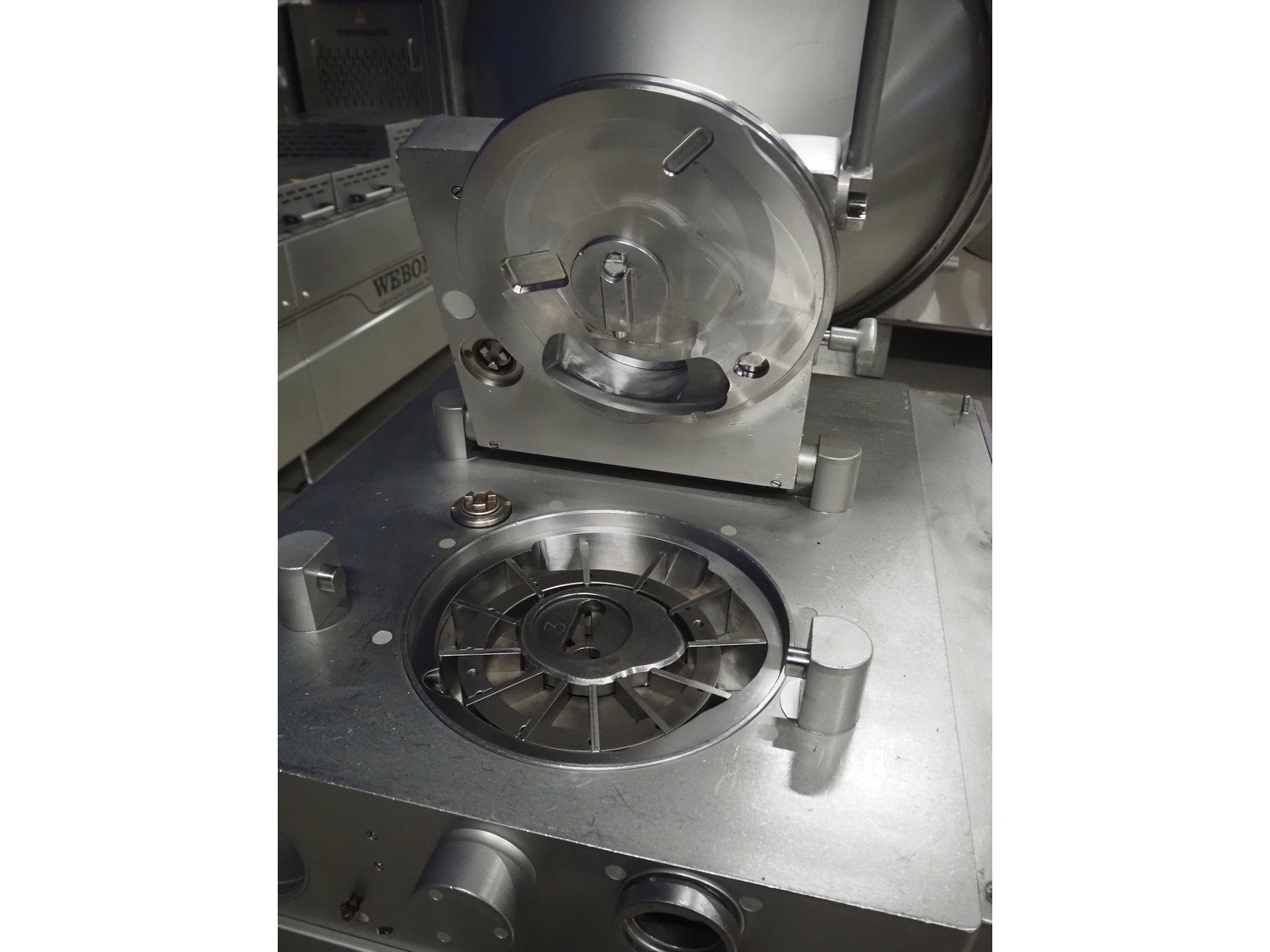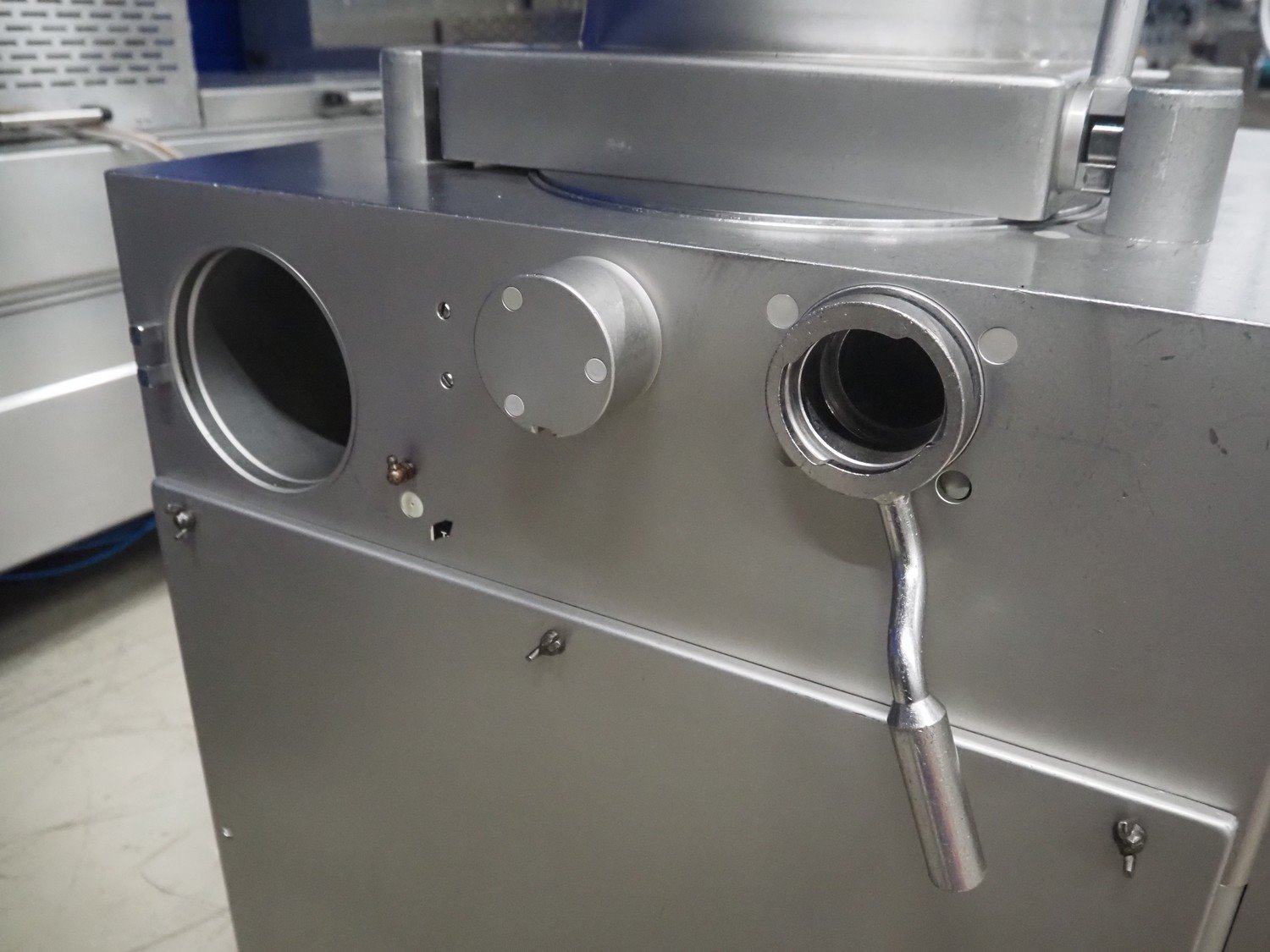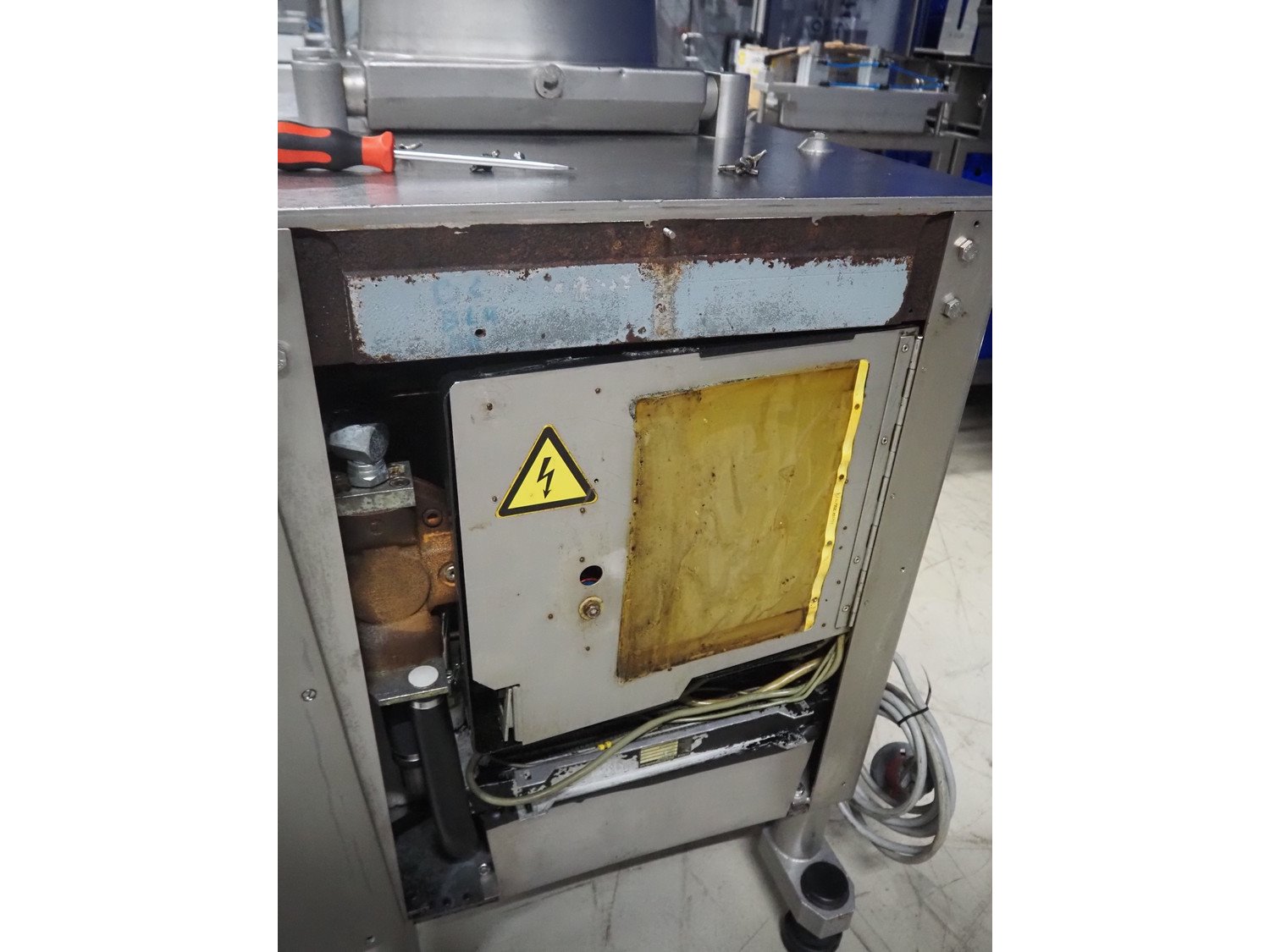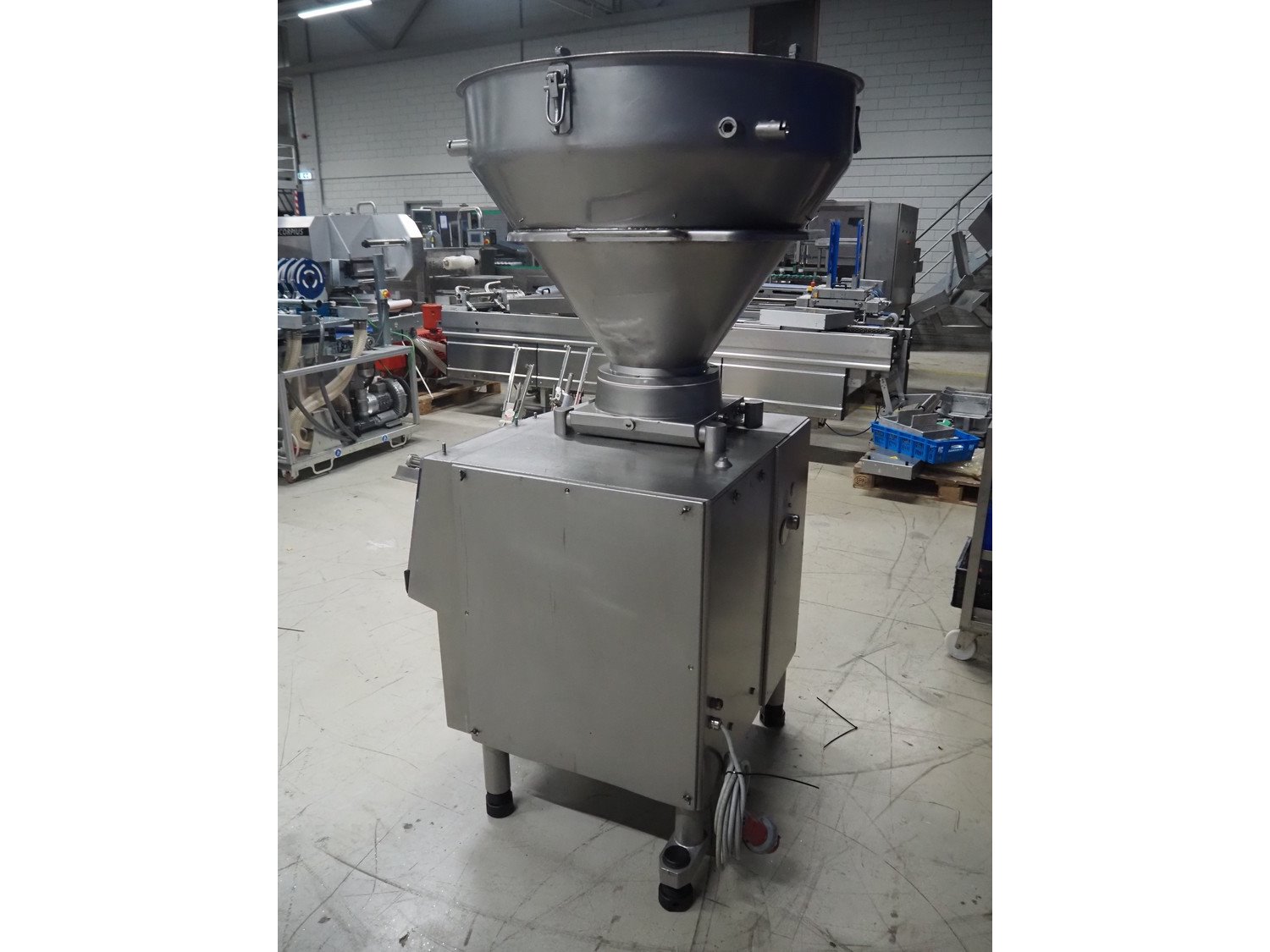 Handtmann vacuum filling machine, type: VF300, number: 15015, year of construction: 2001, 440 V, 3 Ph, 60 Hz, 21.8 A, 9 kW, dimensions: 950 mm x 920 mm x 2020 mm.