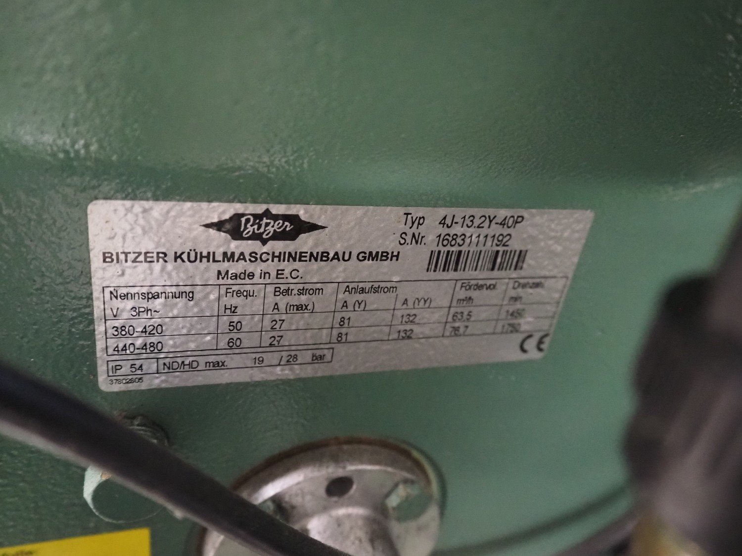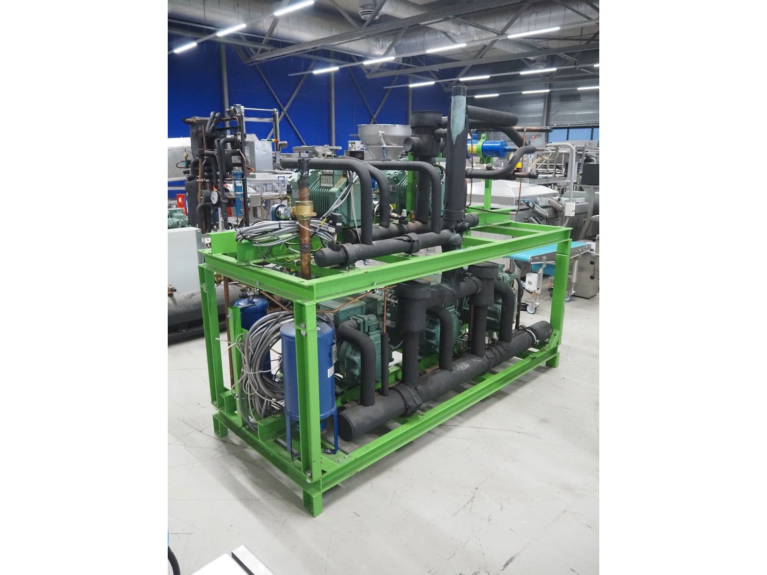 Fri-Jado compressor rack with 5 Bitzer Kühlmaschinenbau GmbH colling compressors, type: 4DC-5.2Y-40S, 4DES-5Y-40S, (2x) 4J-13.2Y-40P, 4G-30.2Y-40P, capacity: (2x) 26.8/32.4, (2x) 63.5/76.7, 84.6/102.1 m³ per hour, dimensions: 2200 mm x 910 mm x 1730 mm.