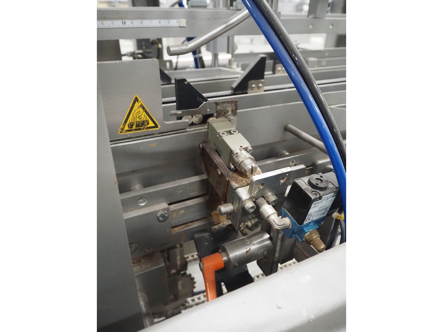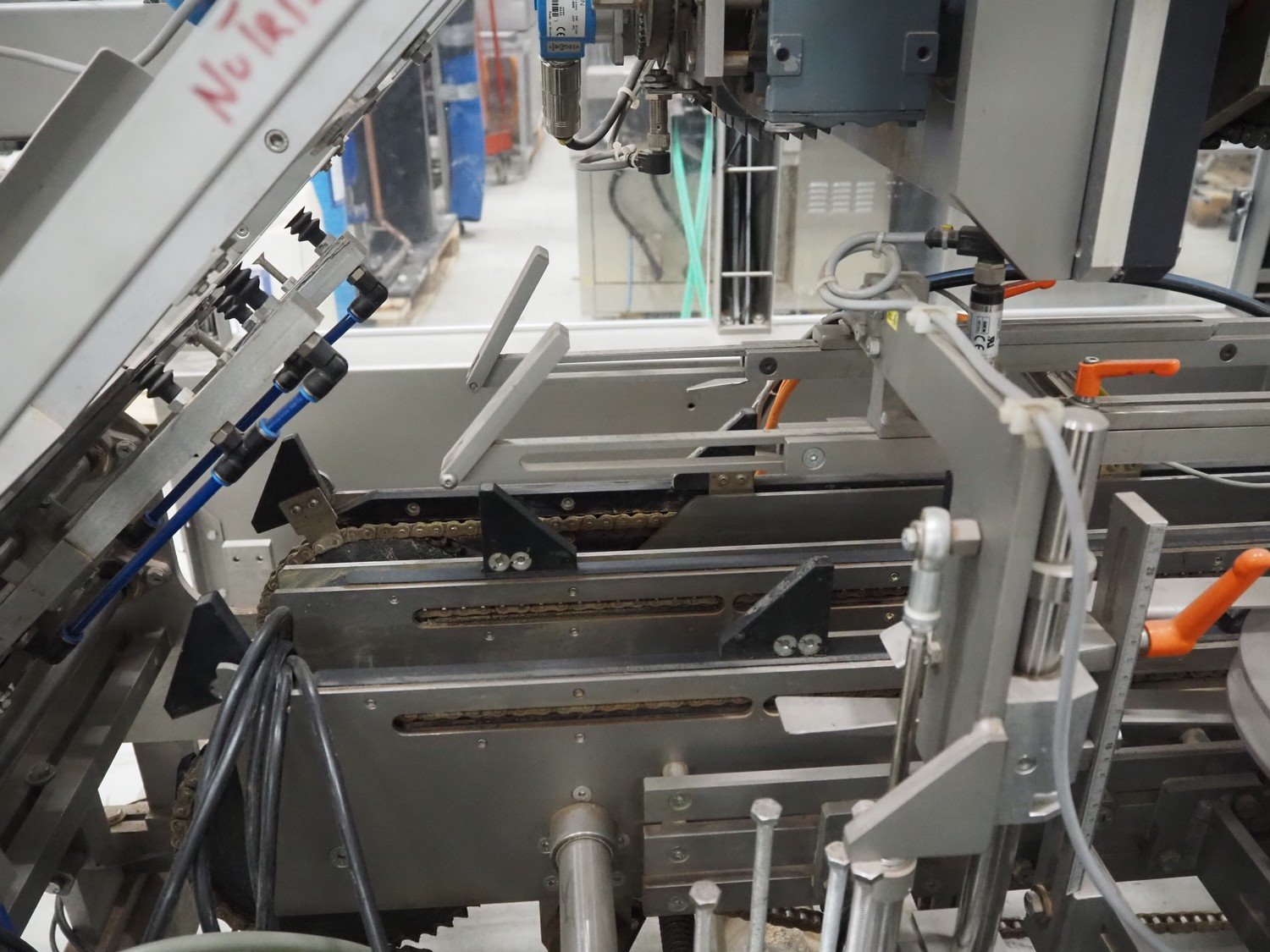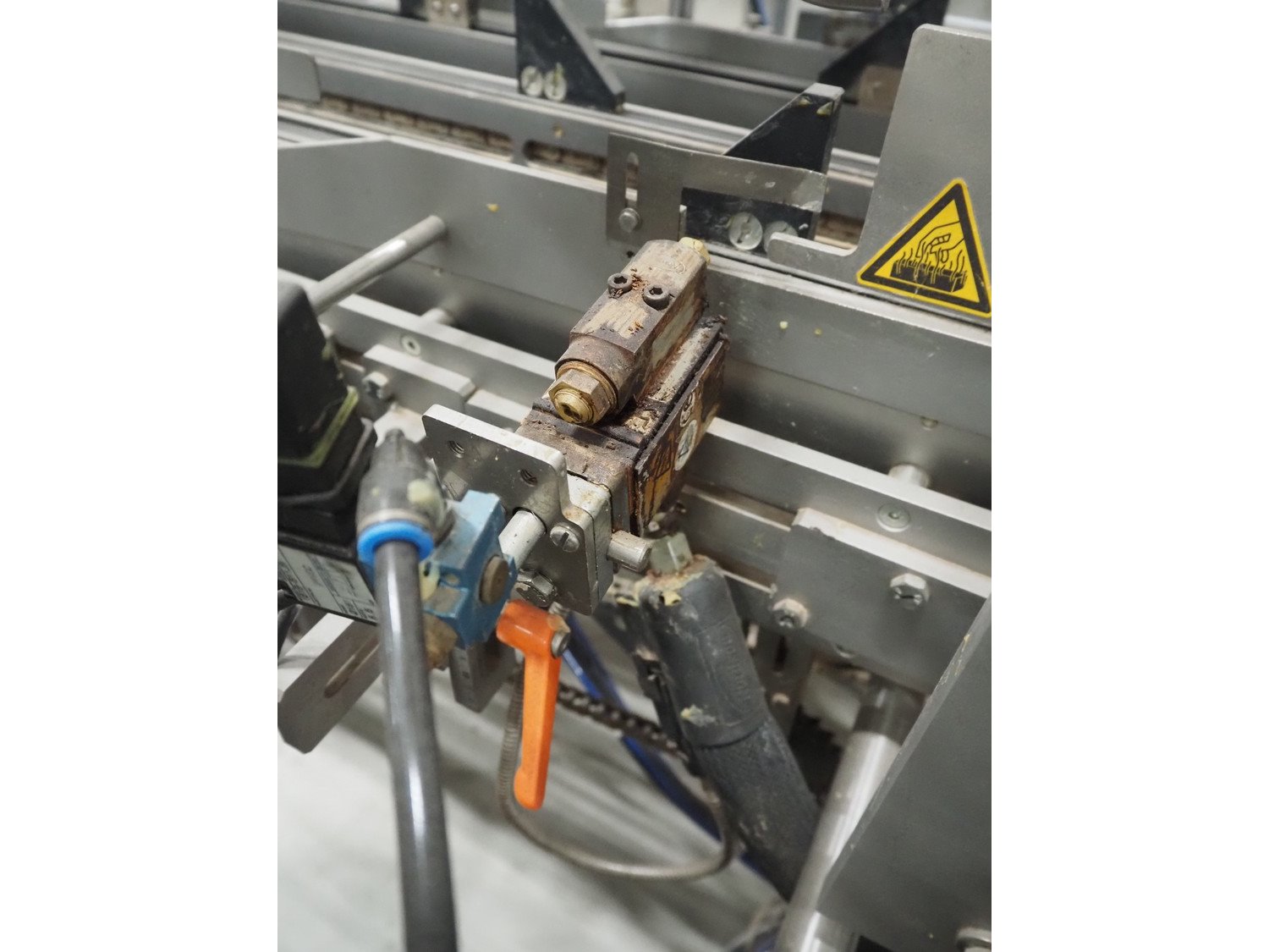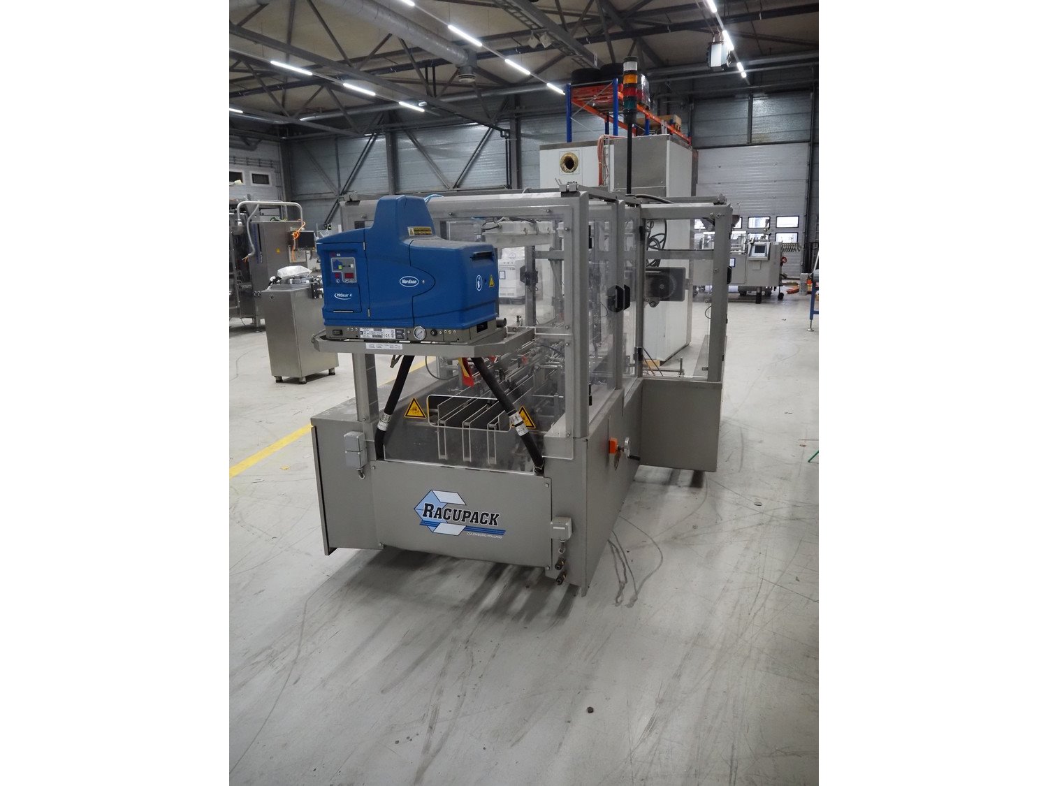 Racupack case packer, type: RTI-Catamaran, serial number: 0405335, year of construction: 2005, 400 V, 3 Ph, 50 Hz, 20 A, 1800 kg, Nordson glue unit, plastic infeed belt, belt width: 300 mm, clearance: 280 mm x 160 mm, chain conveyor with dividers, distance between dividers: 240 mm, divider height: 60 mm, total dimensions: 4650 mm x 1800 mm x 2450 mm.