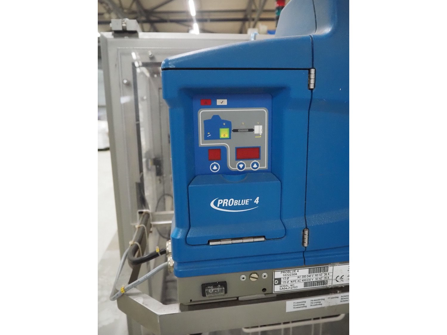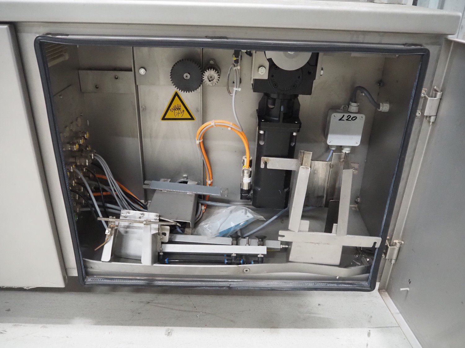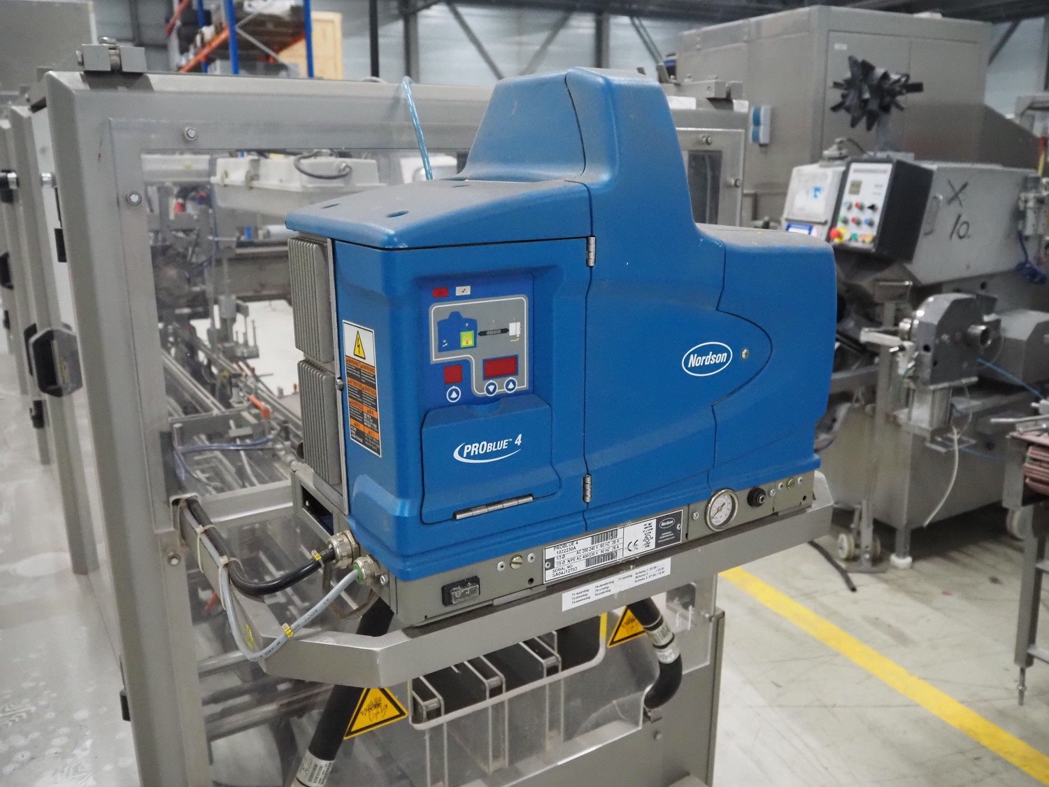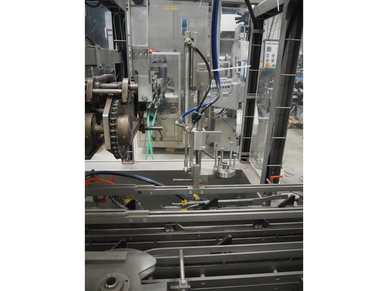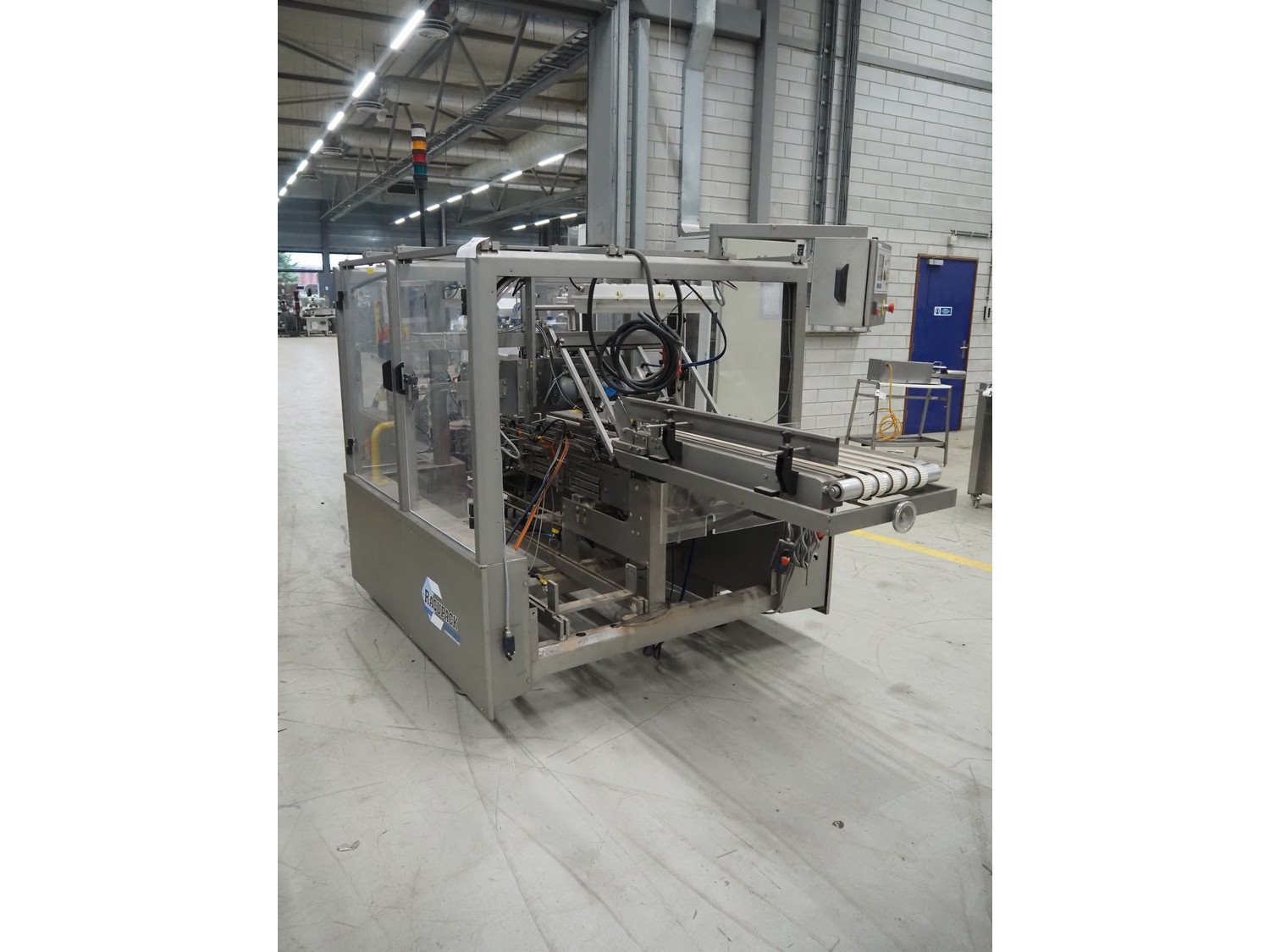 Racupack case packer, type: RTI-Catamaran, serial number: 0405335, year of construction: 2005, 400 V, 3 Ph, 50 Hz, 20 A, 1800 kg, Nordson glue unit, plastic infeed belt, belt width: 300 mm, clearance: 280 mm x 160 mm, chain conveyor with dividers, distance between dividers: 240 mm, divider height: 60 mm, total dimensions: 4650 mm x 1800 mm x 2450 mm.