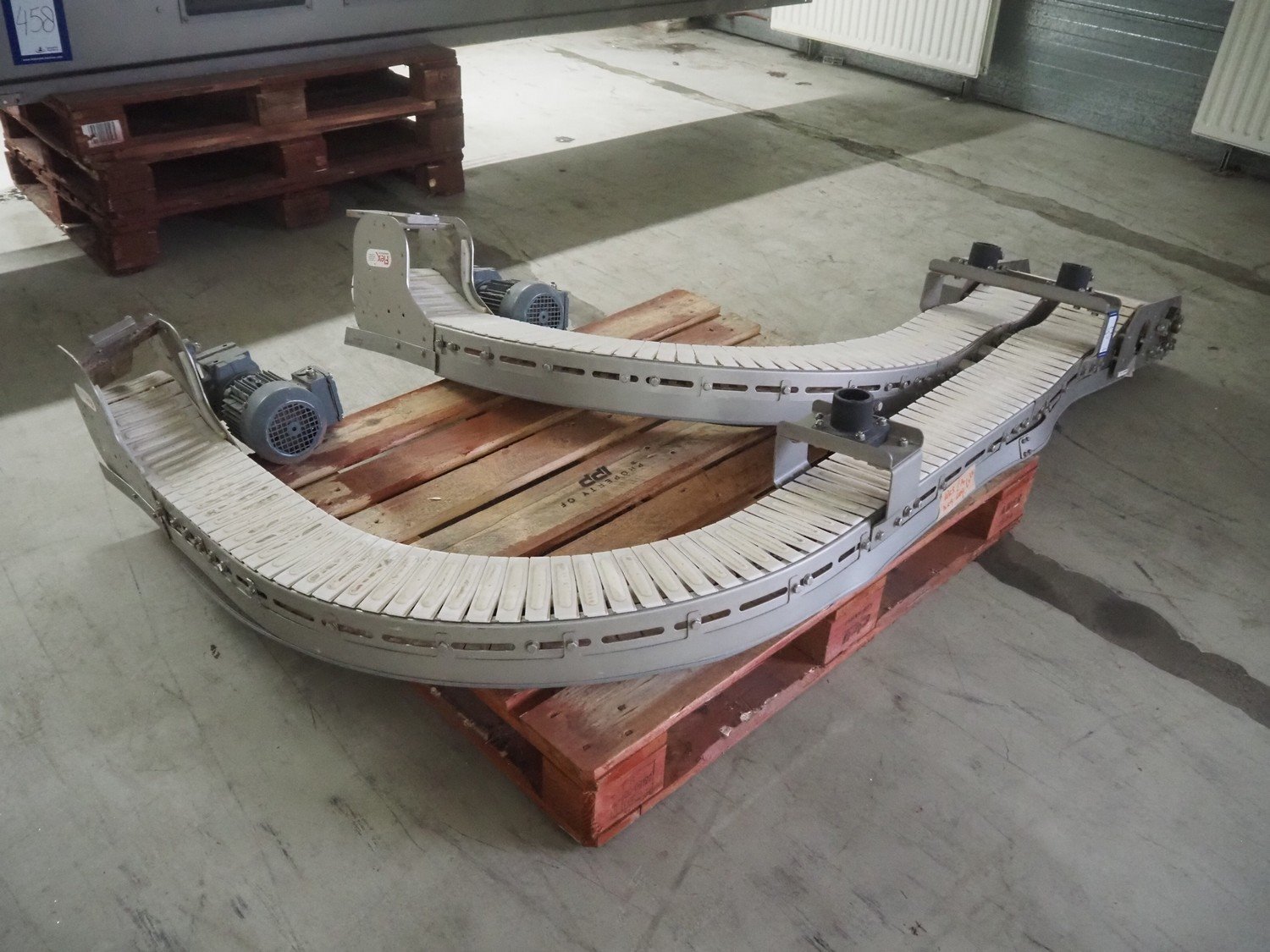Flex Industries BV double lane 90° curve conveyor, s/s frame, plastic belts, belt width: (2x) 155 mm, total dimensions: 2300 mm x 1500 mm x 500 mm.