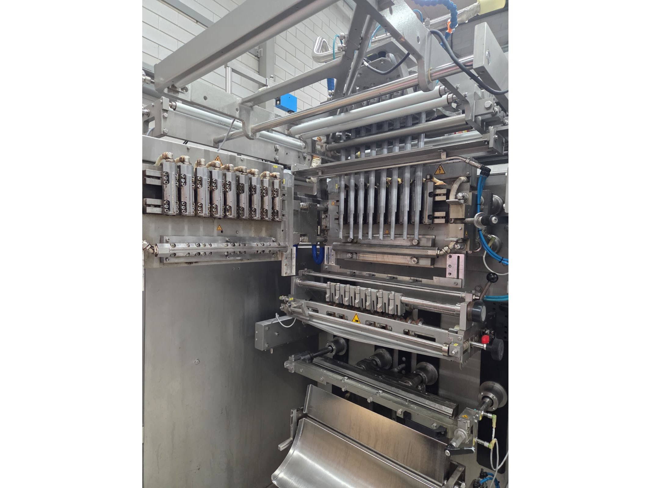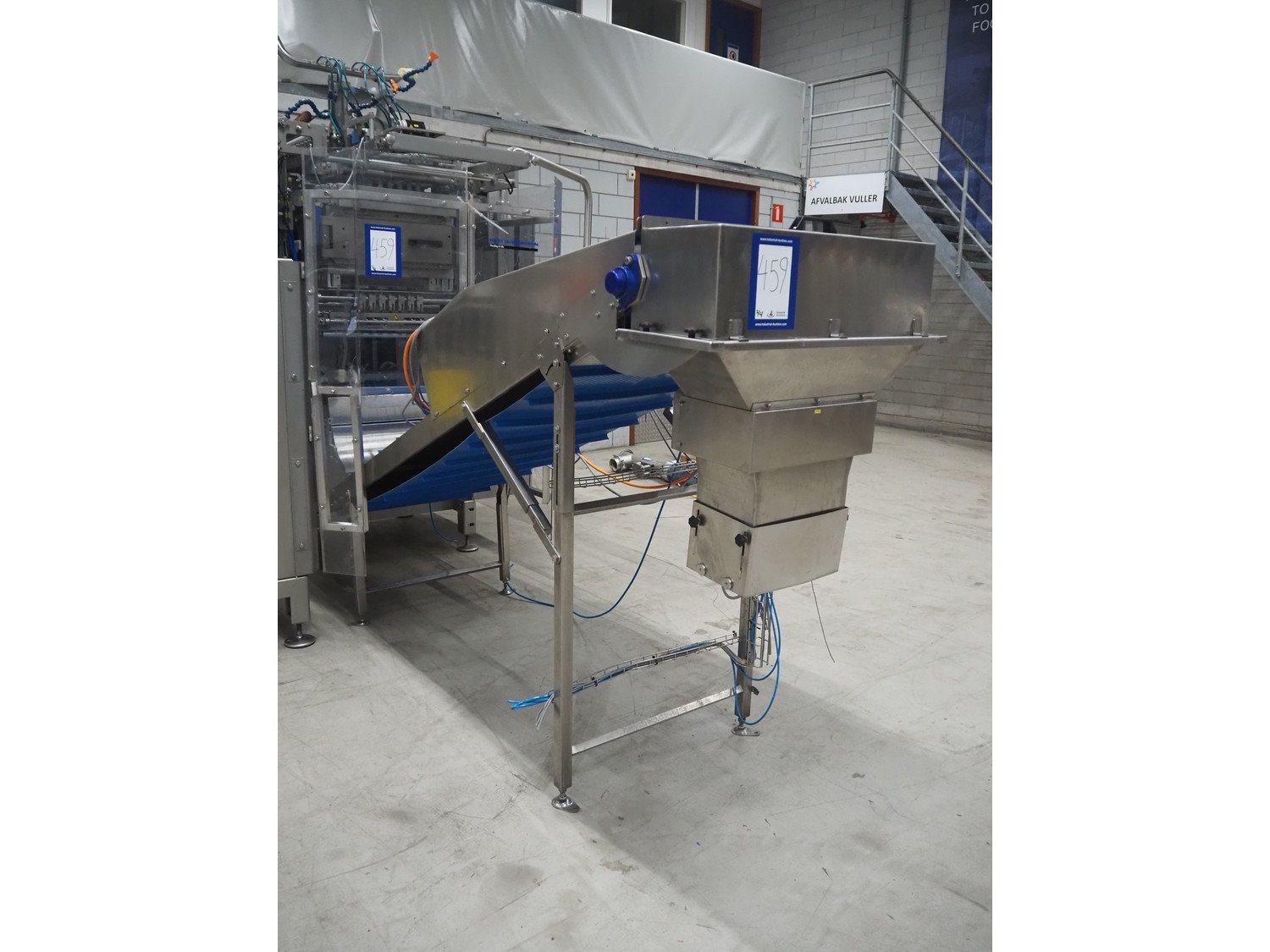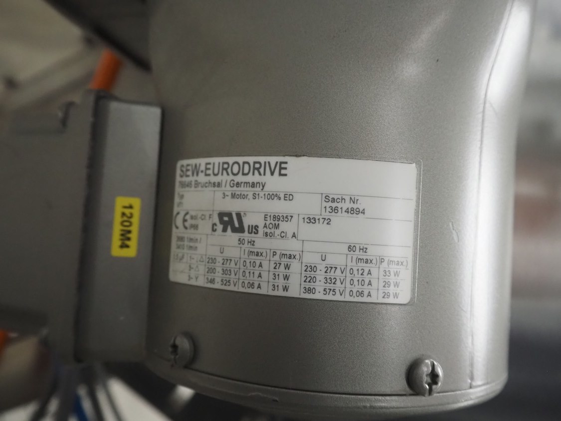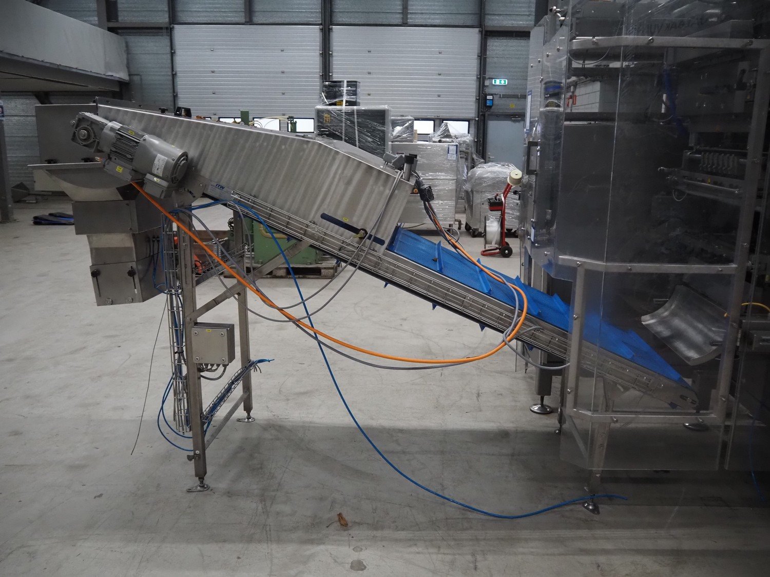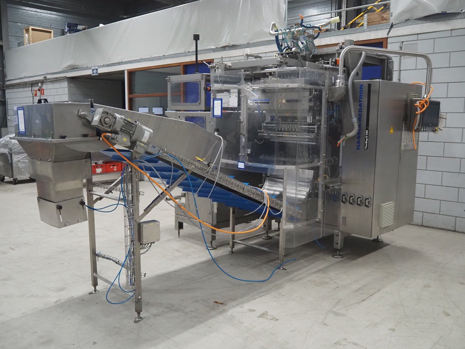 Hassia-Redatron GmbH 4-side sealing sached machine, type: FB SI 500, machine number: 155960 mm, year of construction: 2019, 400 V, 3 Ph, 50/60 Hz, 50 A, 19 kVA, format width: maximum 500 mm, draw-off lenght: maximum 200 mm, film width: maximum 1000 mm, vertical seal length: (9x) 115 mm, horizontal seal width: 430 mm and 630 mm , total dimensions: 2750 mm x 2100 mm x 2700 mm. Including ITW outfeed elevating belt, s/s frame, type: TBGK-N700, serial number: 20-171K, year of construction: 2019, weight: 135 kg, plastic belt with dividers, belt width: 730 mm, divider height: 30 mm, distance between dividers: 205 mm, elevating height: 1600 mm, total dimensions outfeed belt: 2850 mm x 1000 mm x 1610 mm and pallet with infeed station. Infeed station is damaged.